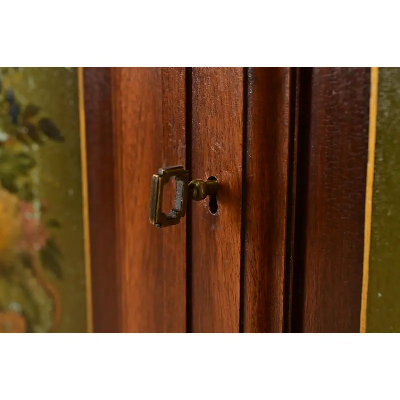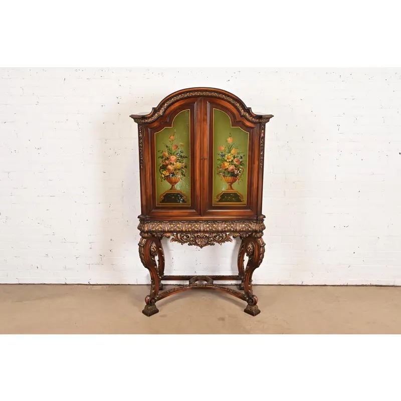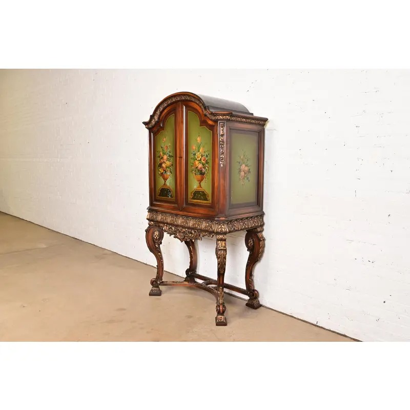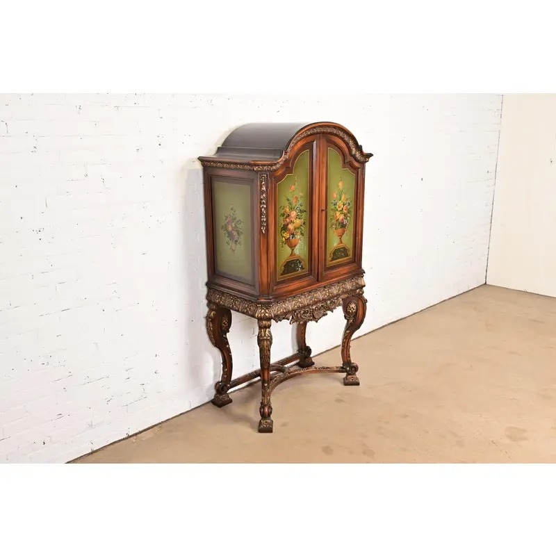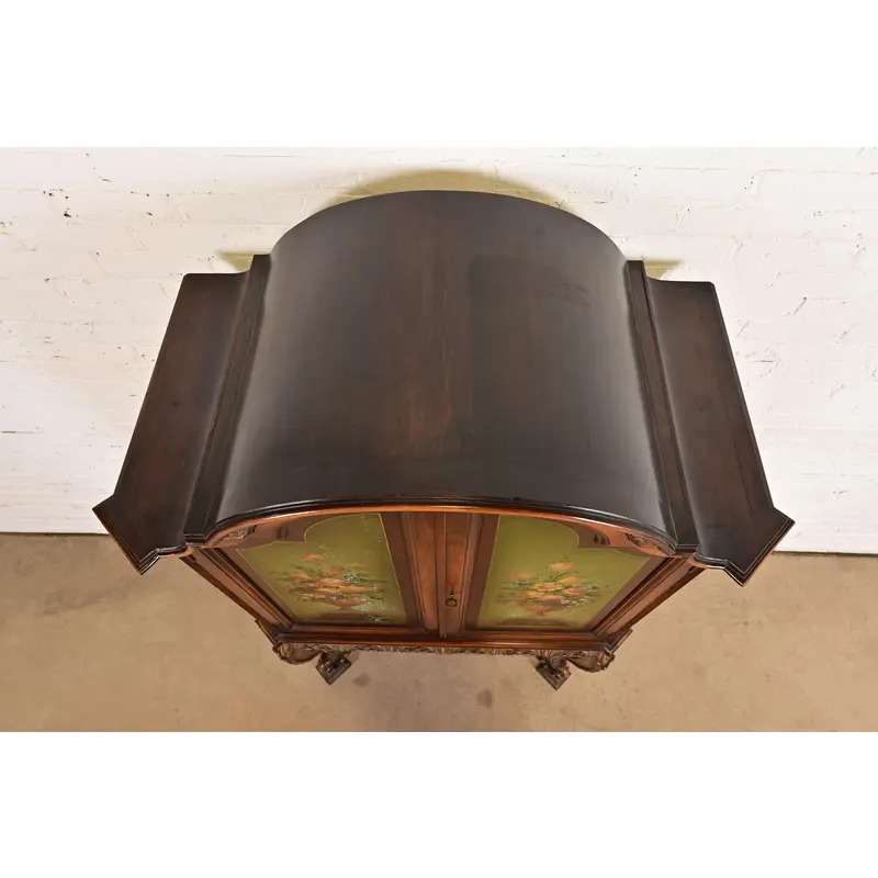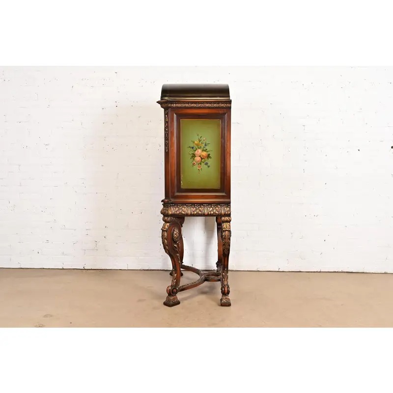 Carved walnut, with hand painted floral front and sides. Interior shelves are adjustable.
