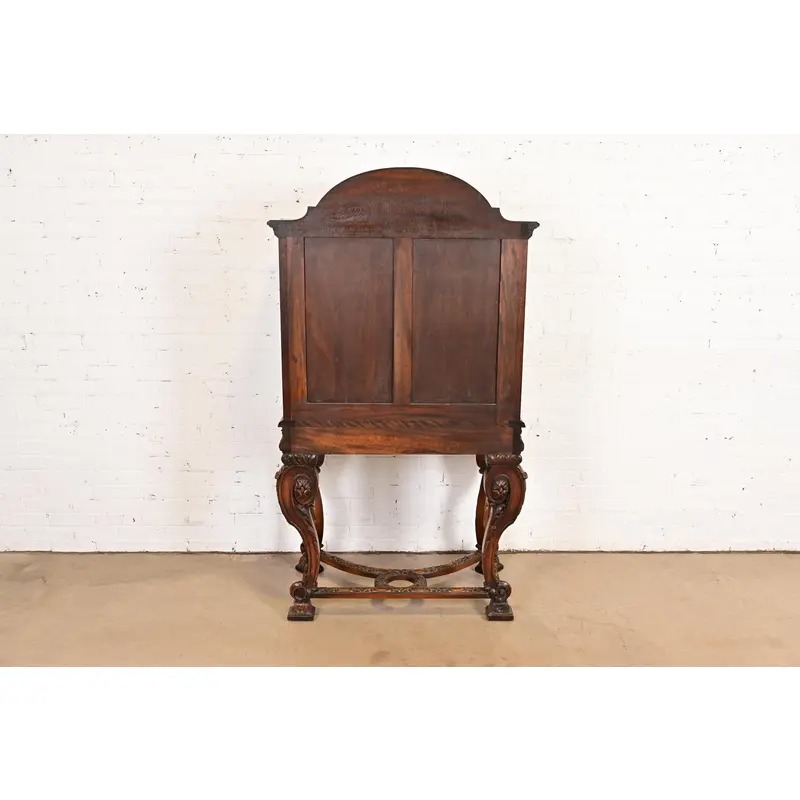 Berkey & Gay Style Antique English Jacobean Carved Walnut Hand Painted Bookcase or Bar Cabinet, Circa 1920s