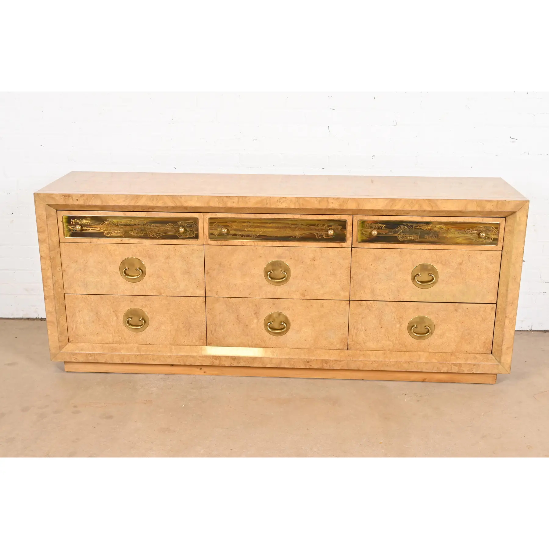 Burled Carpathian elm wood, with acid etched brass drawer fronts and original brass hardware.