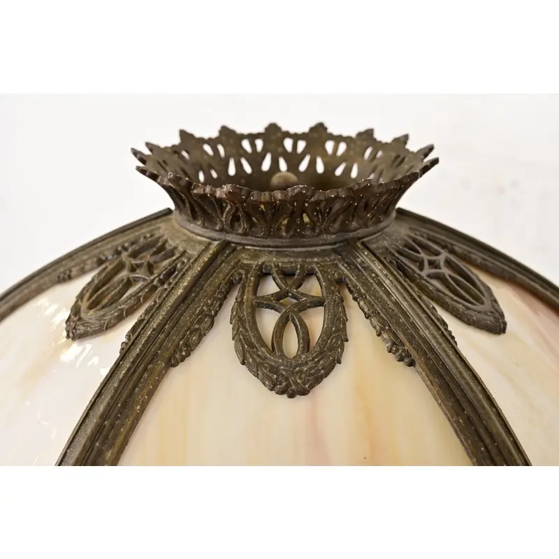 An exceptional antique Art Nouveau or Arts & Crafts period table lamp with gorgeous six-panel curved caramel slag glass shade