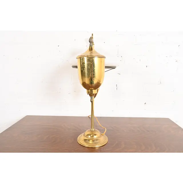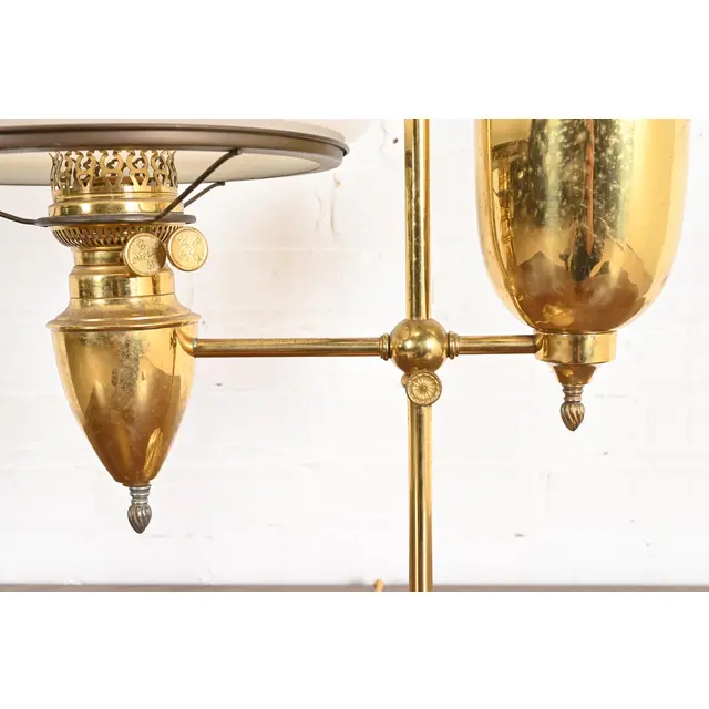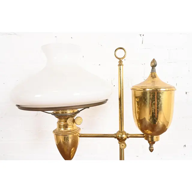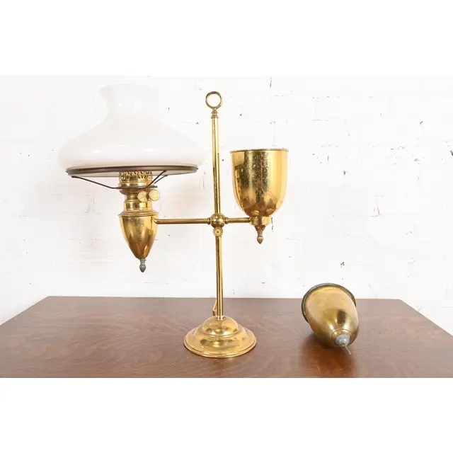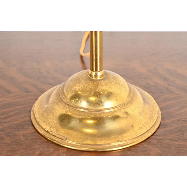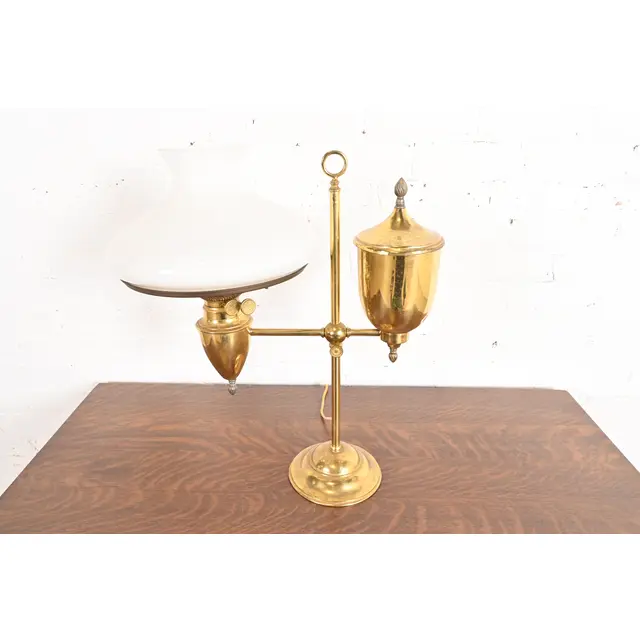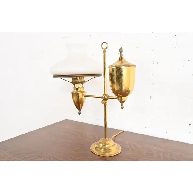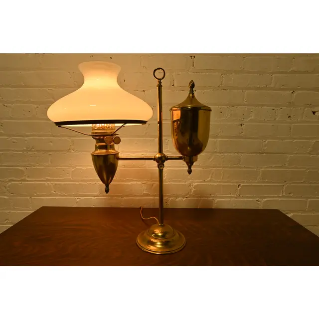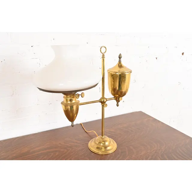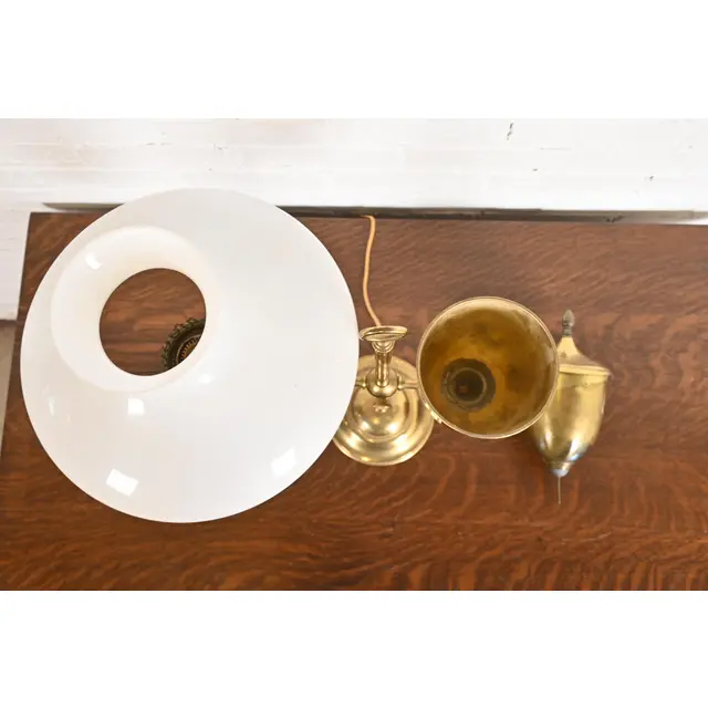 A gorgeous antique Arts and Crafts or Victorian brass student lamp or desk lamp with white glass shade