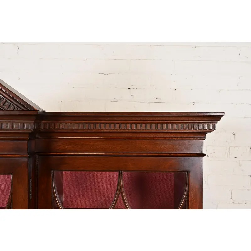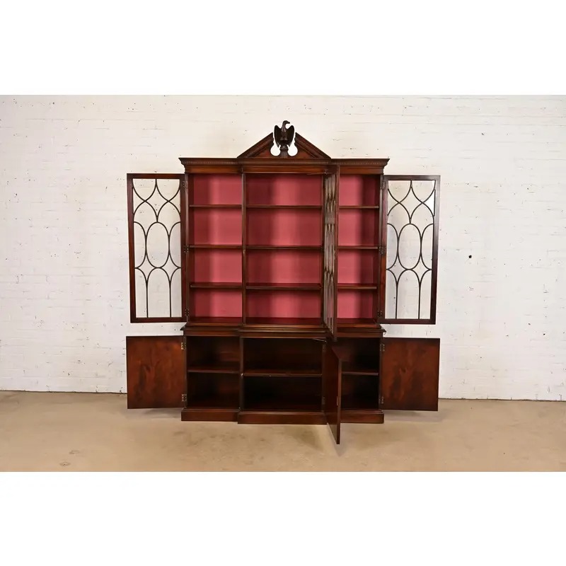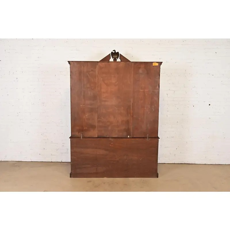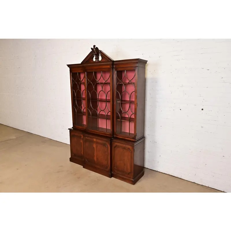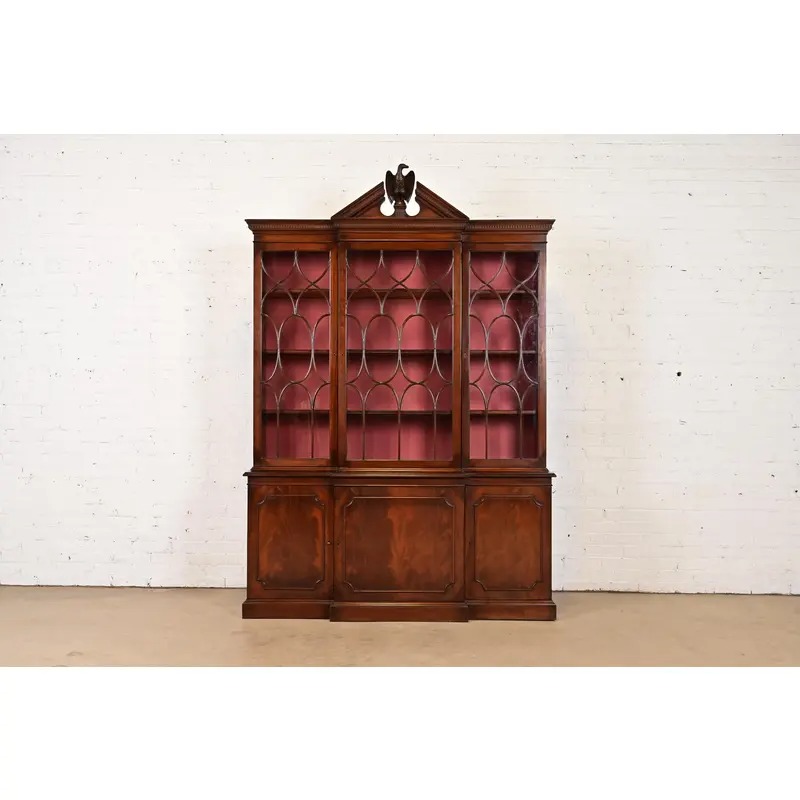 Gorgeous flame mahogany, with outstanding carved eagle finial, mullioned glass front doors, and original brass hardware. Shelves are adjustable and removable.