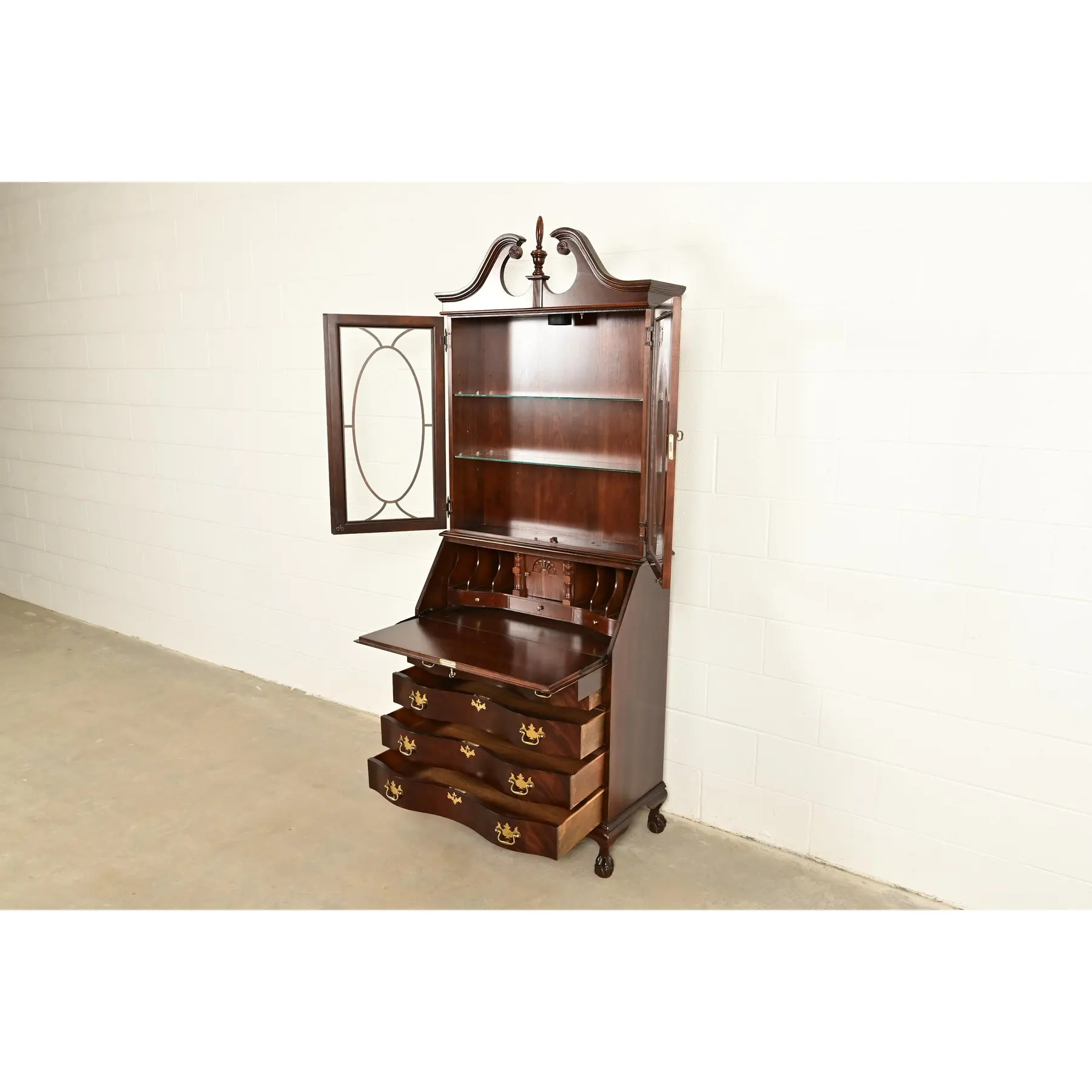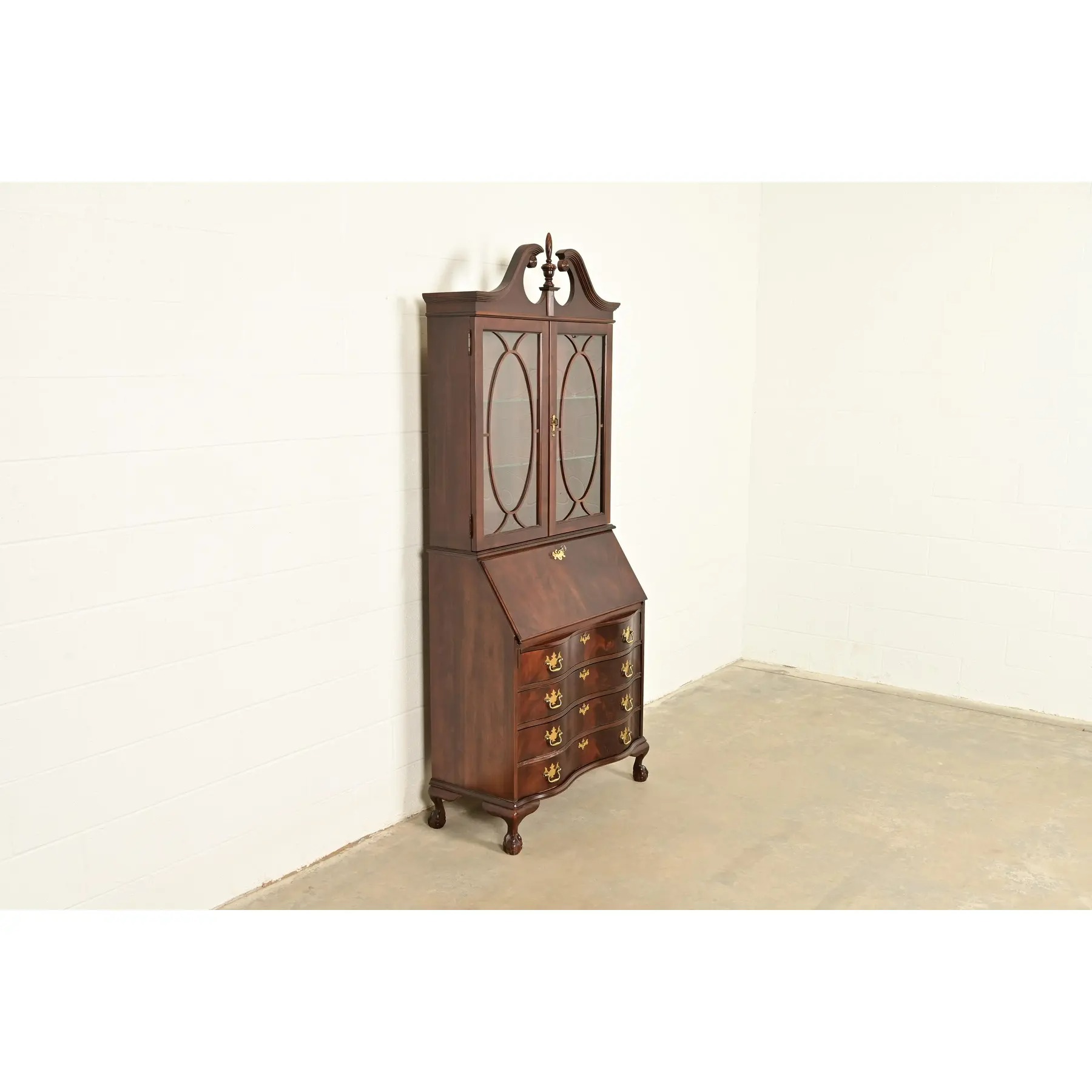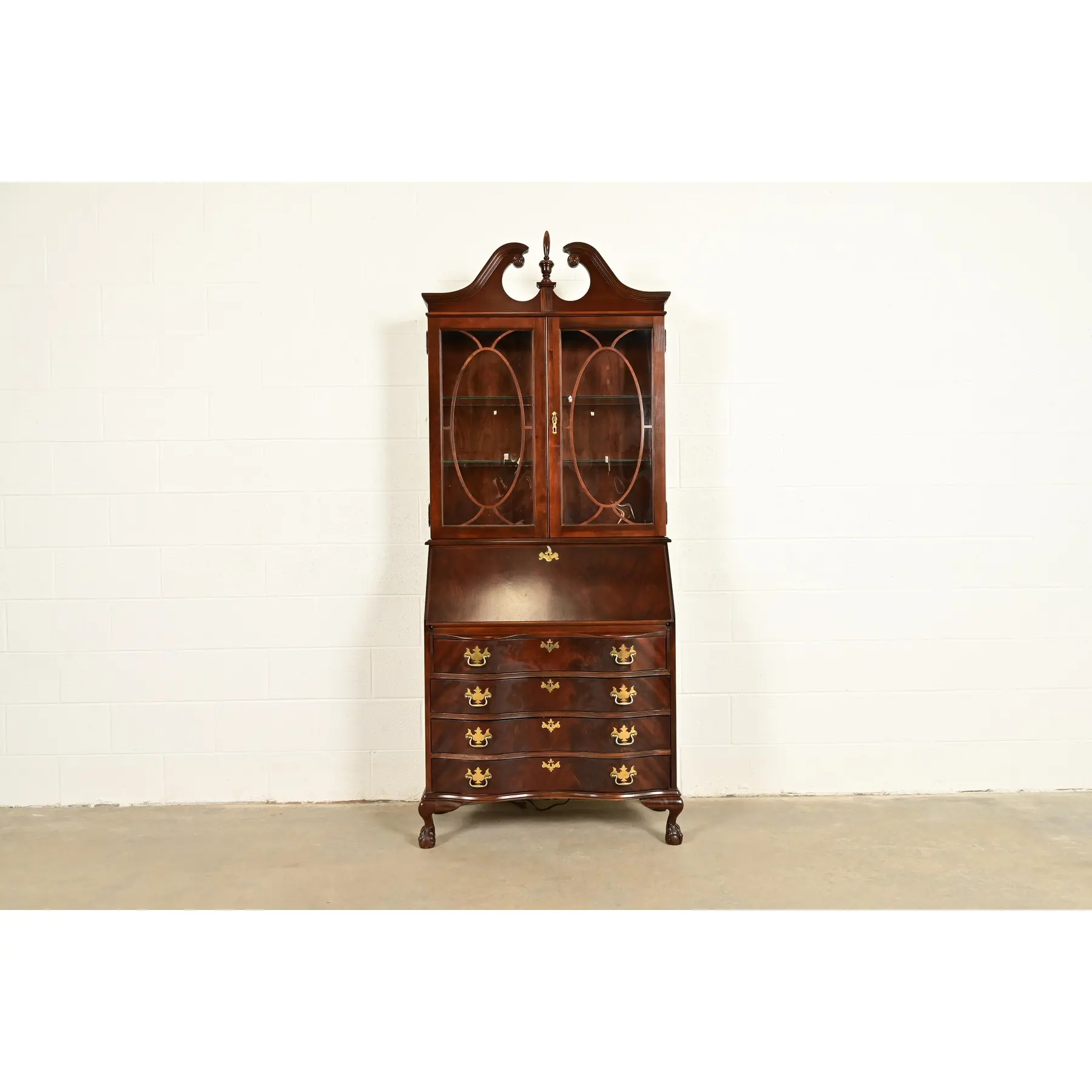 An outstanding Chippendale or Georgian style bureau with drop front secretary desk and lighted bookcase hutch top
