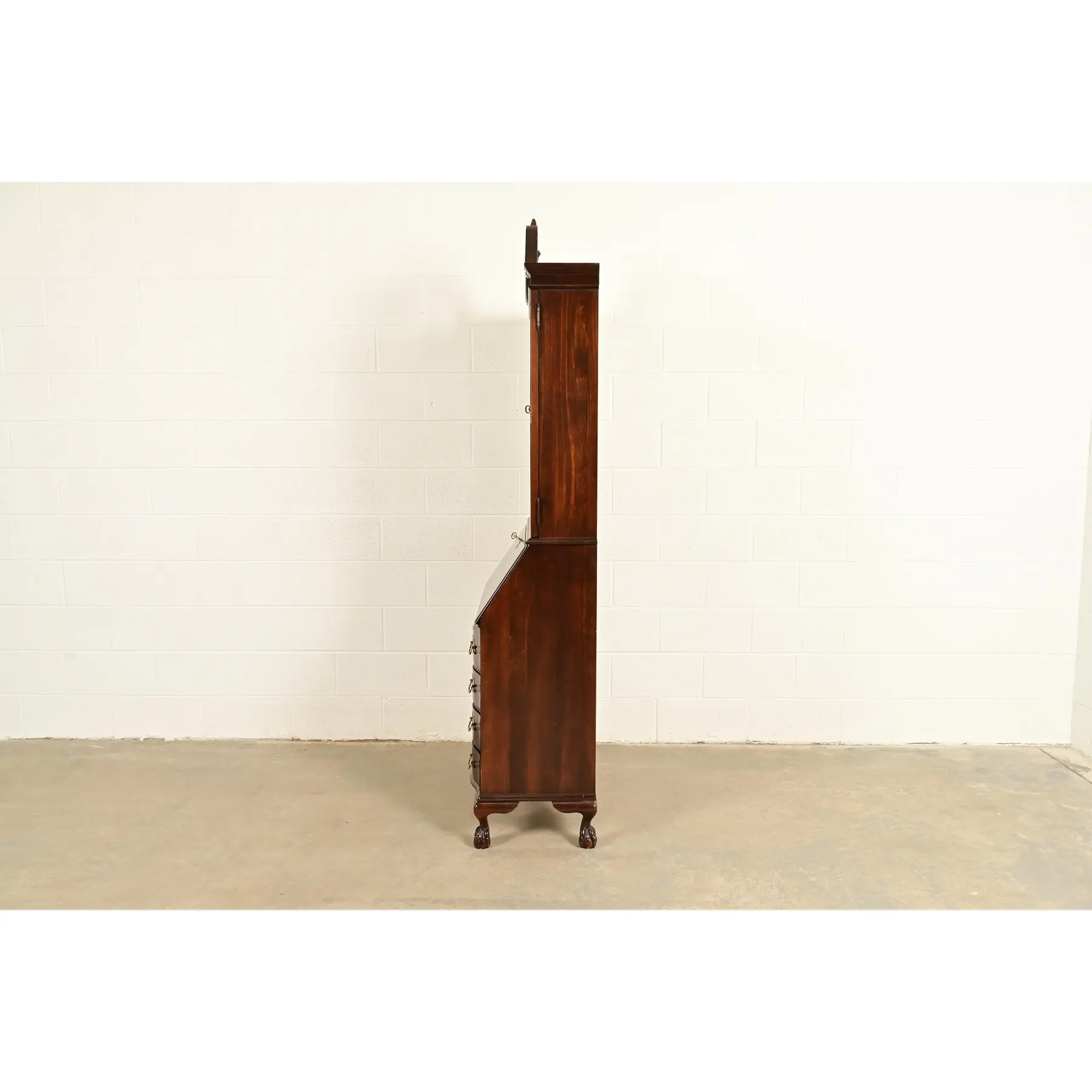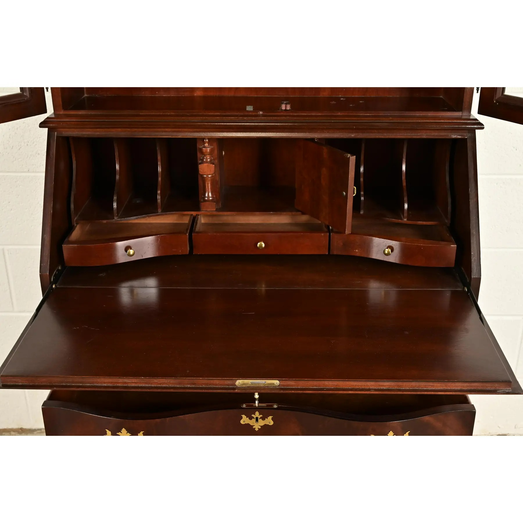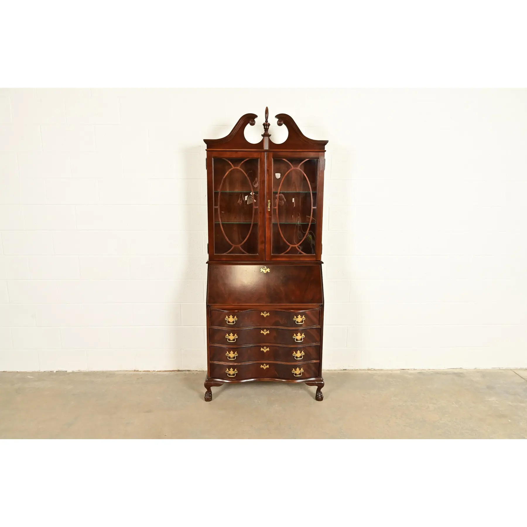 An outstanding Chippendale or Georgian style bureau with drop front secretary desk and lighted bookcase hutch top