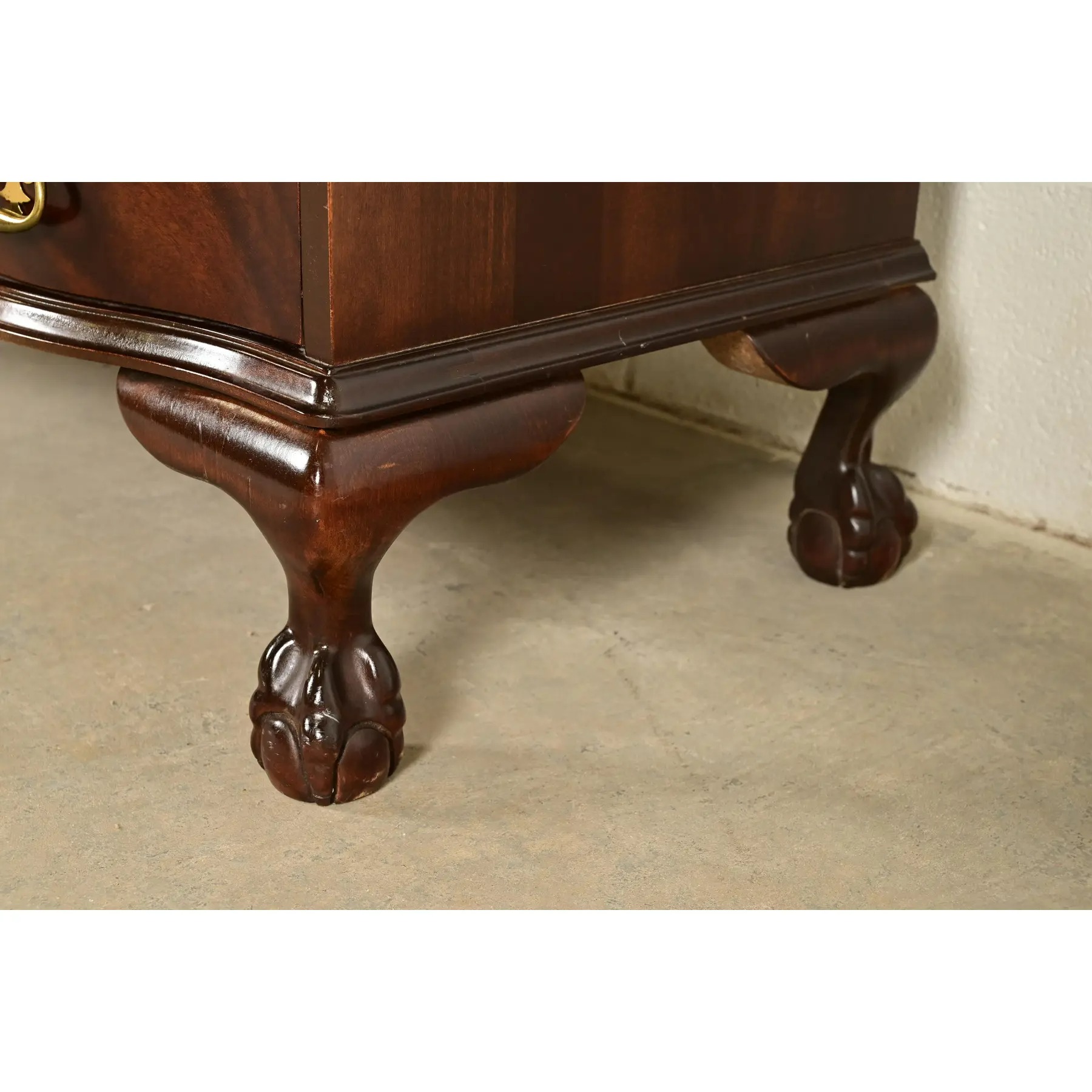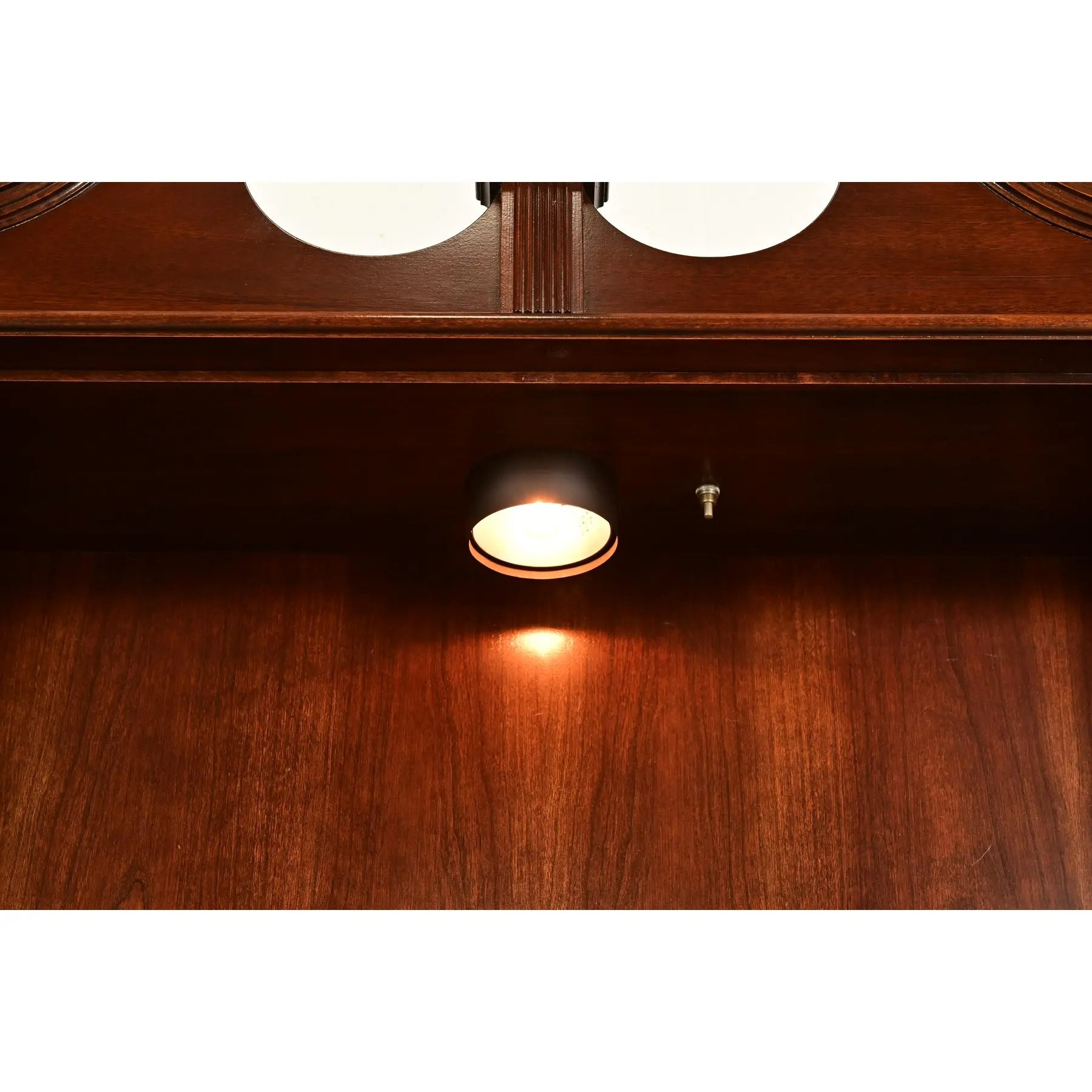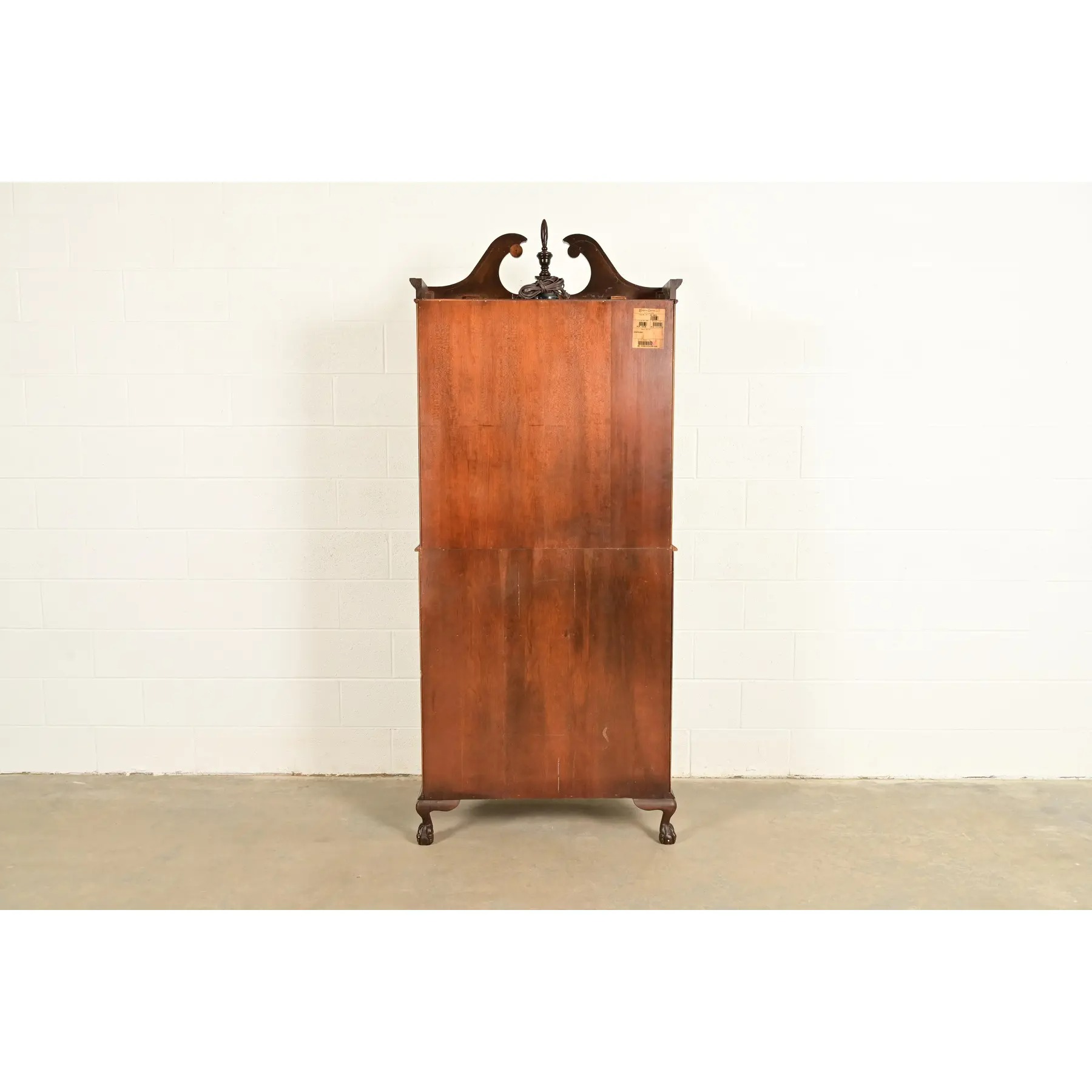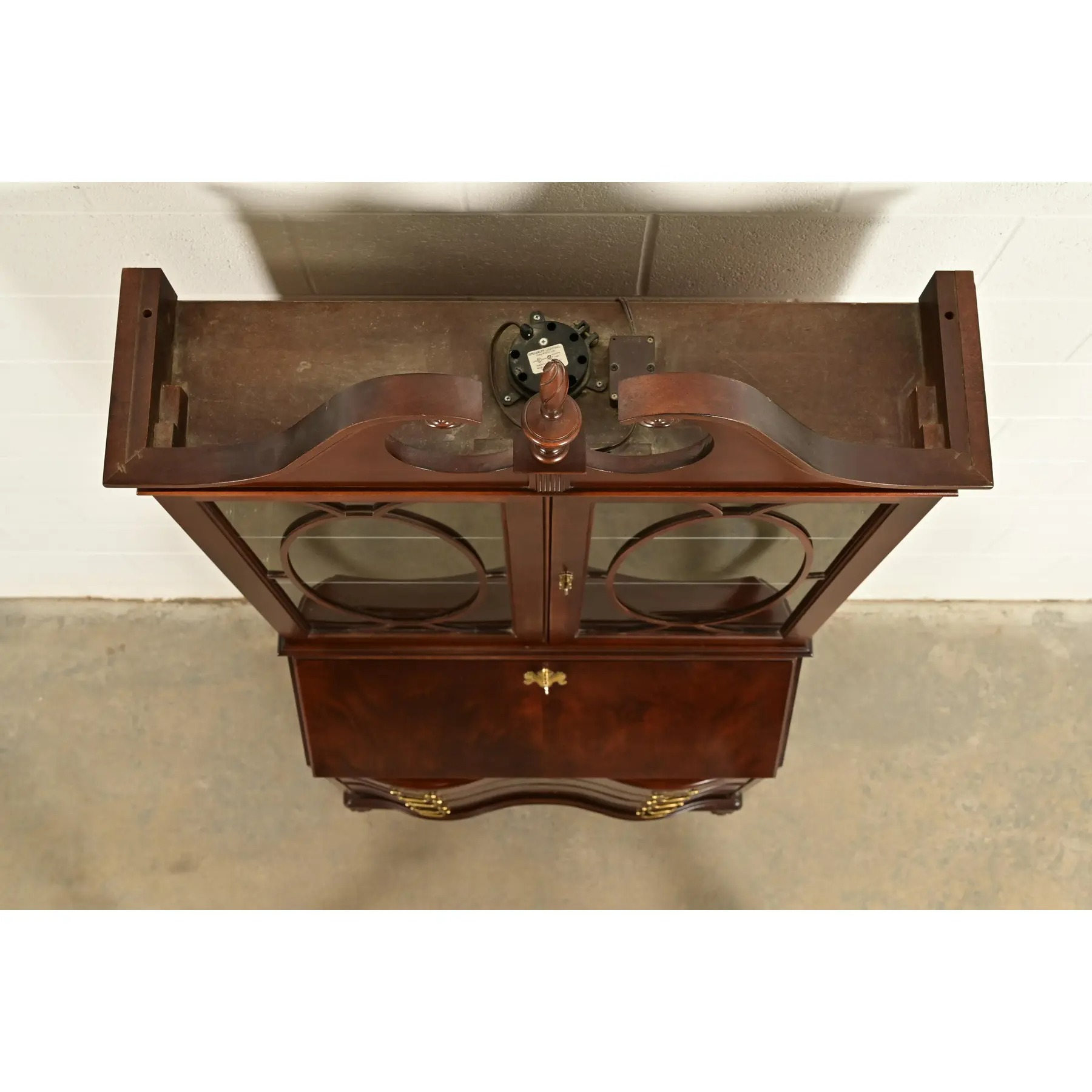 Gorgeous book-matched flame mahogany, with mullioned glass front doors, and original brass hardware.