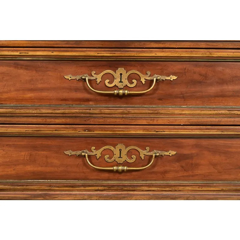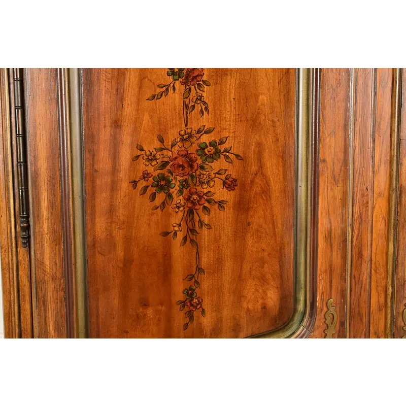 Carved walnut with shell motif, hand-painted floral accents, and original brass hardware.