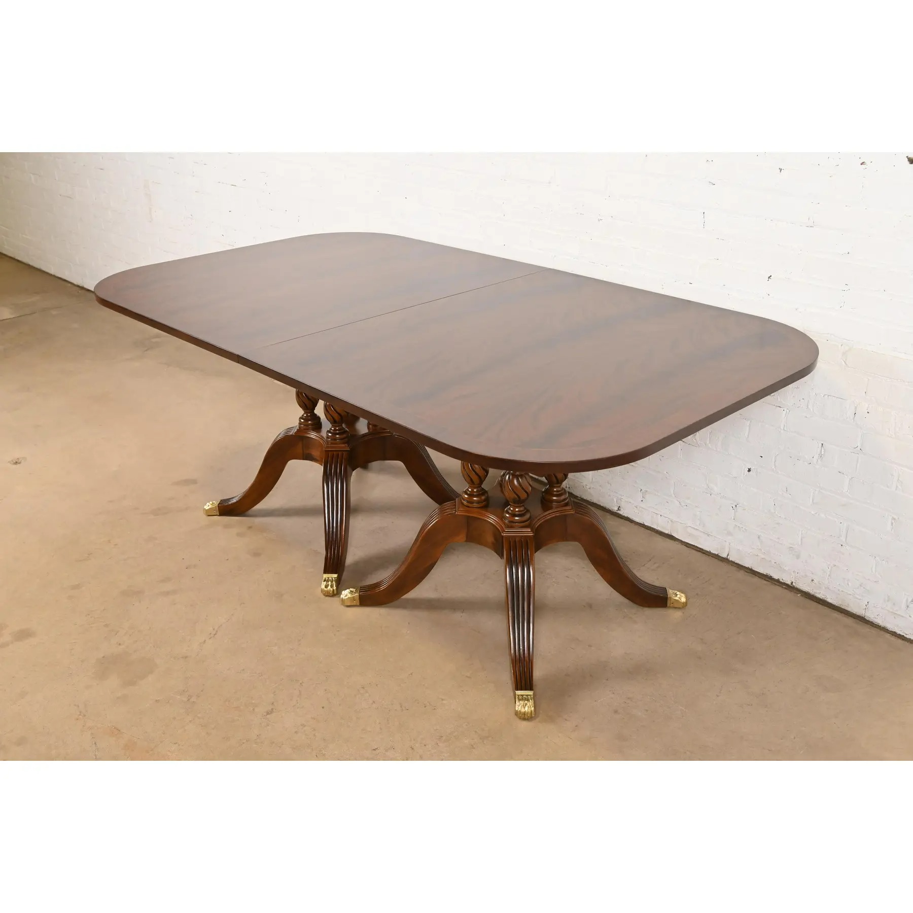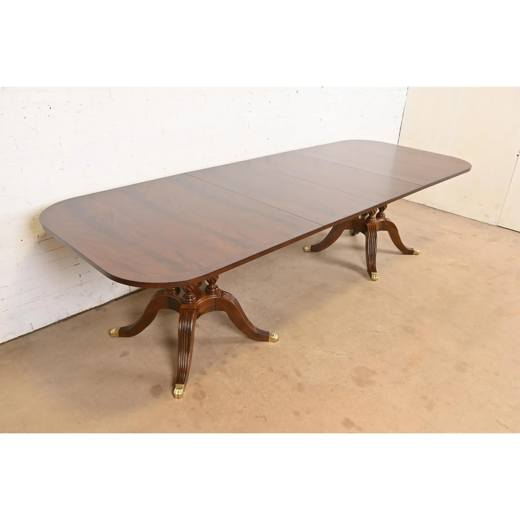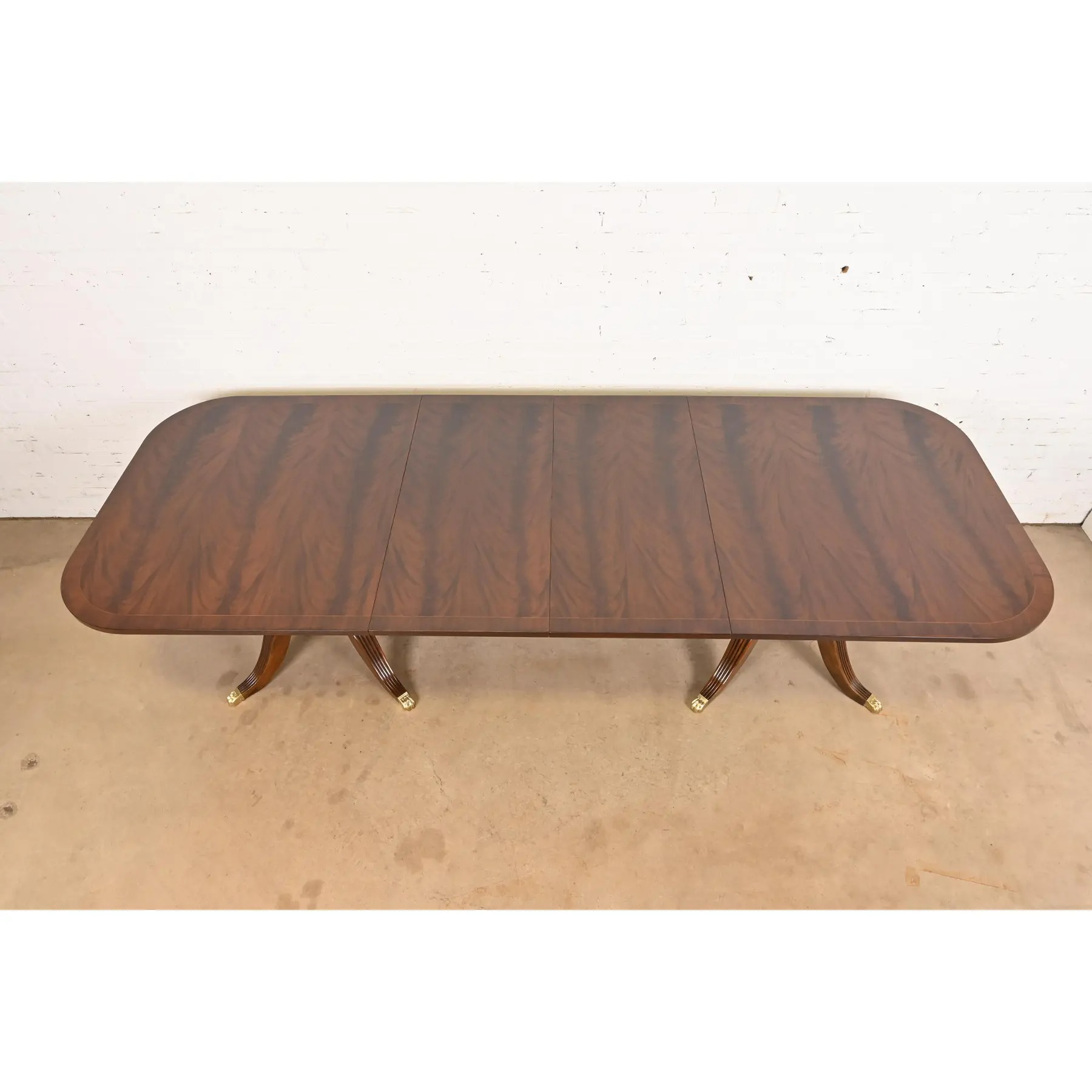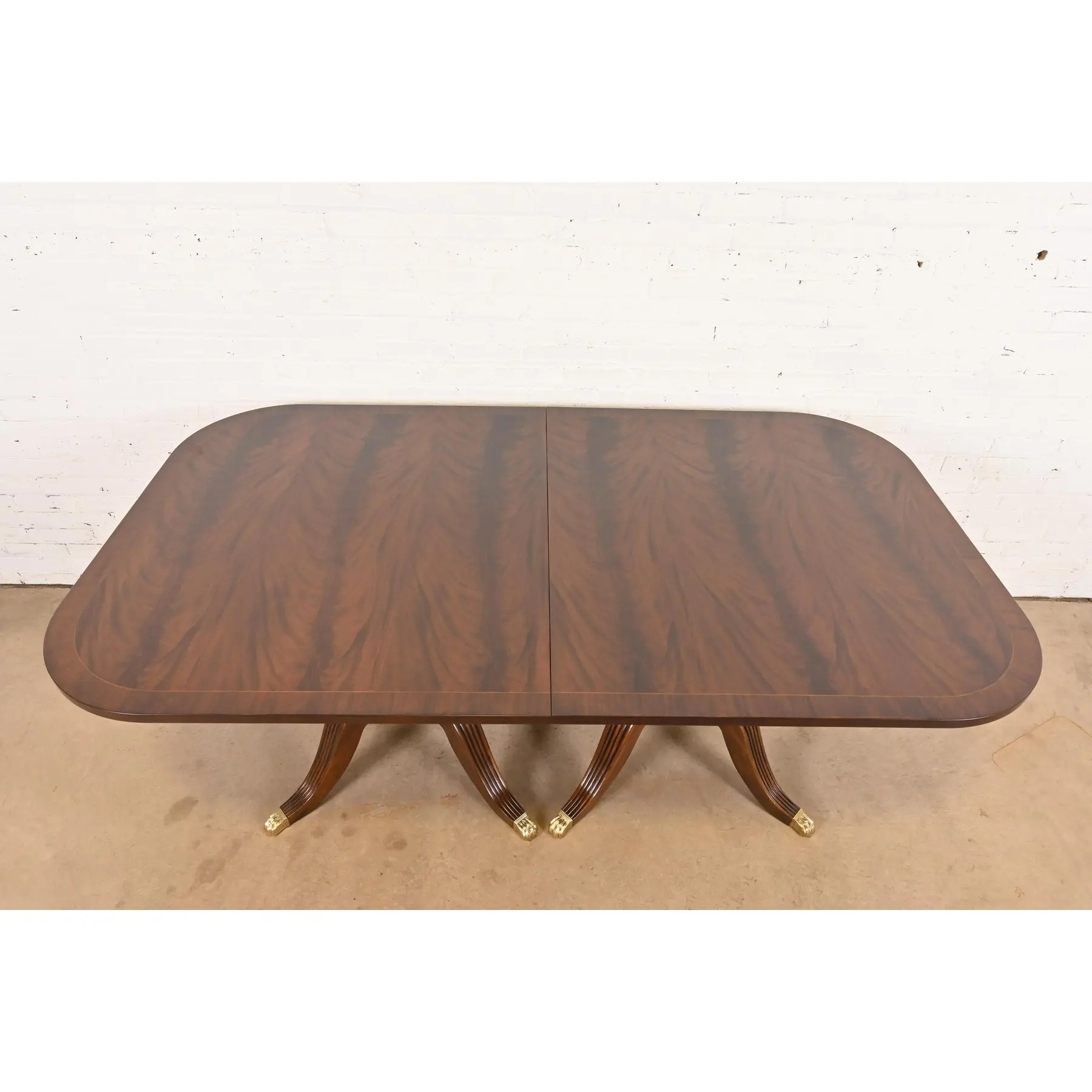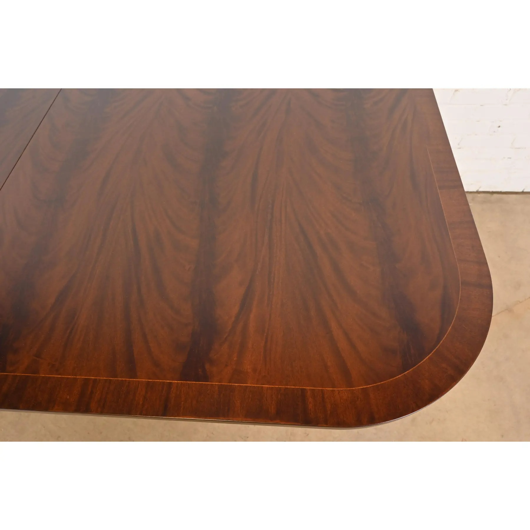 Gorgeous book-matched banded flame mahogany top, with satinwood string inlay, carved solid mahogany pedestals, and brass-capped paw feet.