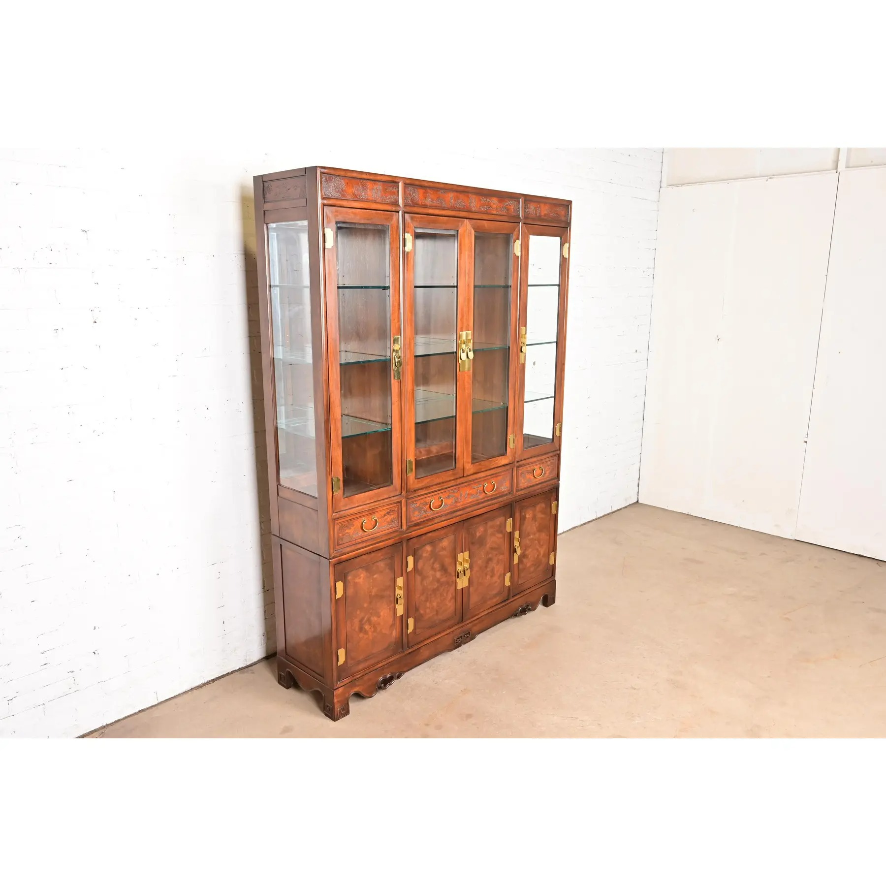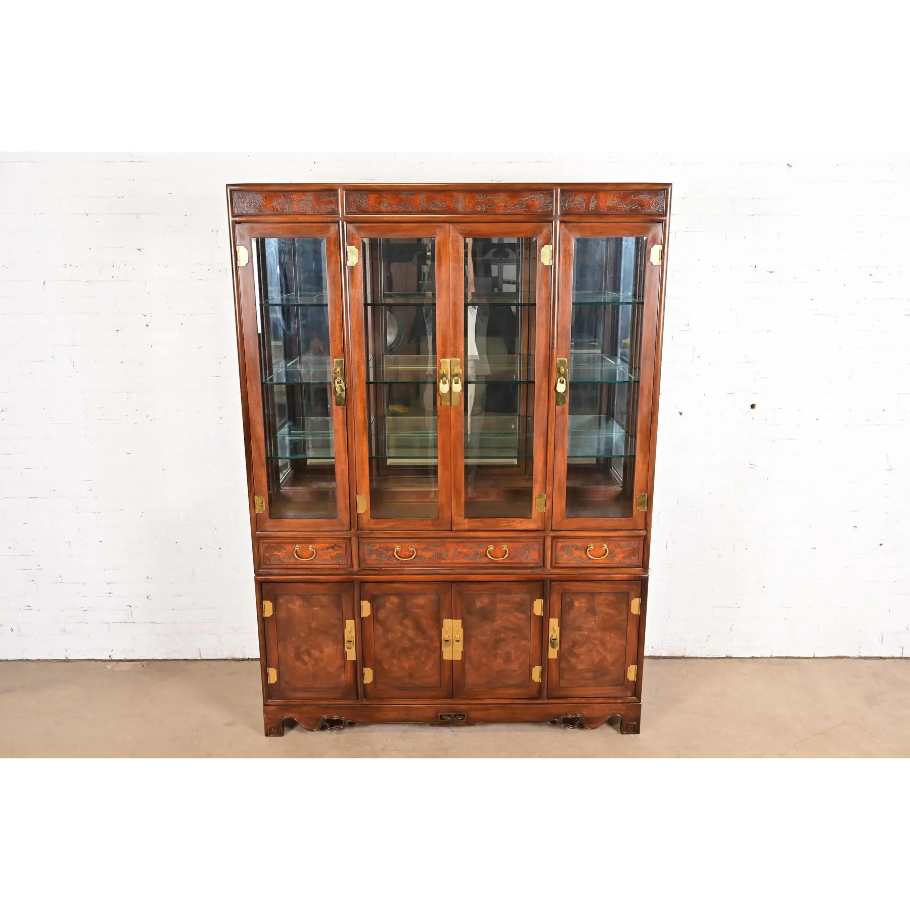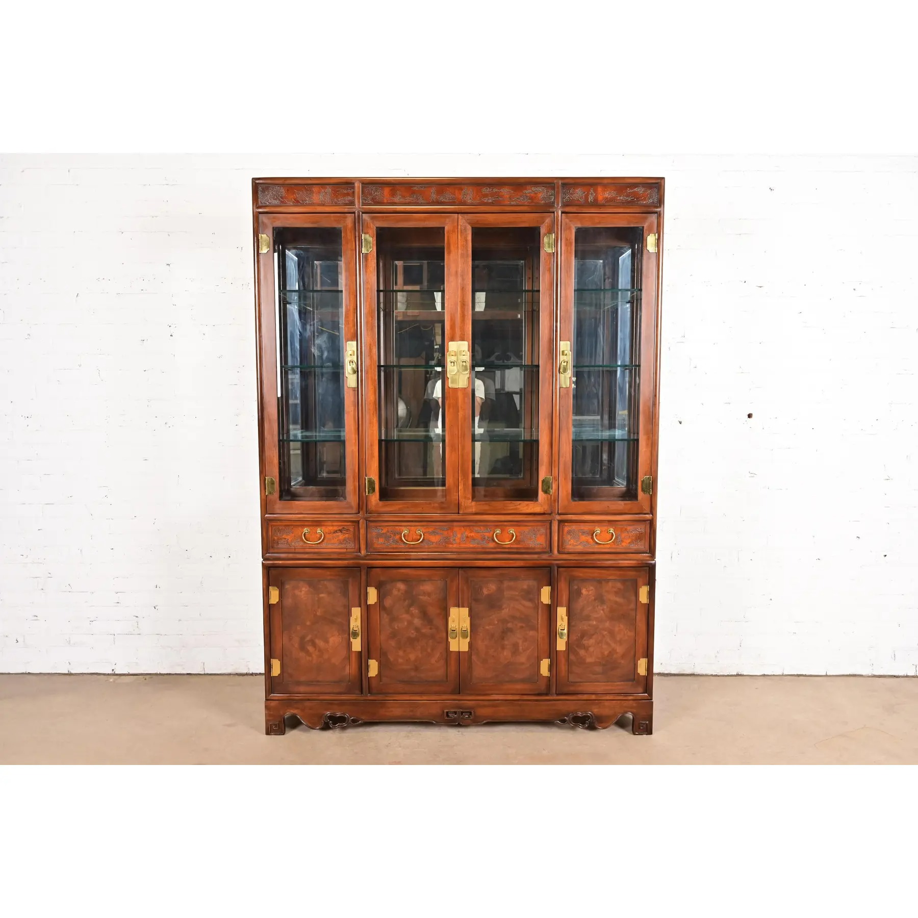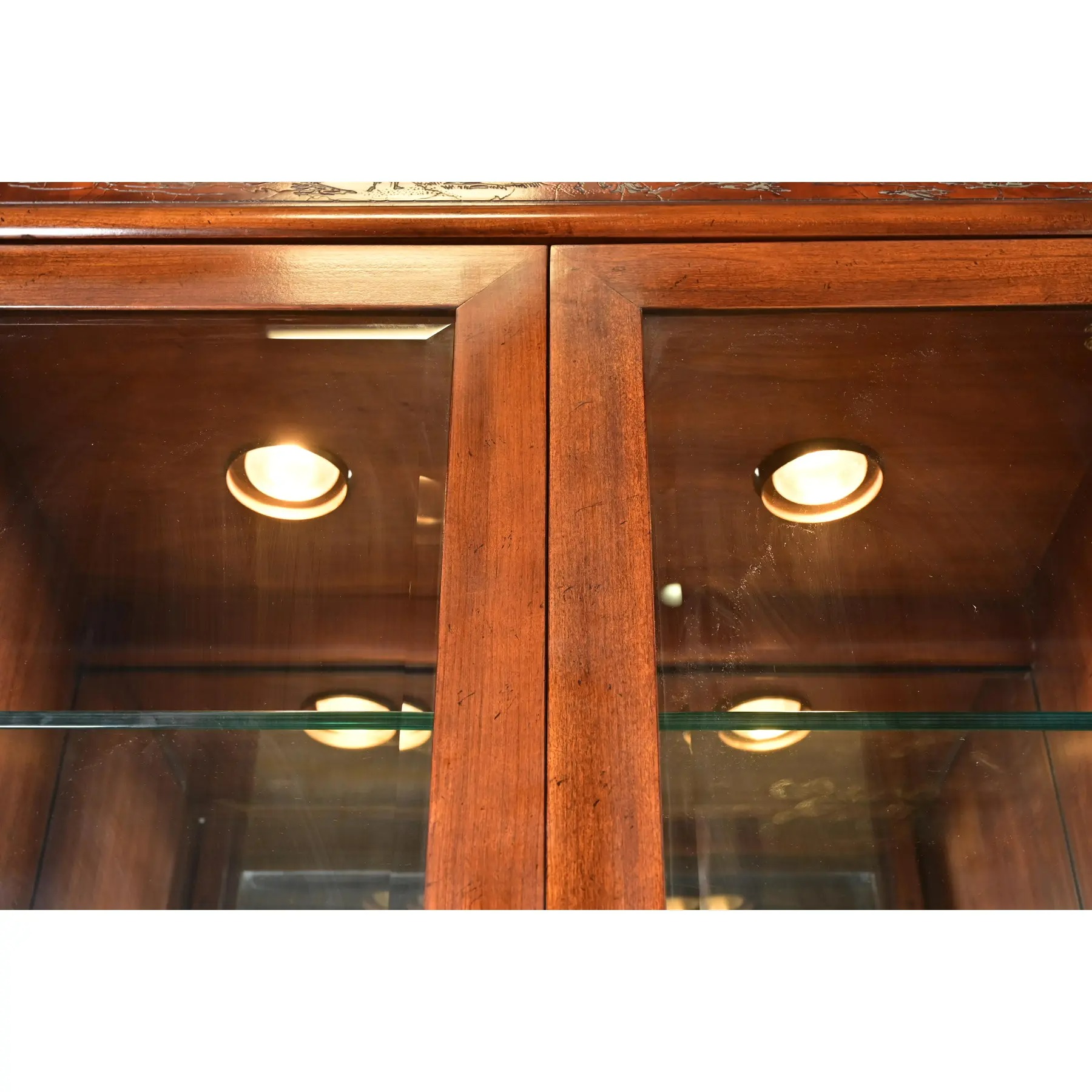Beautiful burled mahogany, with glass front and sides, carved Asian nature scenes, original brass hardware, and felt-lined silverware drawer. Shelves are adjustable.