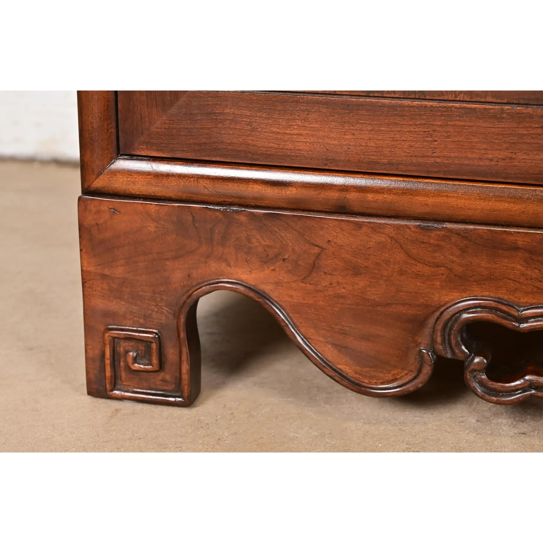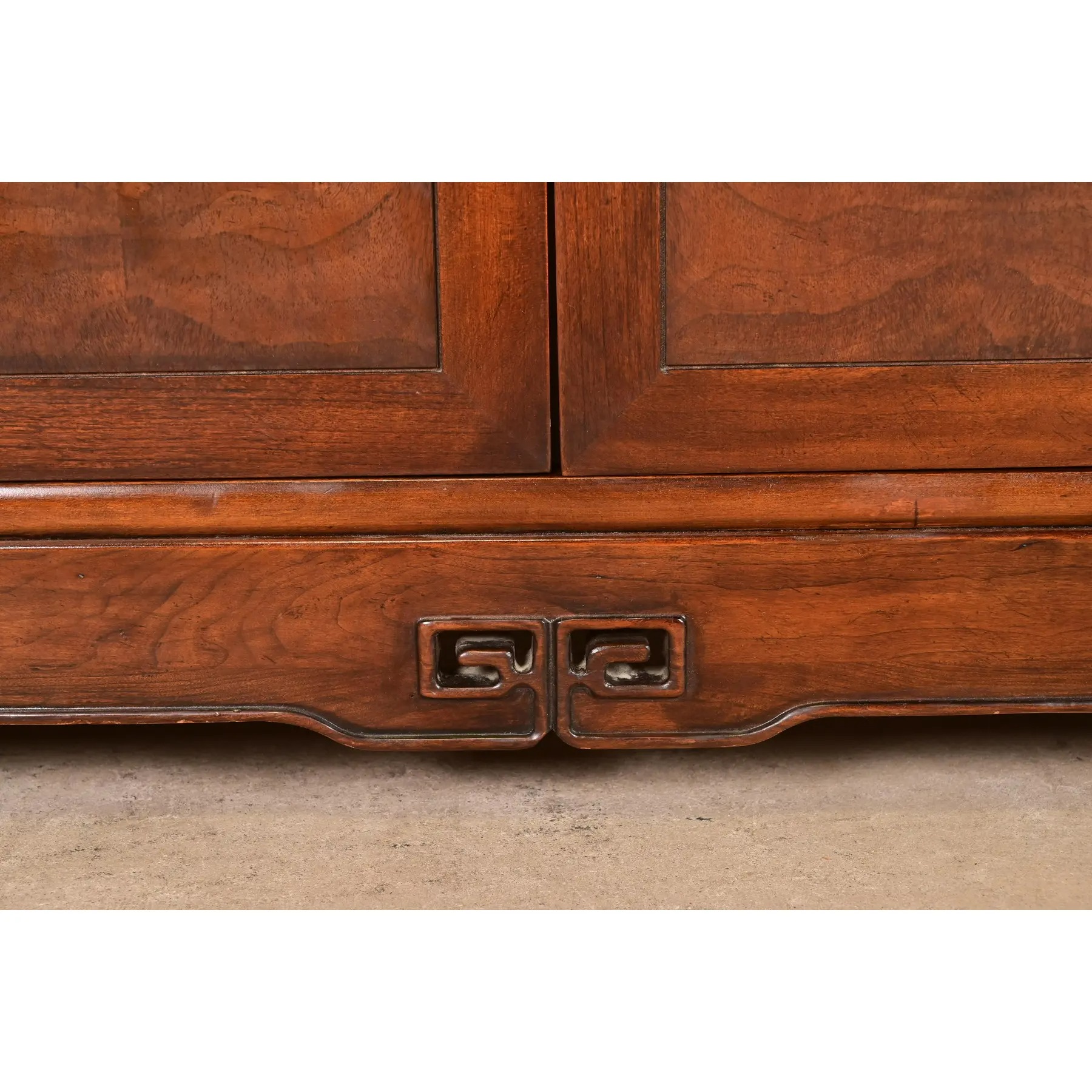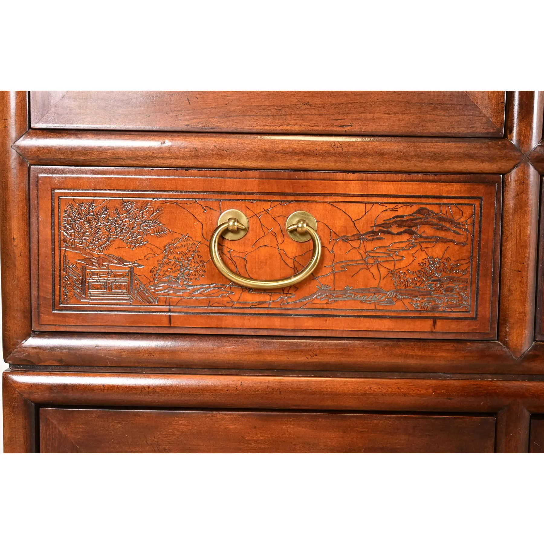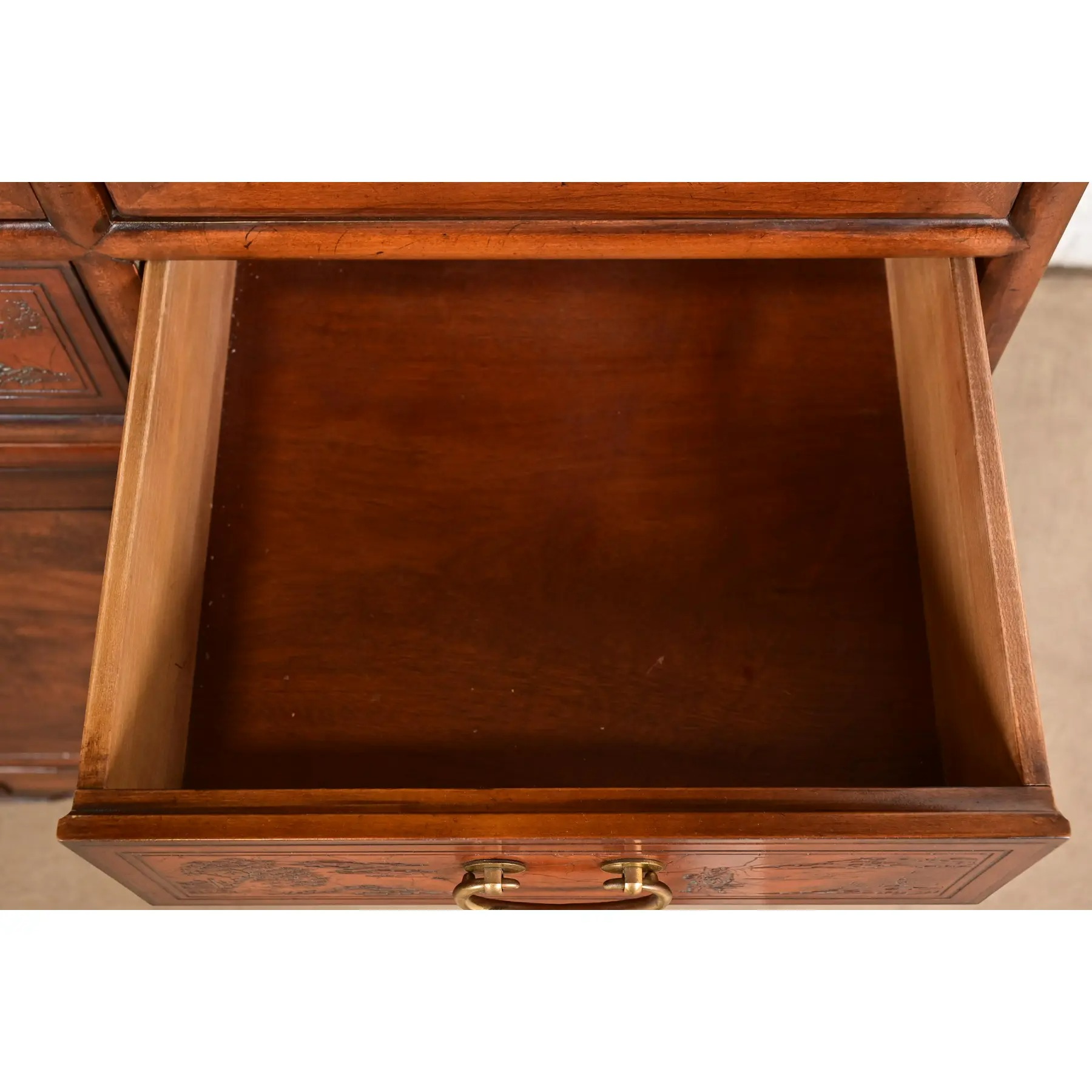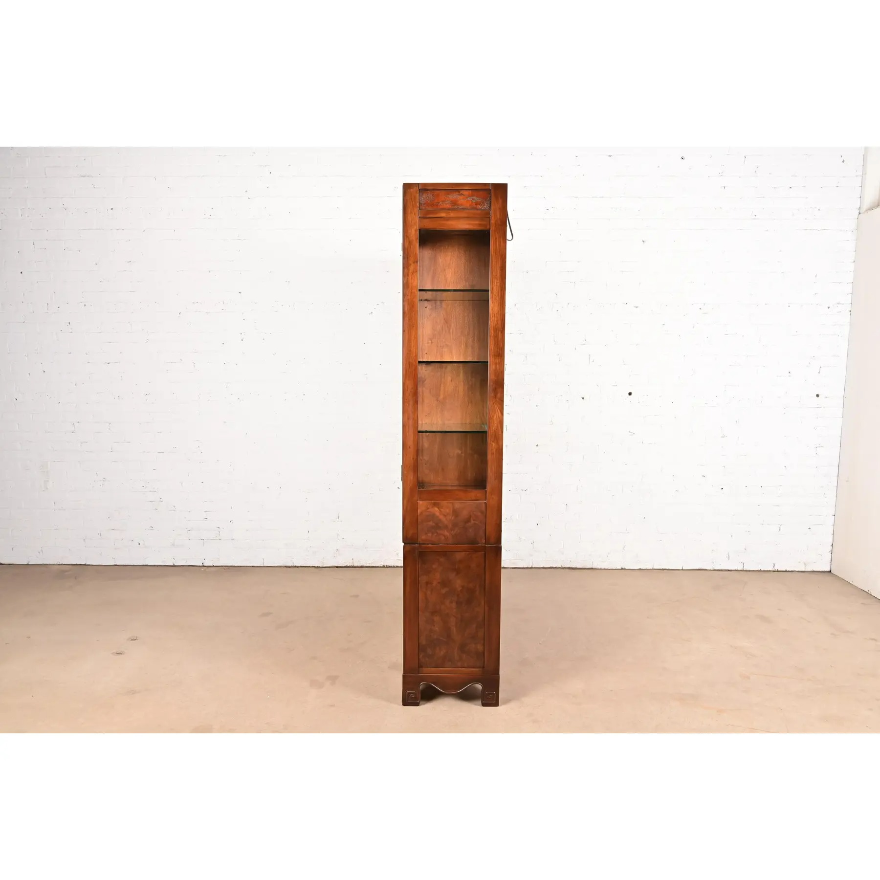 Beautiful burled mahogany, with glass front and sides, carved Asian nature scenes, original brass hardware, and felt-lined silverware drawer. Shelves are adjustable.
