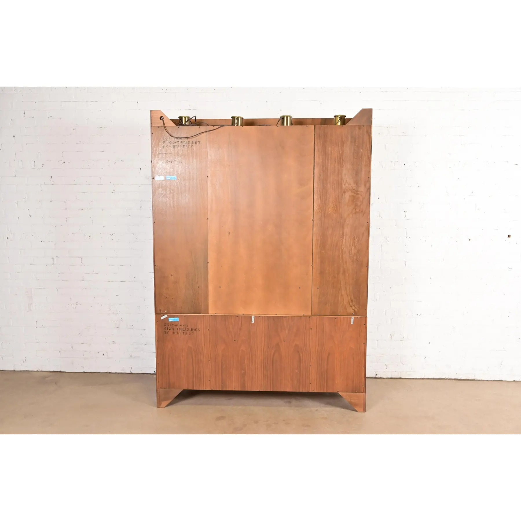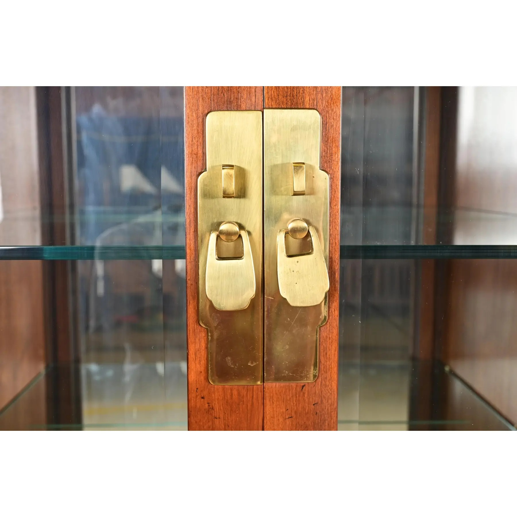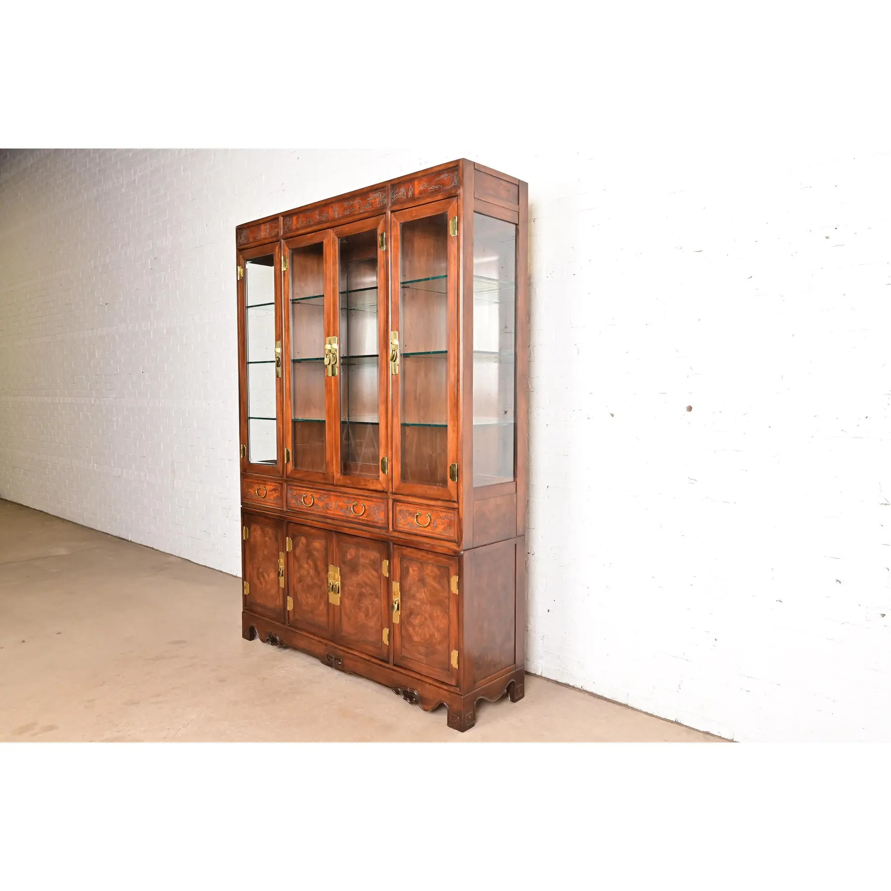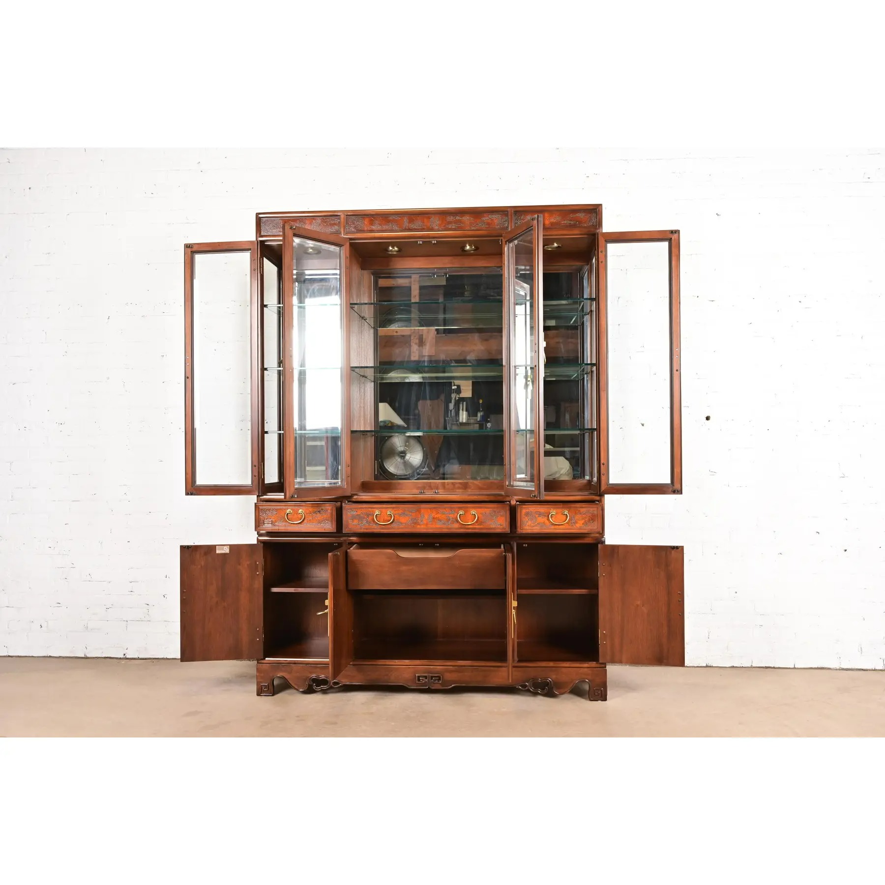 A gorgeous mid-century modern Hollywood Regency Chinoiserie style lighted bookcase, display cabinet, bar cabinet, or dining cabinet