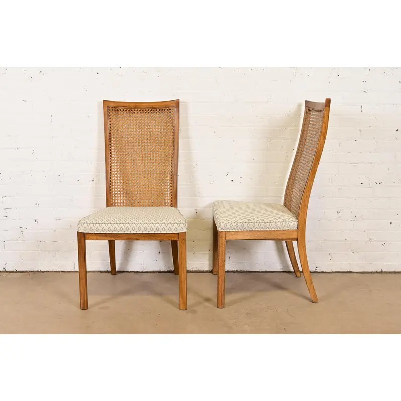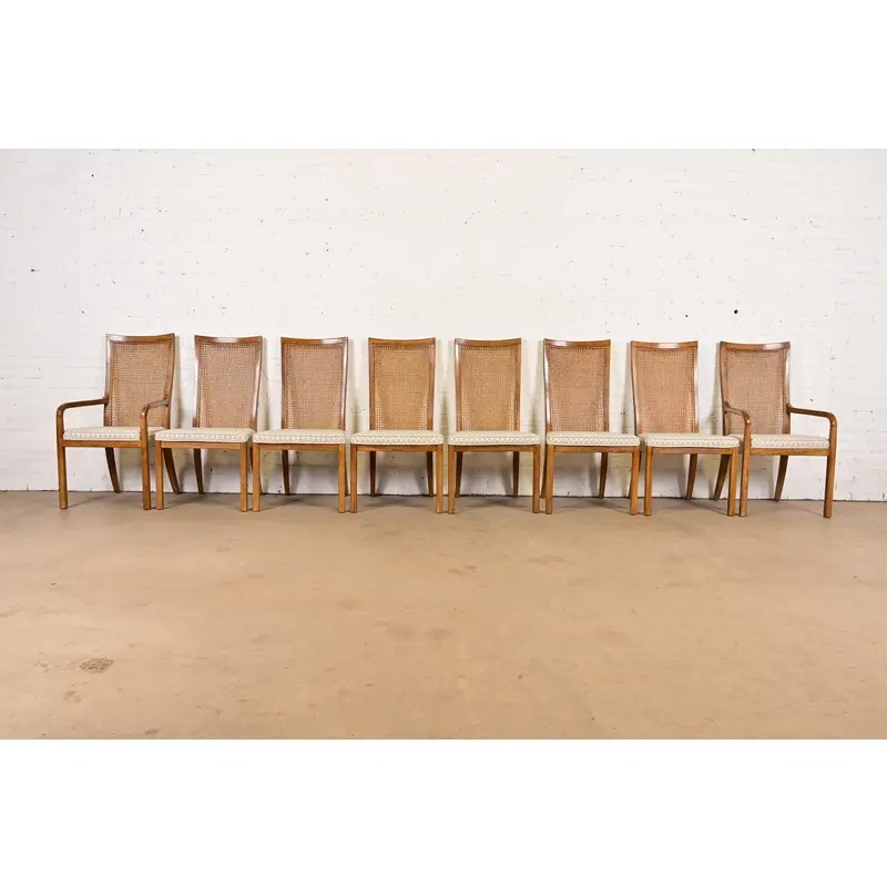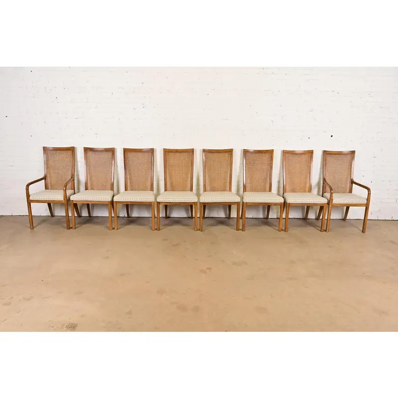 Drexel Heritage Mid-Century Modern Walnut and Cane High Back Dining Chairs, Set of Eight