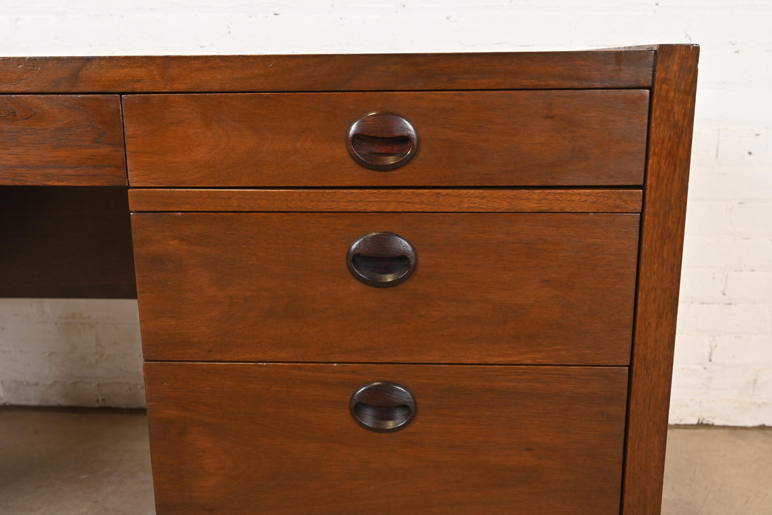 Gorgeous walnut, with carved rosewood recessed drawer pulls.