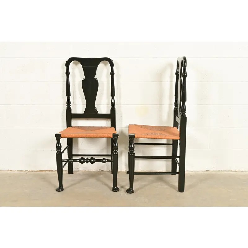Dark green lacquered cherry wood frames, with rush seats.