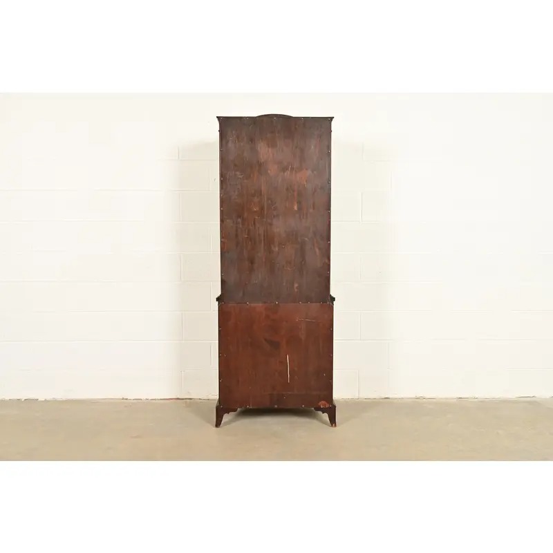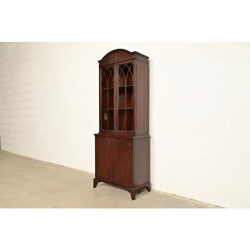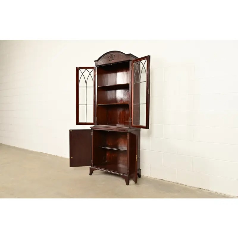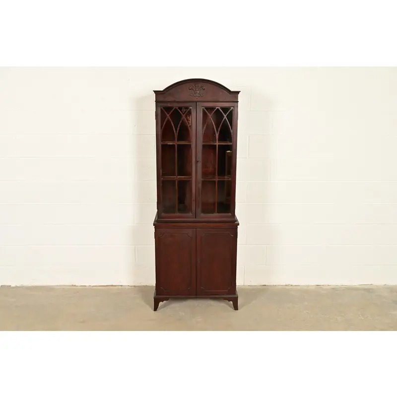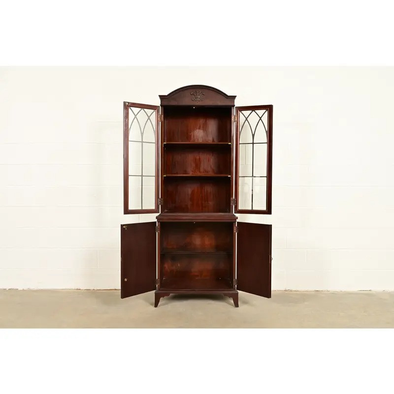 English Regency Antique Carved Mahogany Breakfront Bookcase Cabinet, Circa 1890s