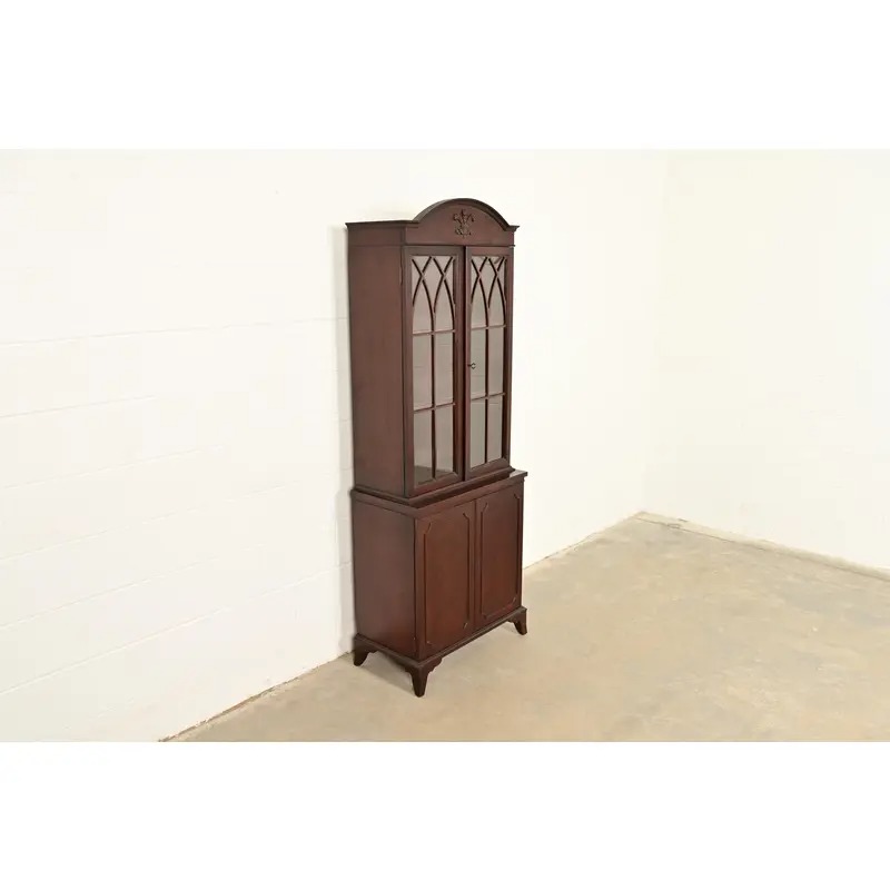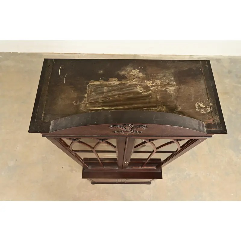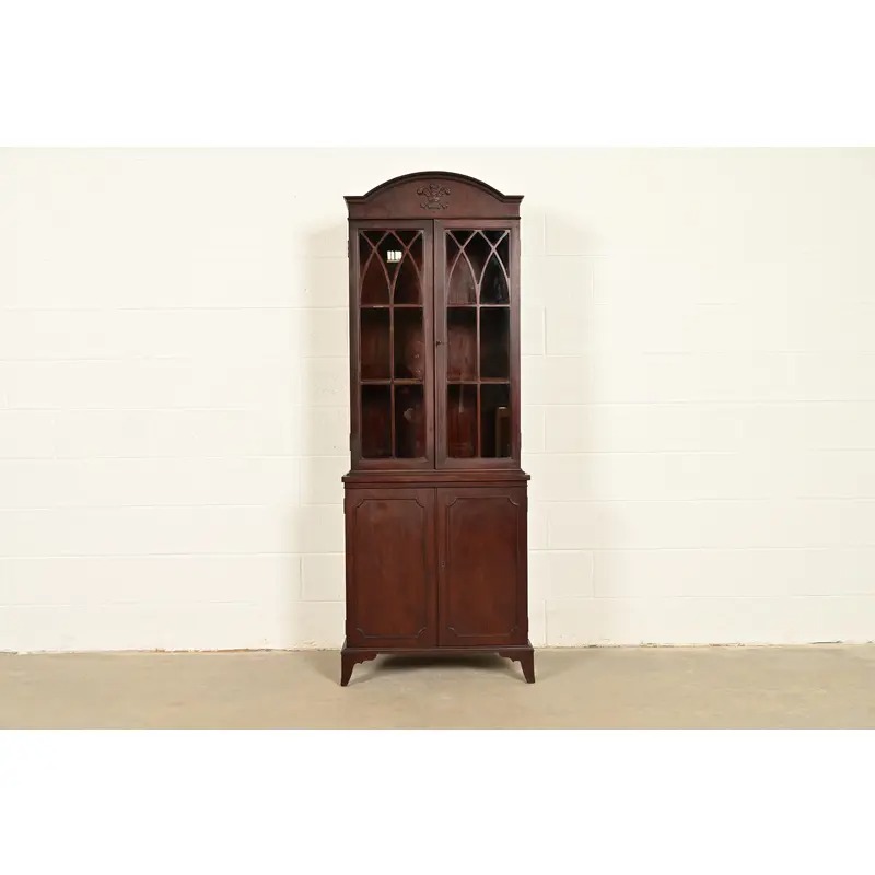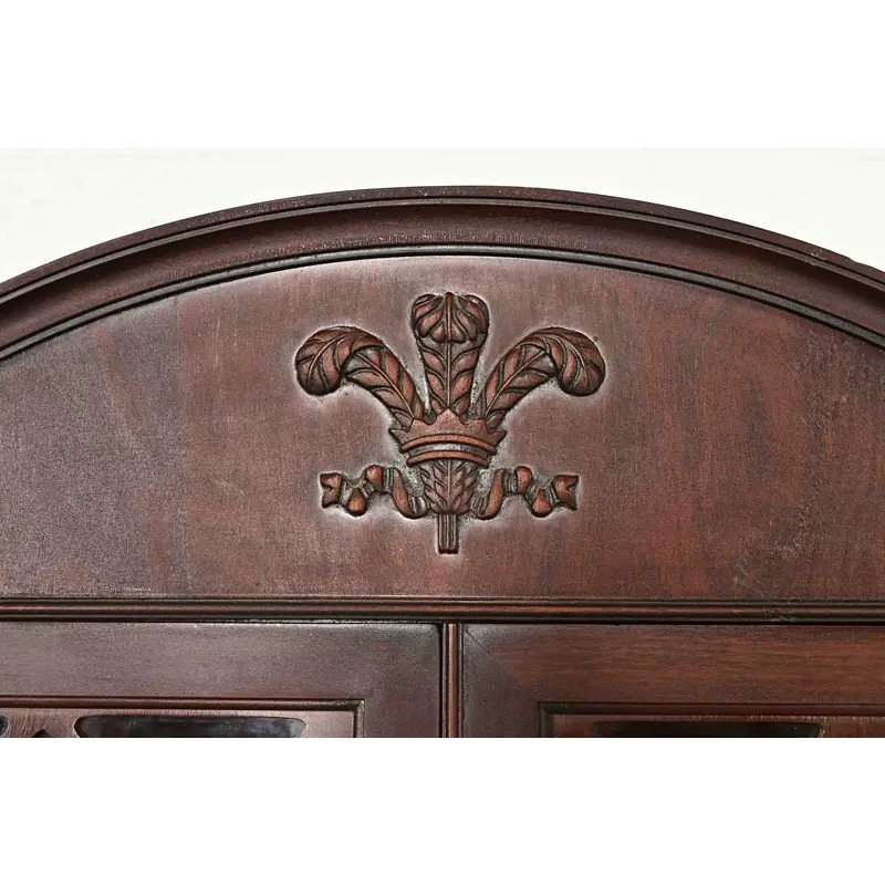Mahogany, with carved Prince of Wales feathers on pediment, and mullioned glass front doors.