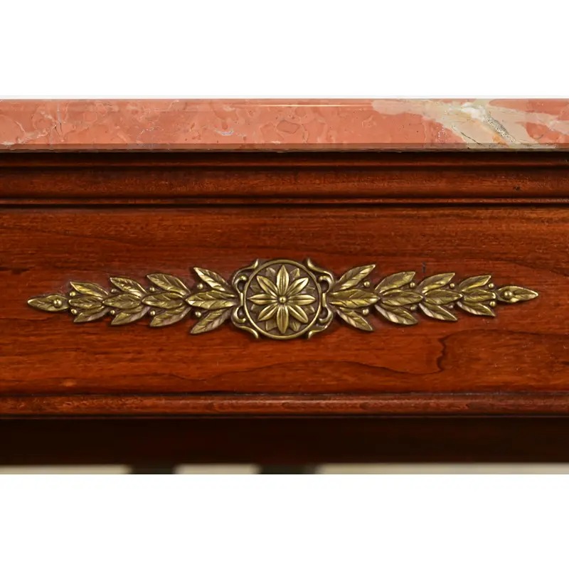 Carved cherry wood, with marble top, mounted brass ormolu, and beveled mirrored back.