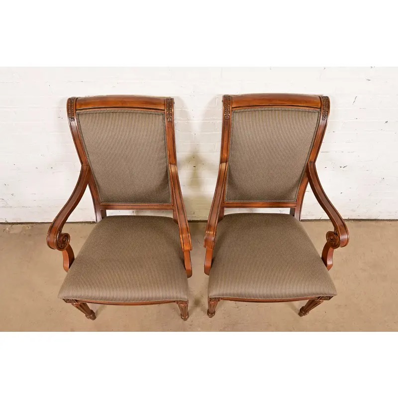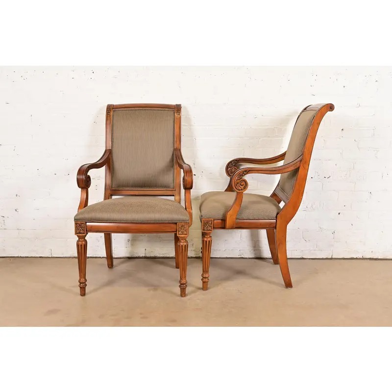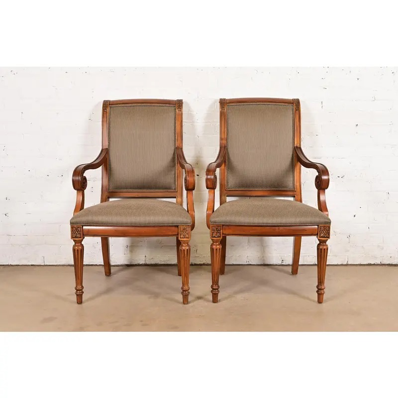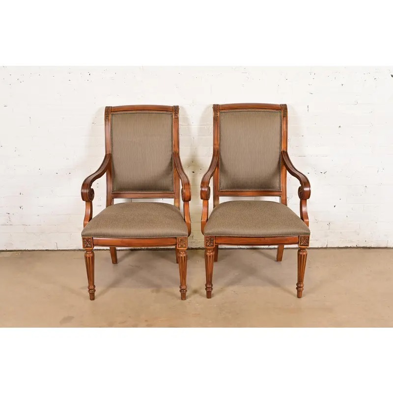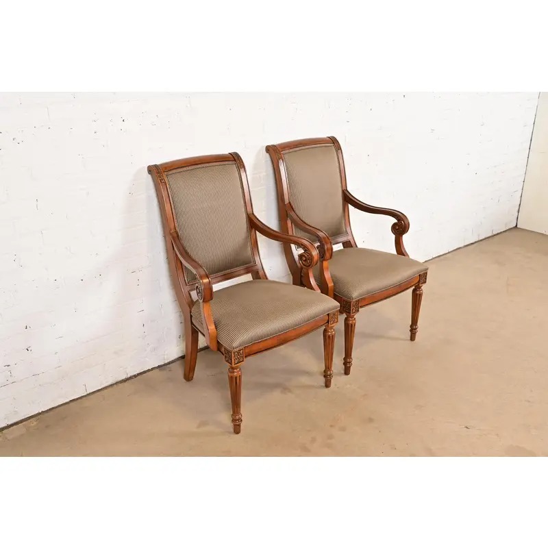 Ethan Allen French Regency Louis XVI Carved Cherry Wood Upholstered Armchairs, Pair