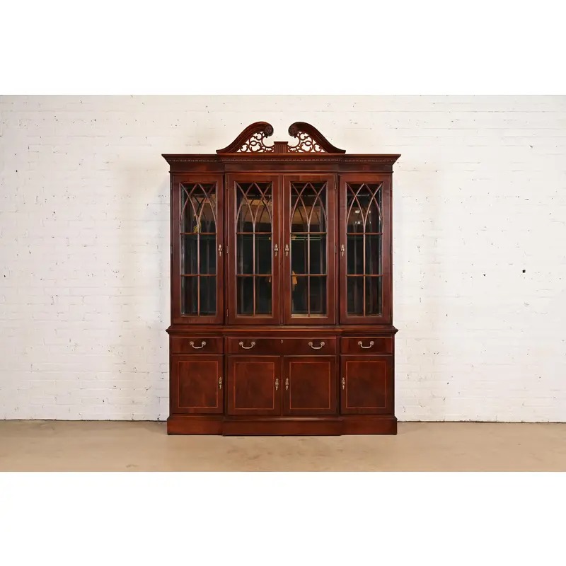 A beautiful Georgian or Chippendale style lighted breakfront bookcase cabinet or dining cabinet
