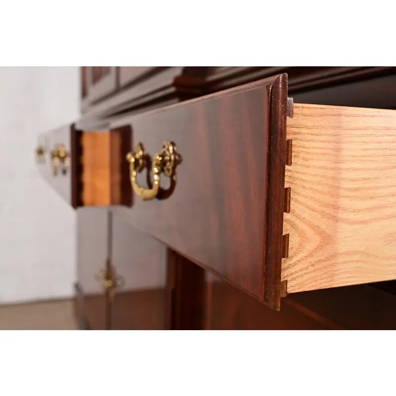 Ethan Allen Georgian Carved Flame Mahogany Lighted Breakfront Bookcase Cabinet