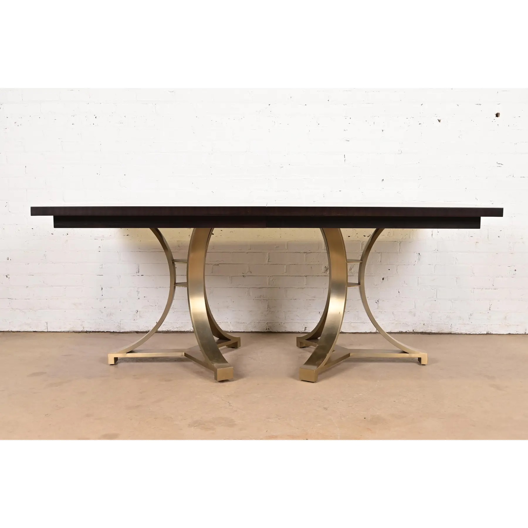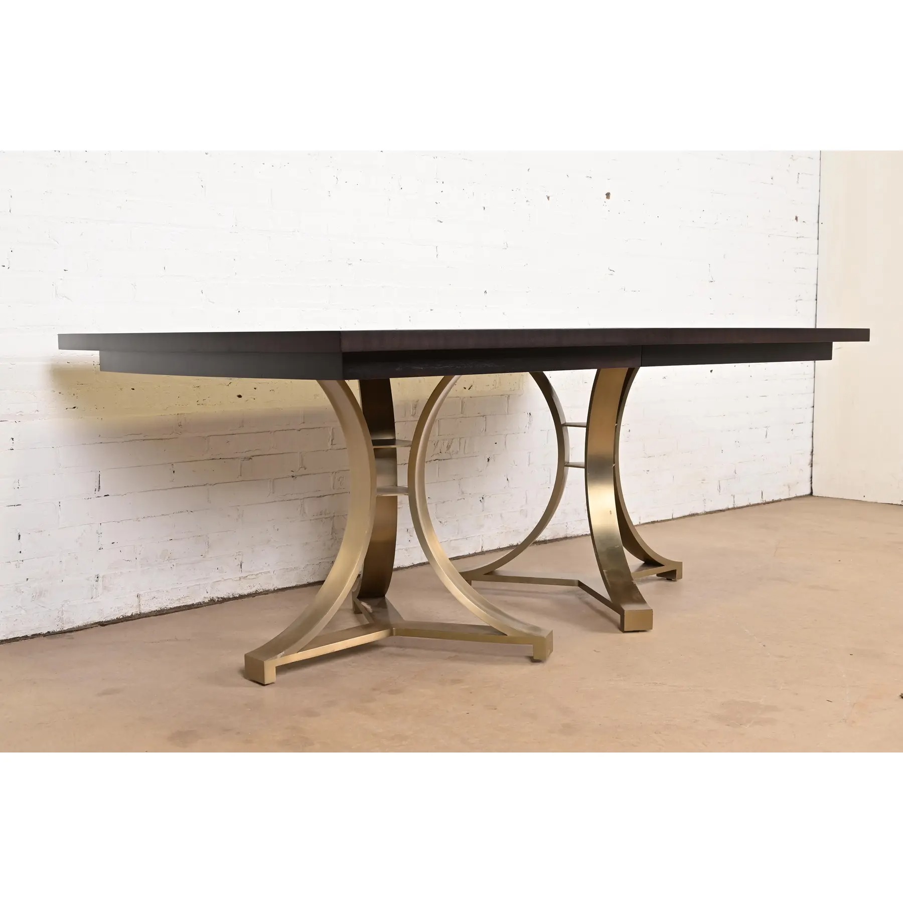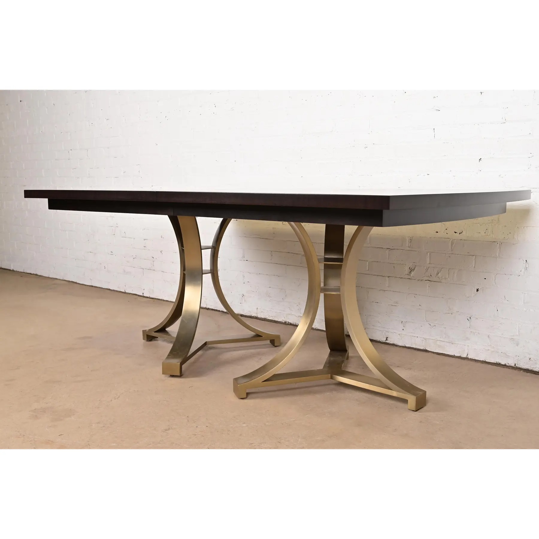 A gorgeous Modern Regency or Hollywood Regency style mahogany and brass double pedestal dining table