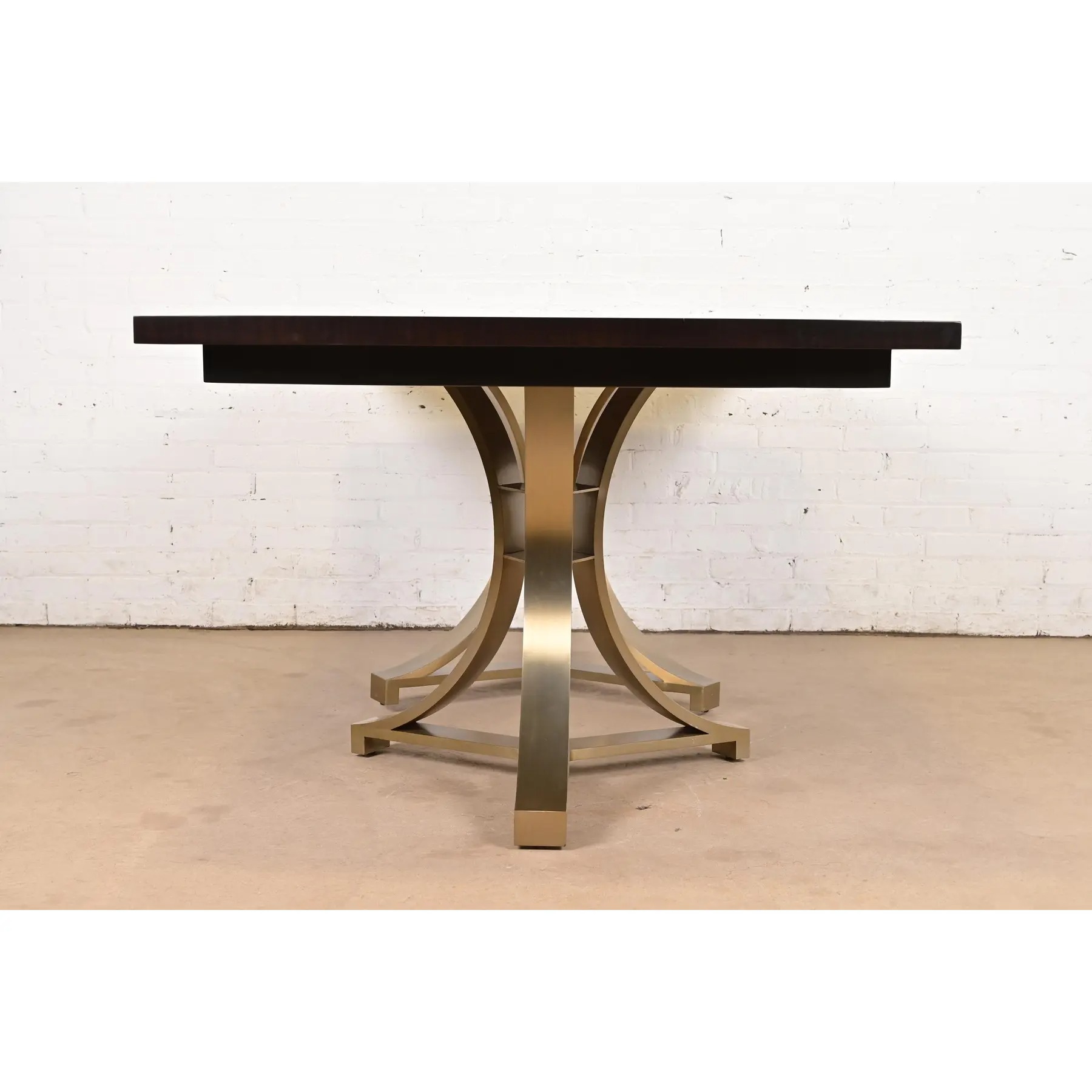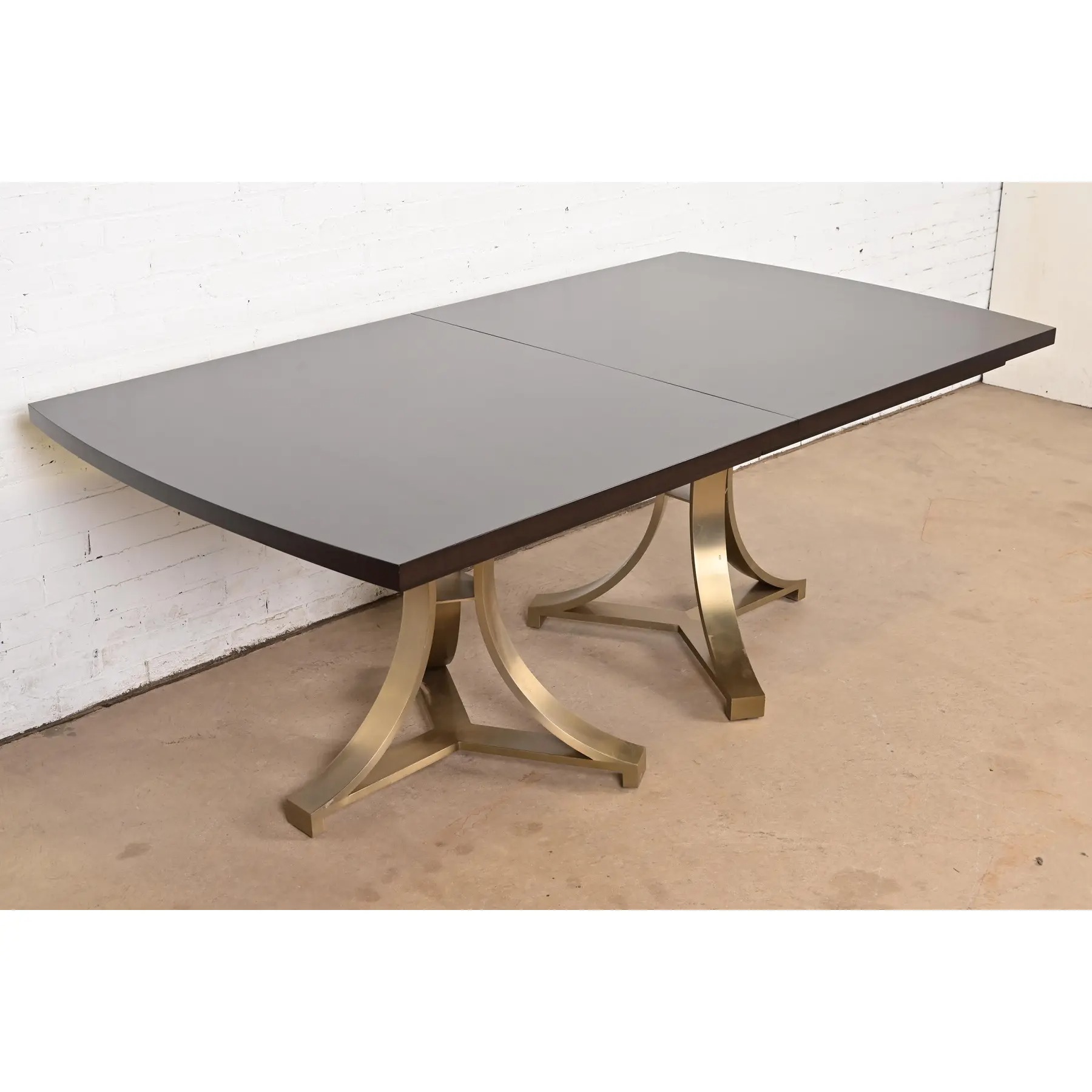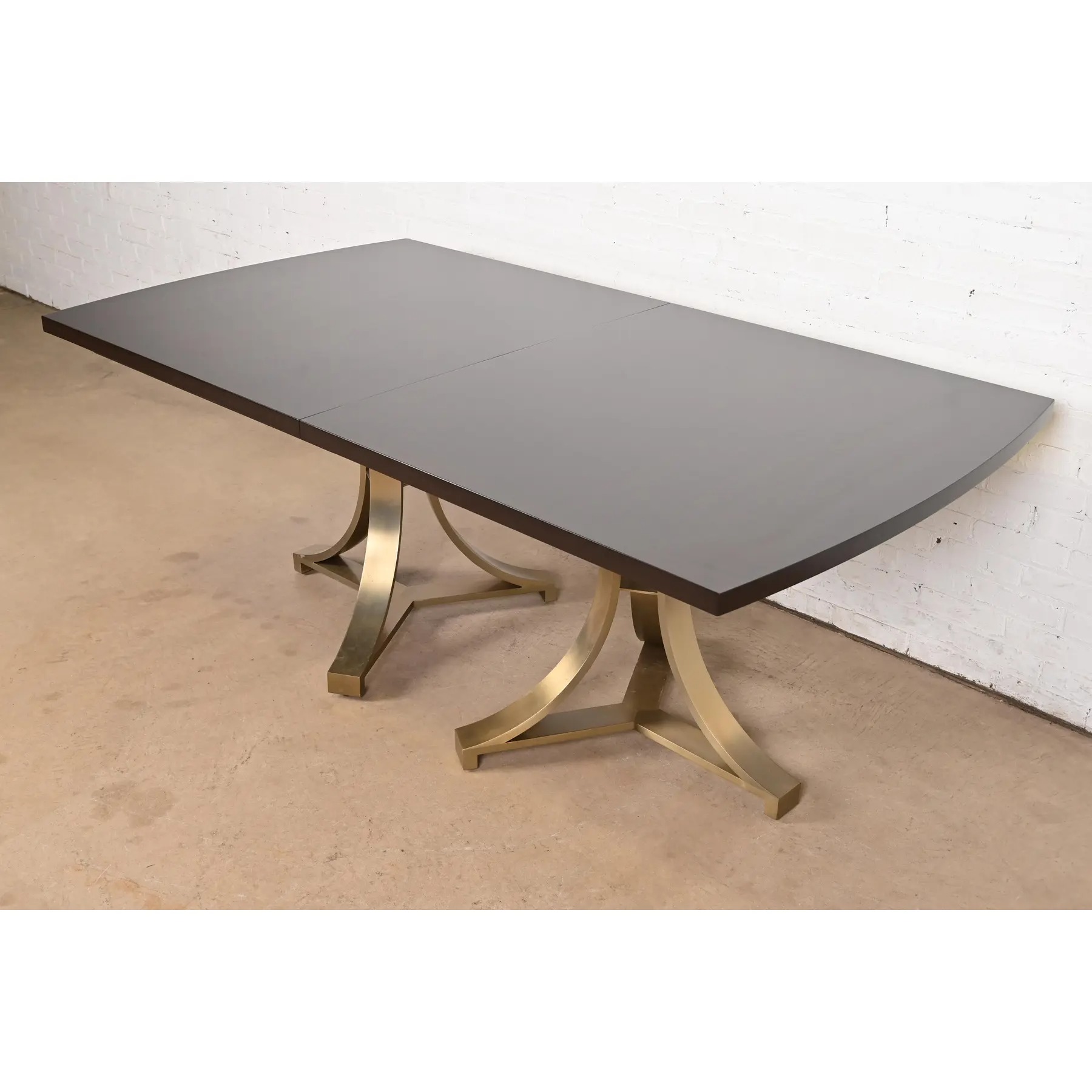A gorgeous Modern Regency or Hollywood Regency style mahogany and brass double pedestal dining table