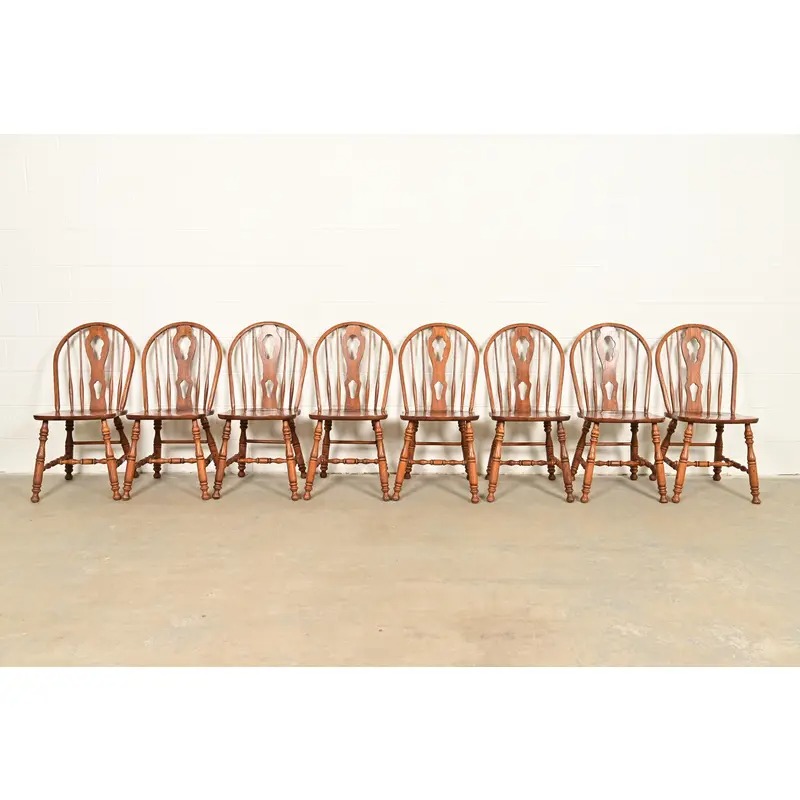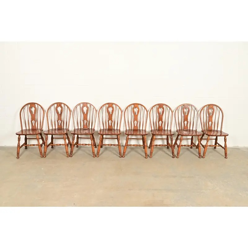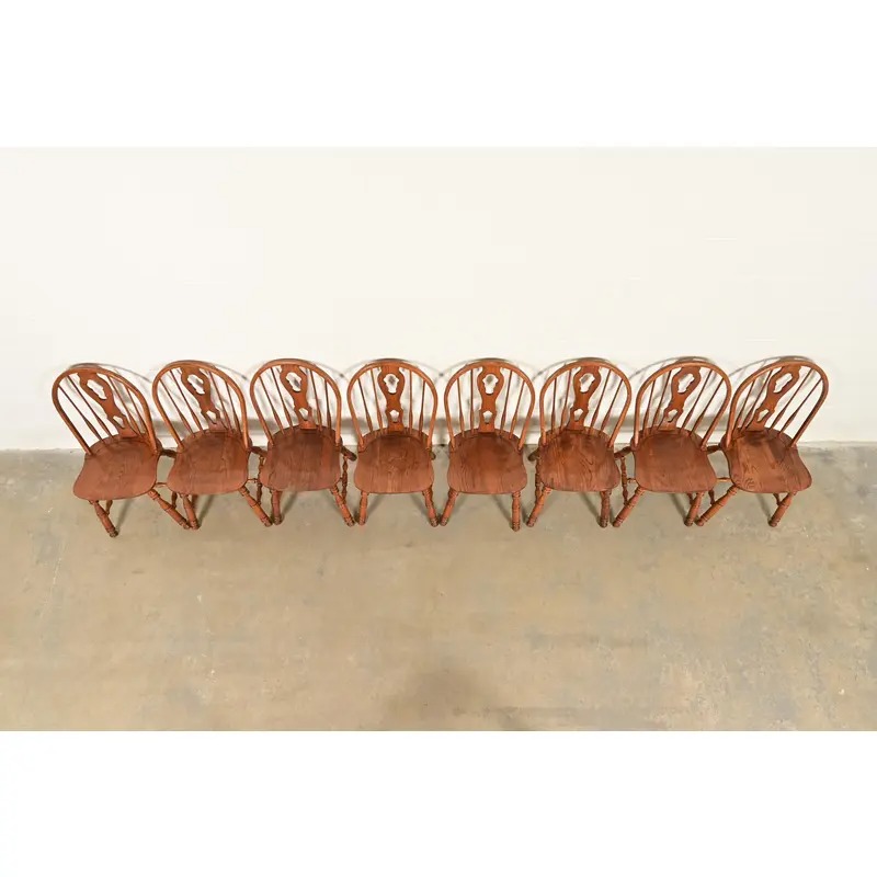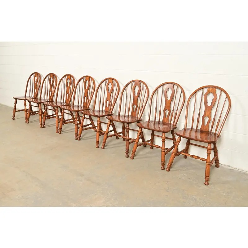 A gorgeous set of eight American Colonial style solid oak spindle back Windsor dining chairs