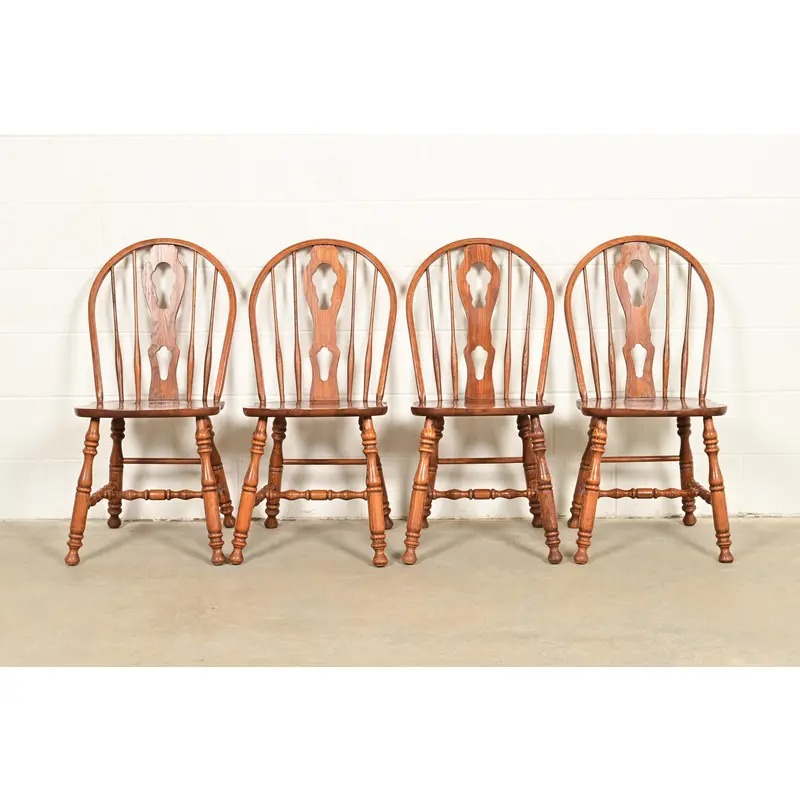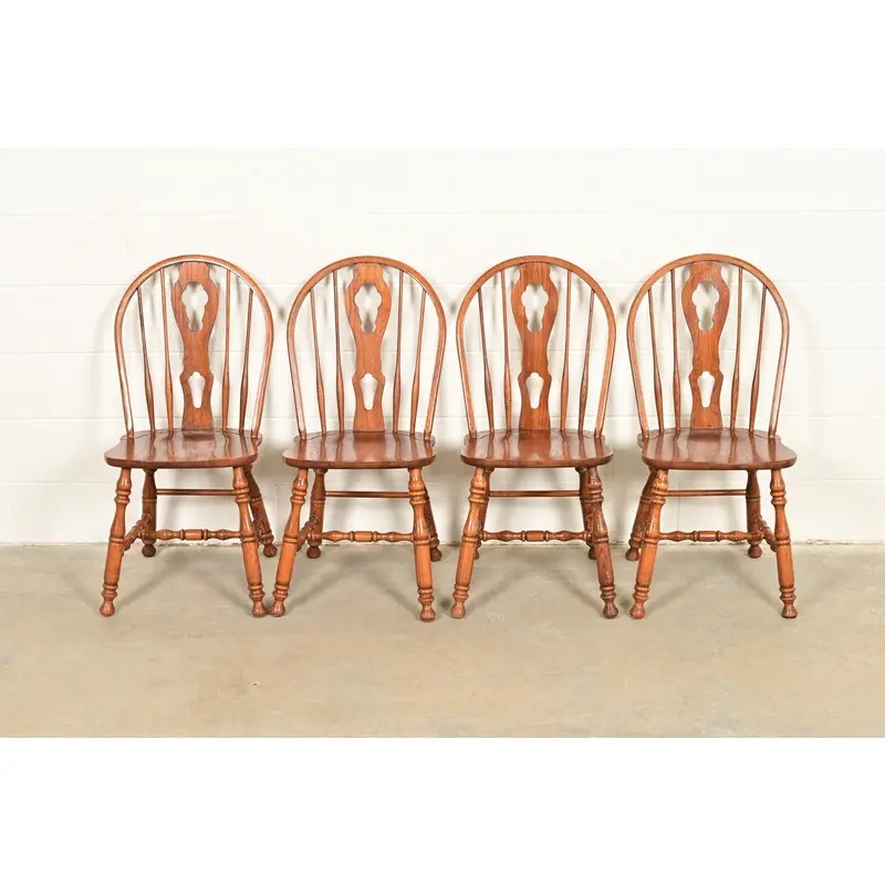 A gorgeous set of four American Colonial style solid oak spindle back Windsor dining chairs