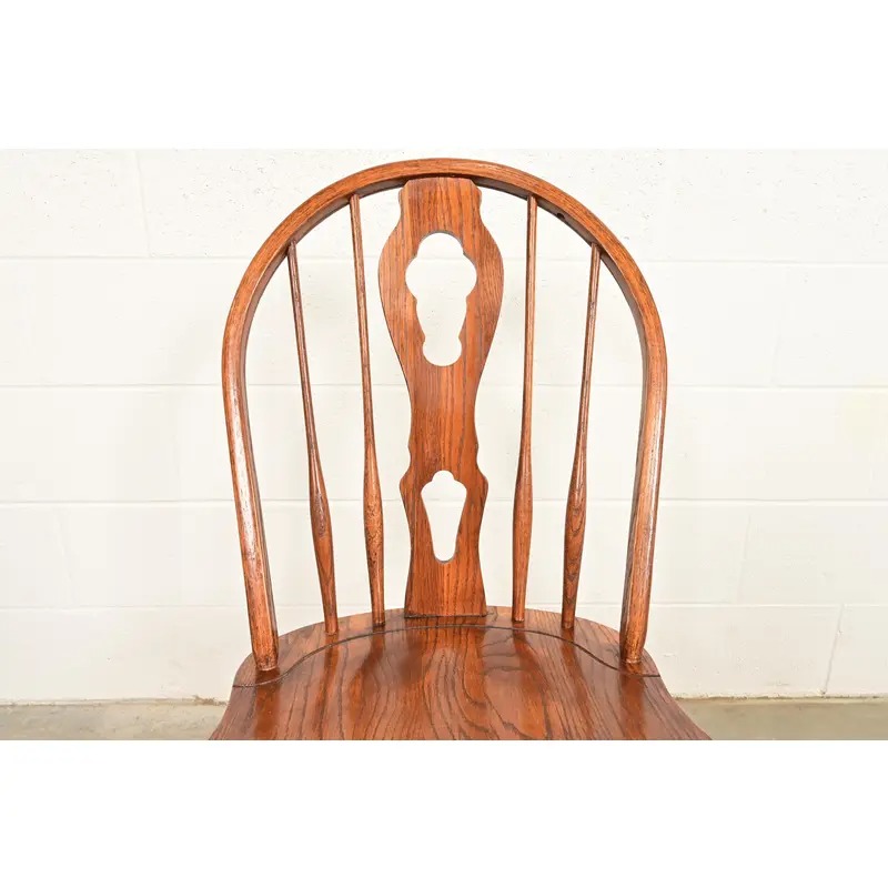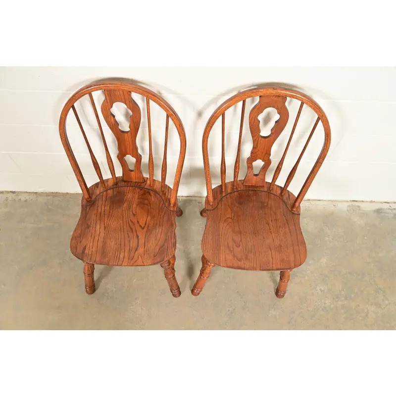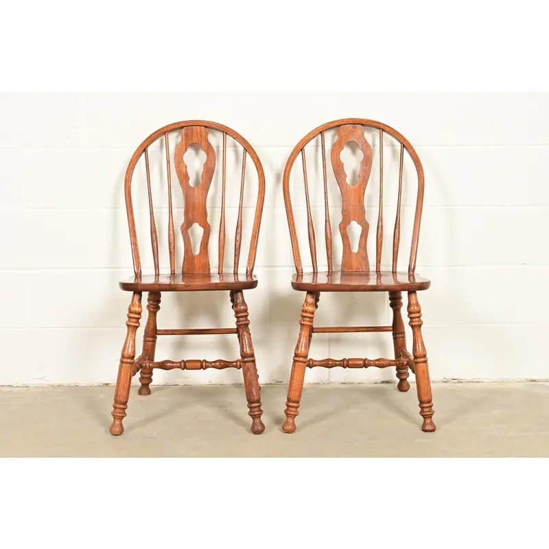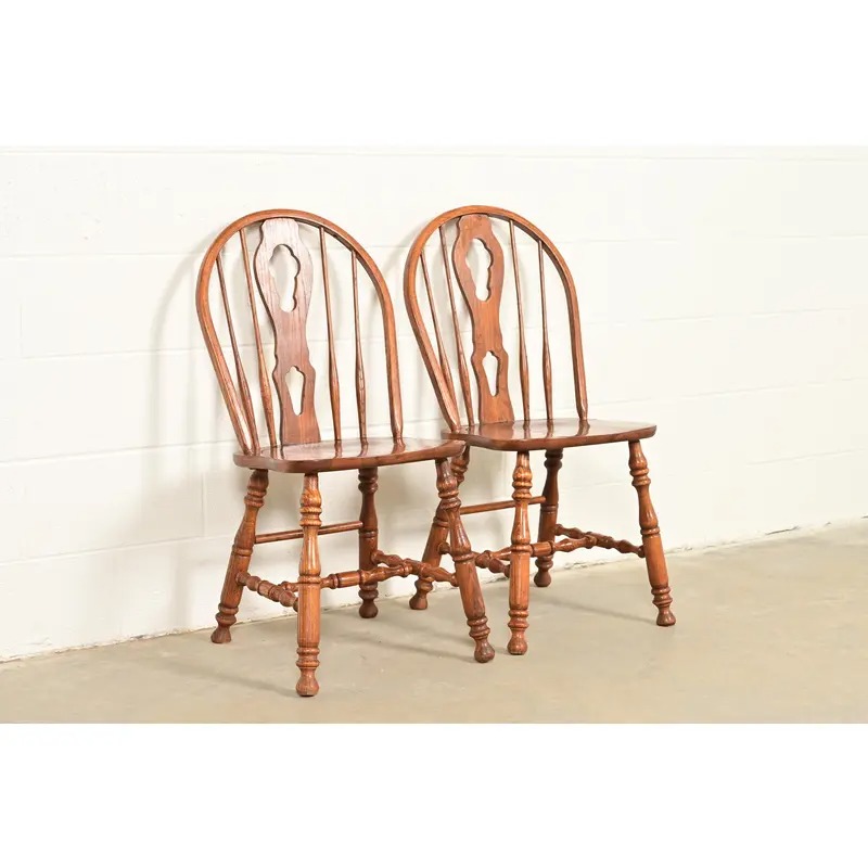 Ethan Allen Style American Colonial Solid Oak Spindle Back Windsor Side Chairs or Dining Chairs, Pair