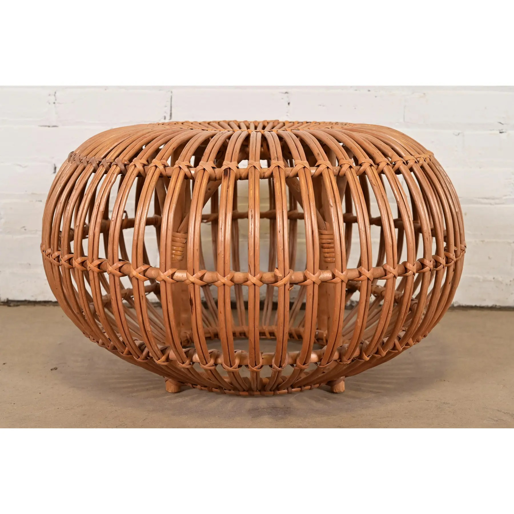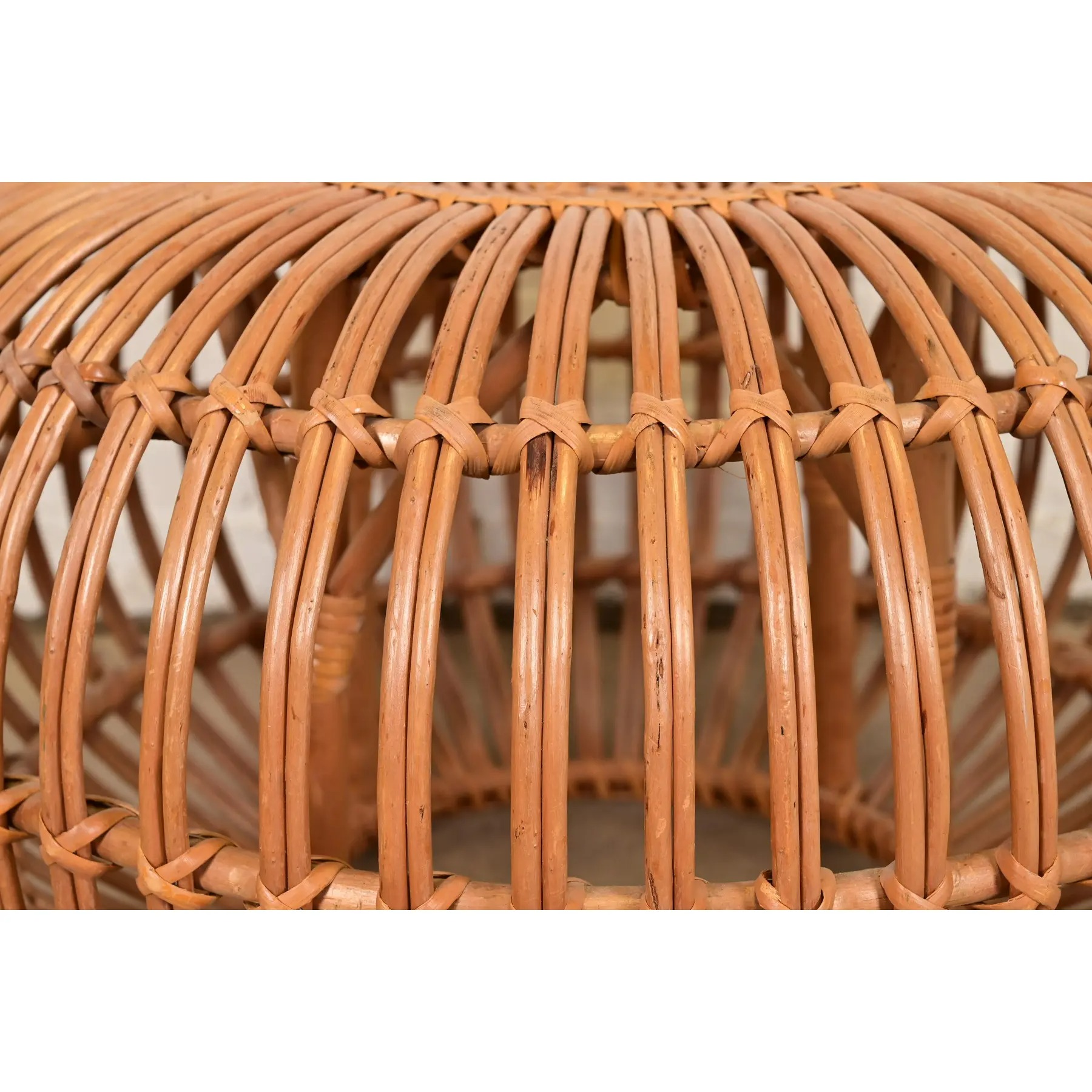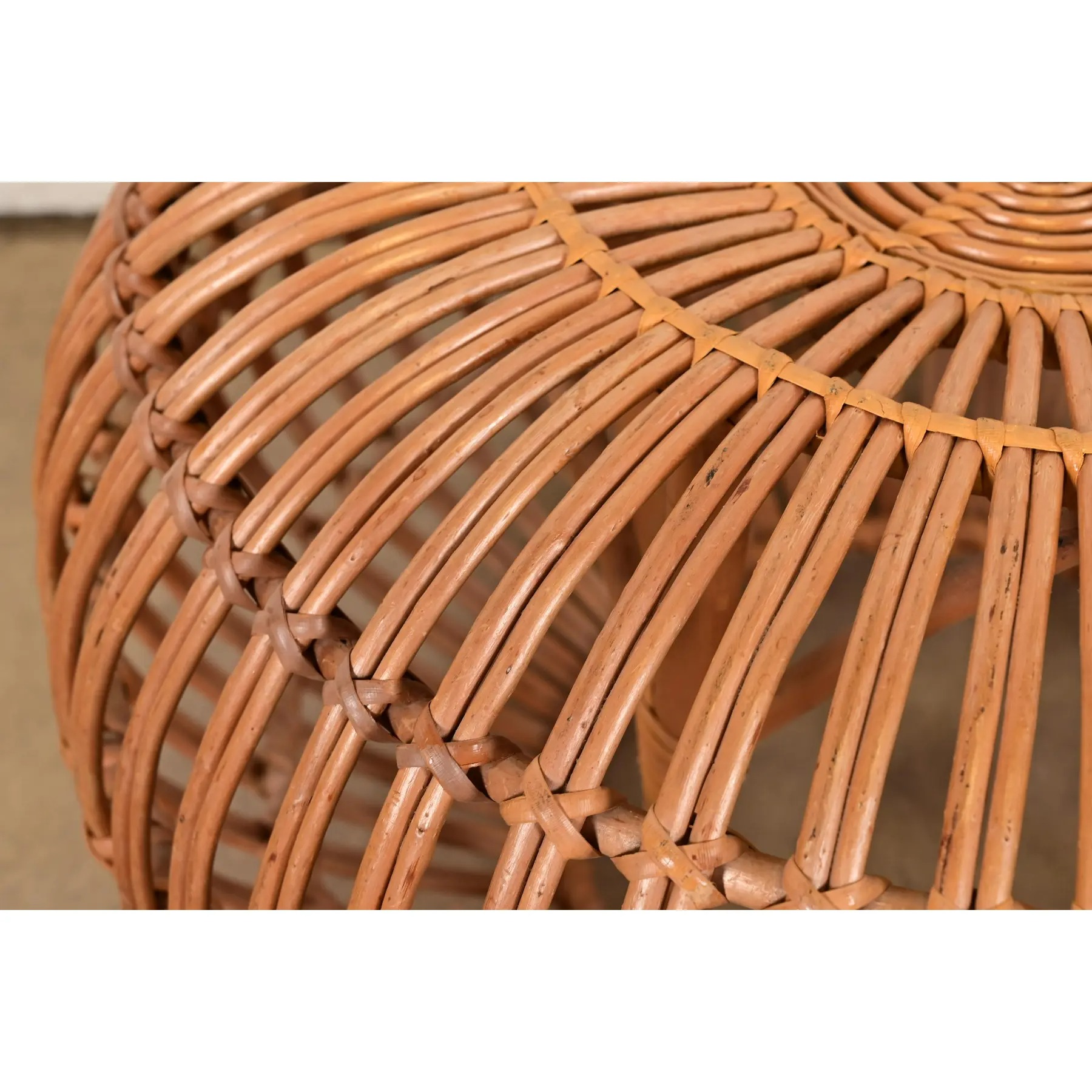 A gorgeous mid-century Organic Modern bent rattan pouf ottoman, footstool, or side table