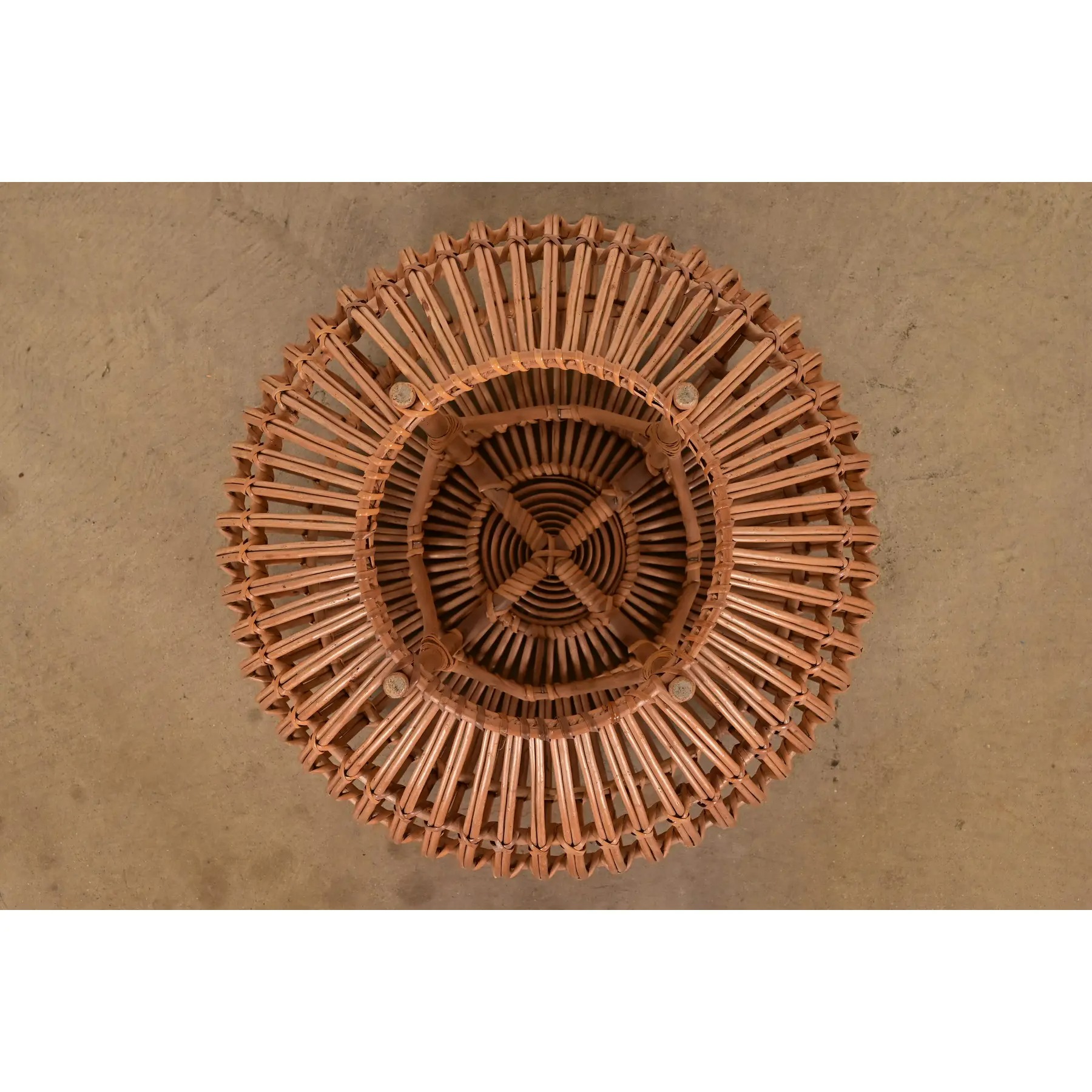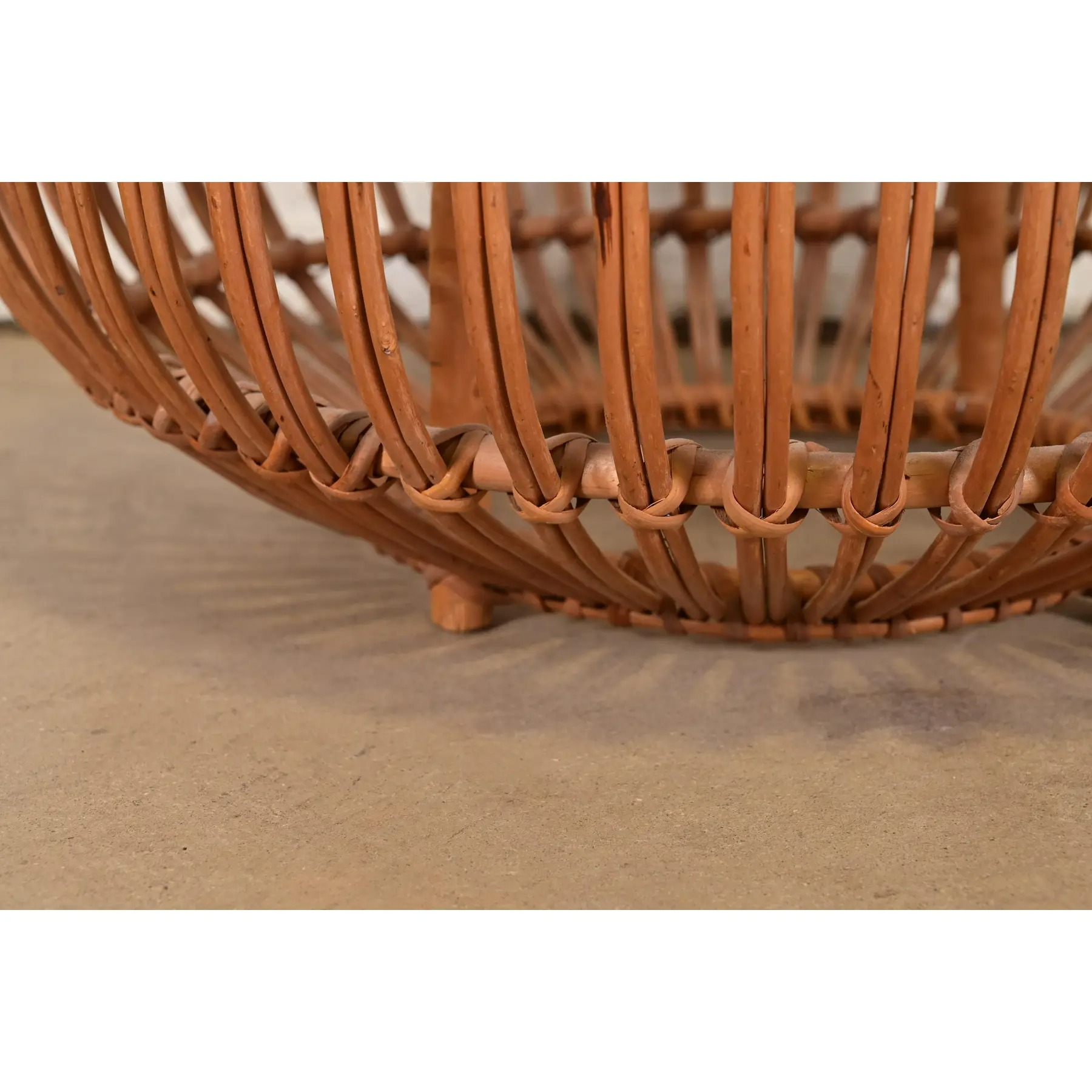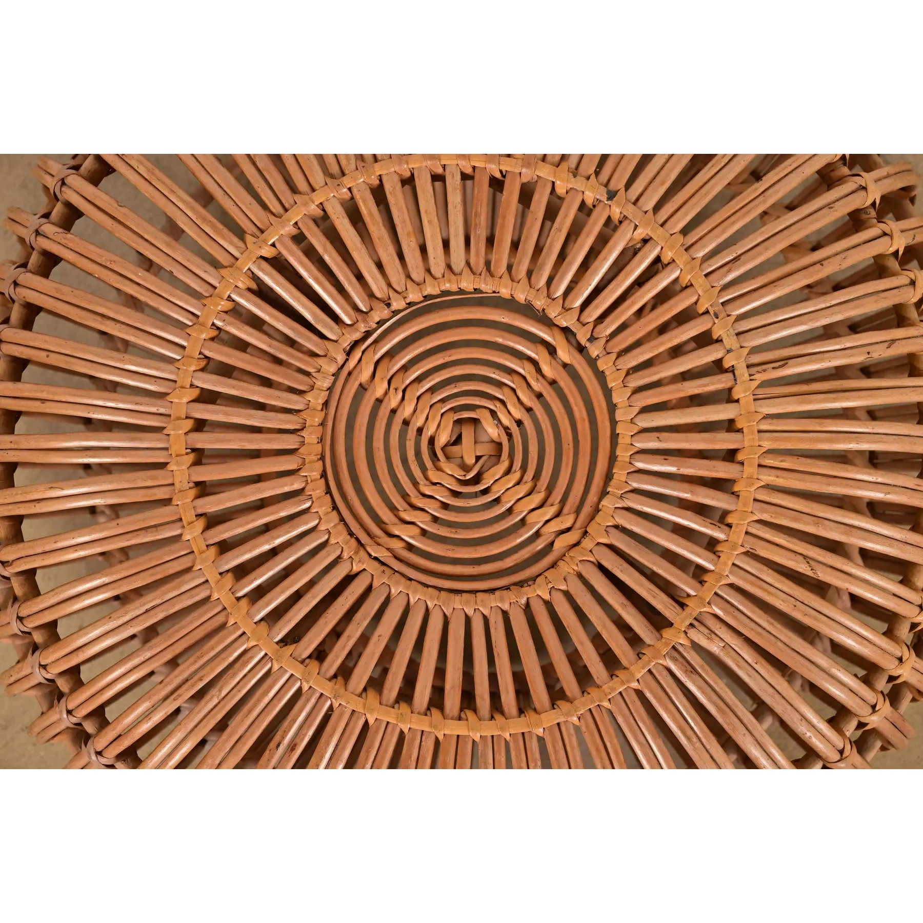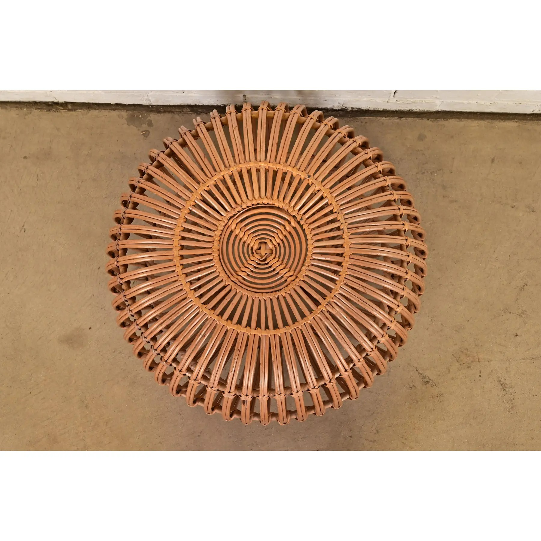 A gorgeous mid-century Organic Modern bent rattan pouf ottoman, footstool, or side table