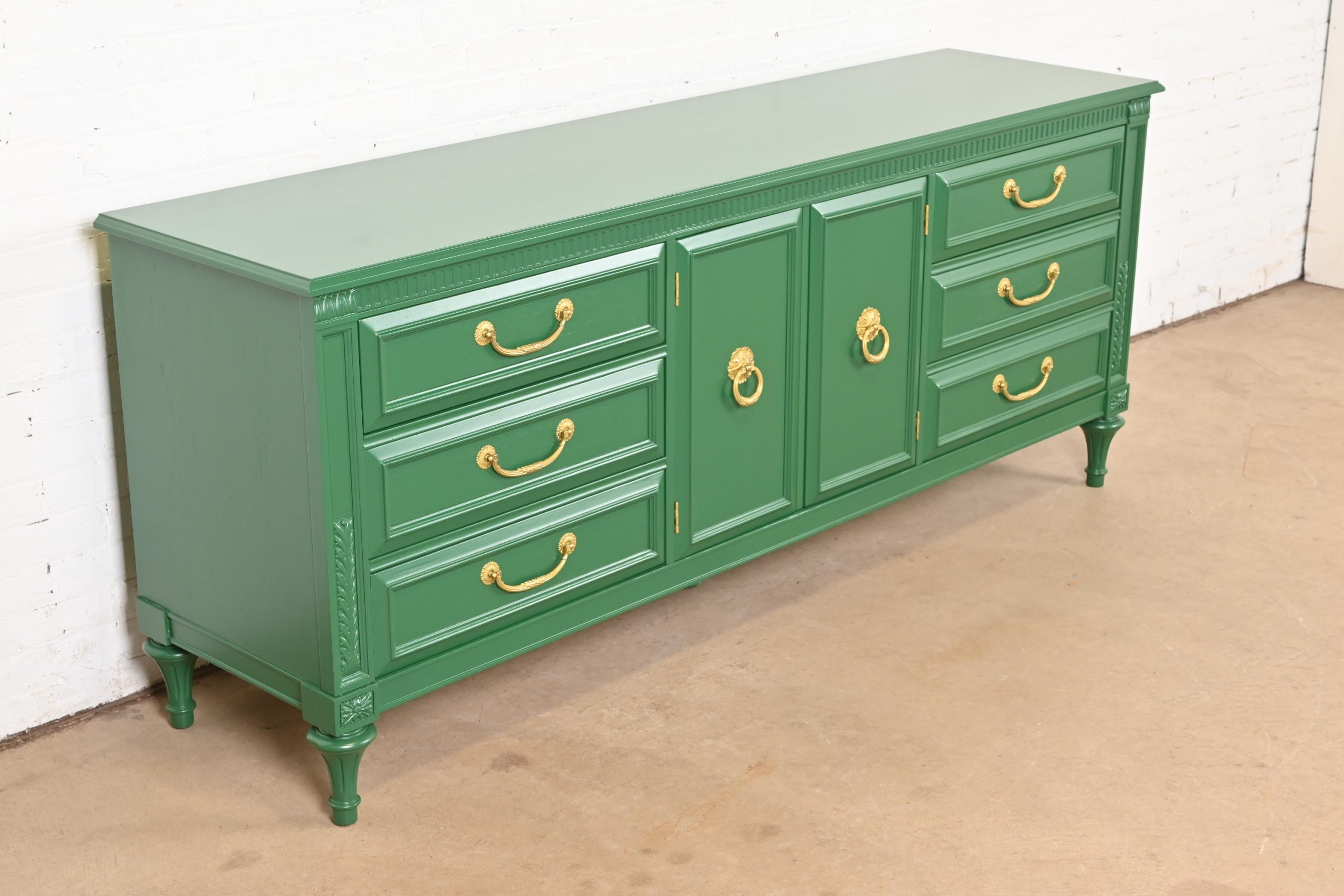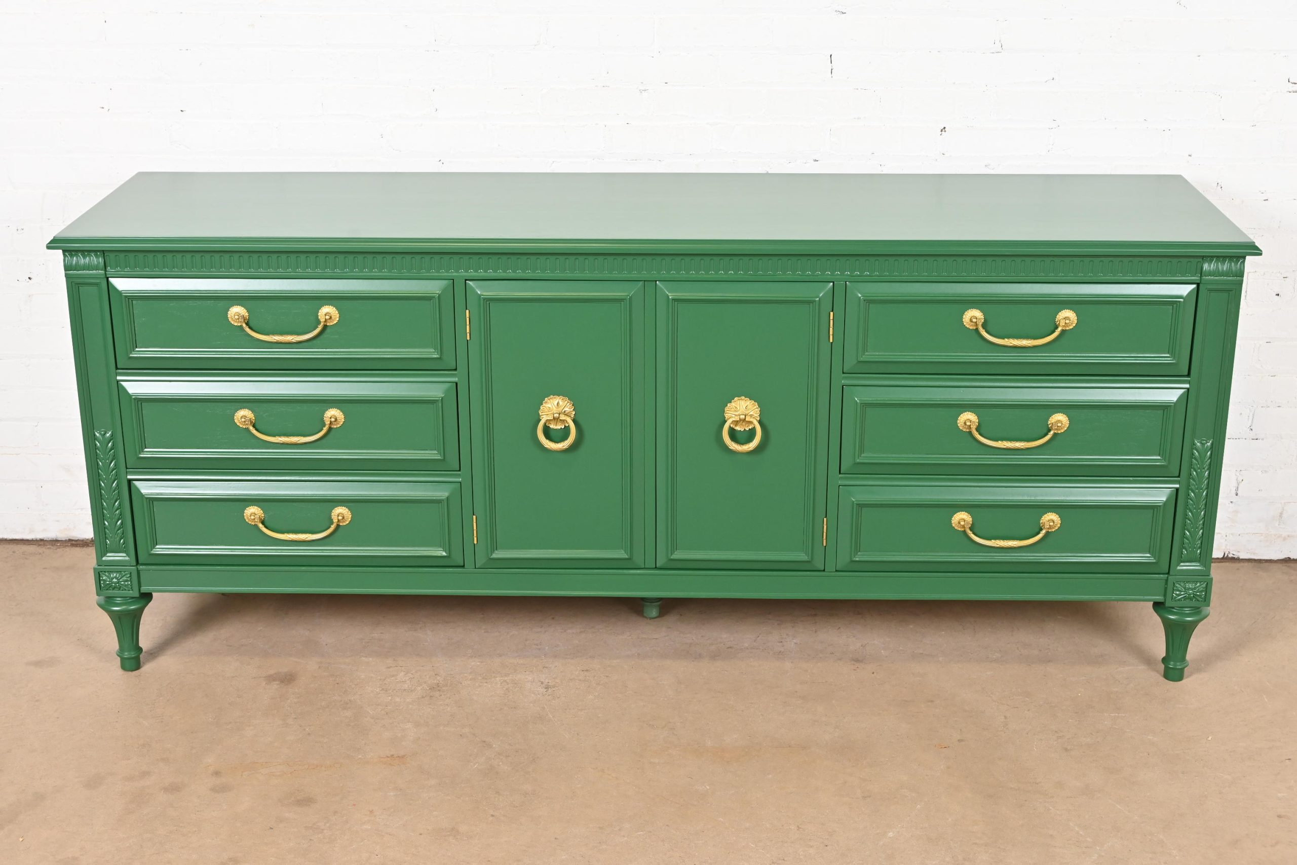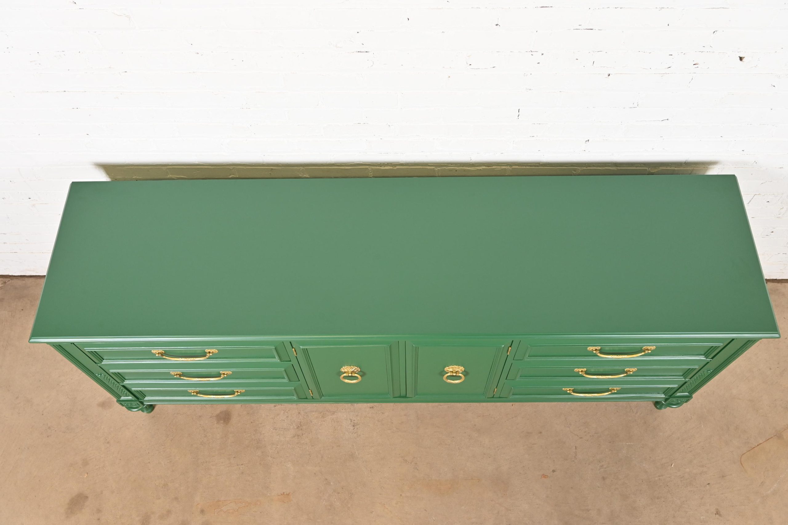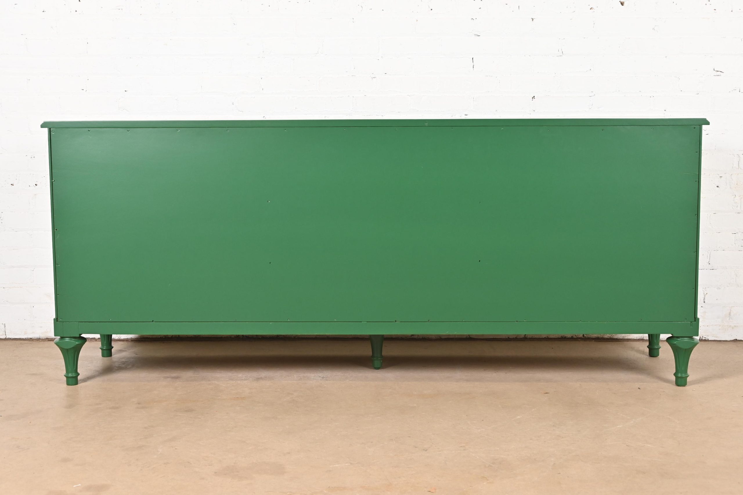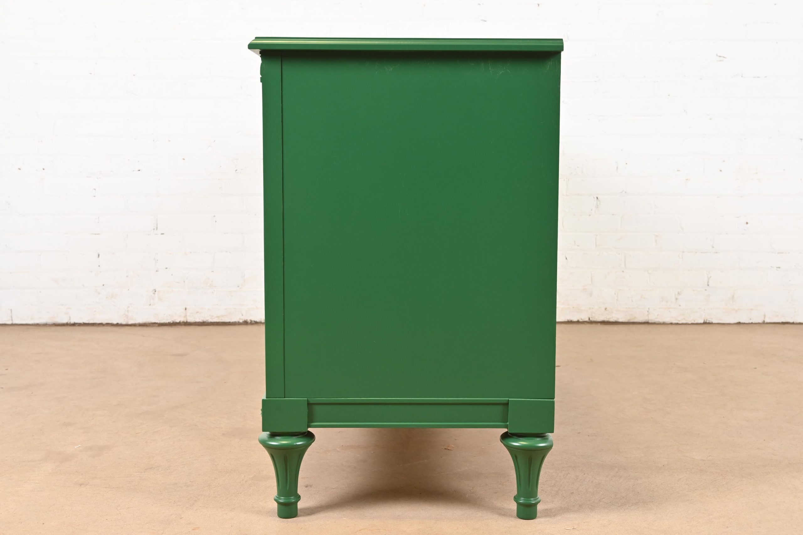 French Regency Louis XVI Green Lacquered Long Dresser or Credenza by Hickory, Newly Refinished