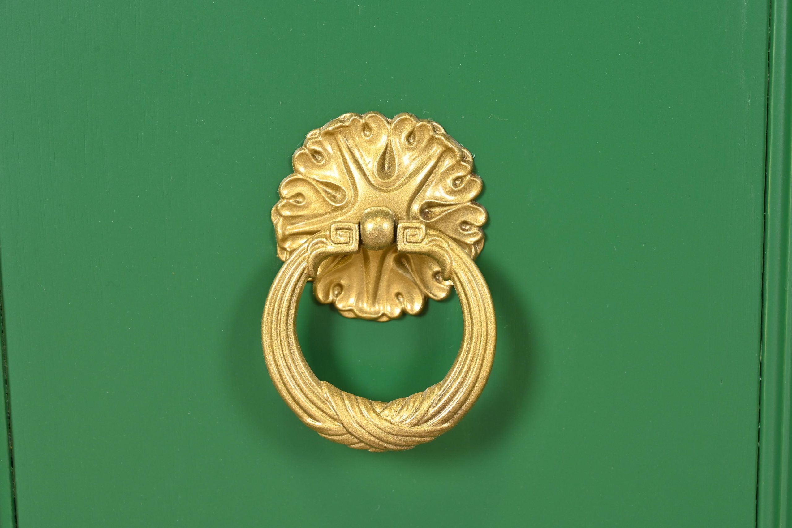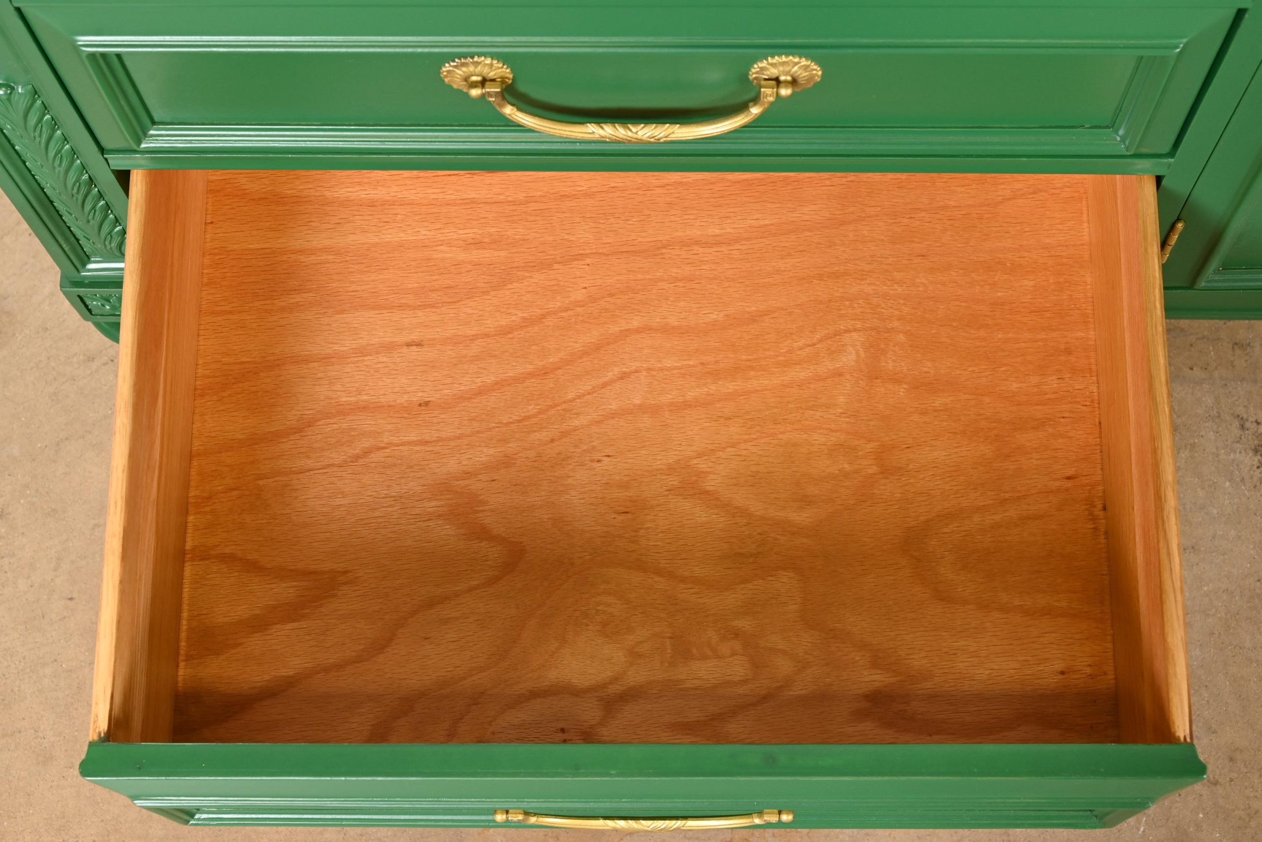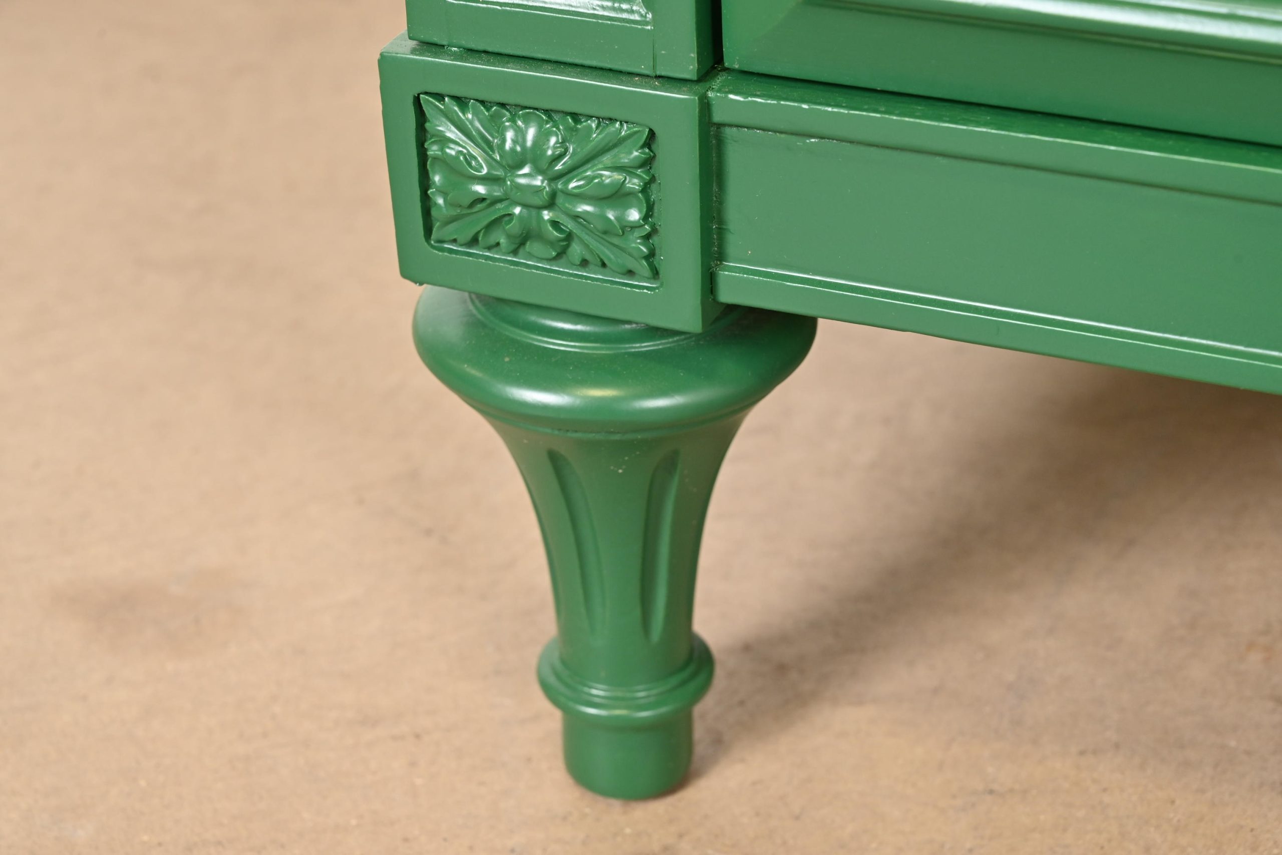 Green lacquered carved walnut, with original brass hardware.