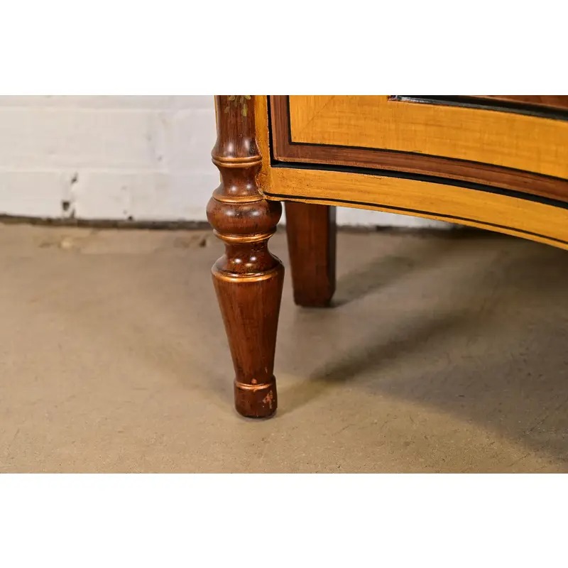 Inlaid flame mahogany and satinwood, with hand painted and gold gilt details, and original brass hardware.