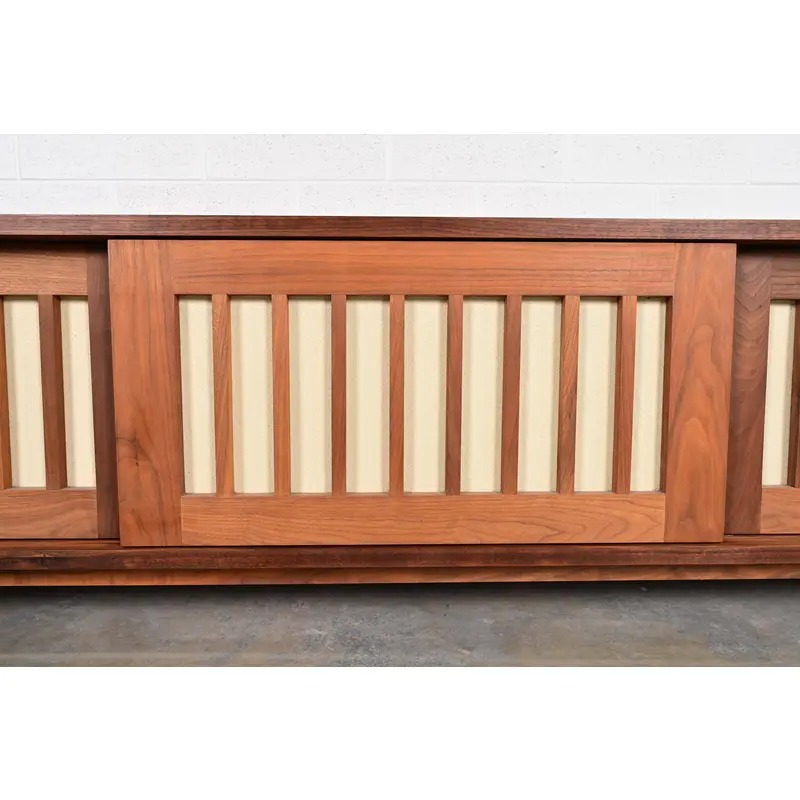 Gorgeous sculpted walnut, with grasscloth-backed sliding doors. Interior shelves are removable and adjustable.