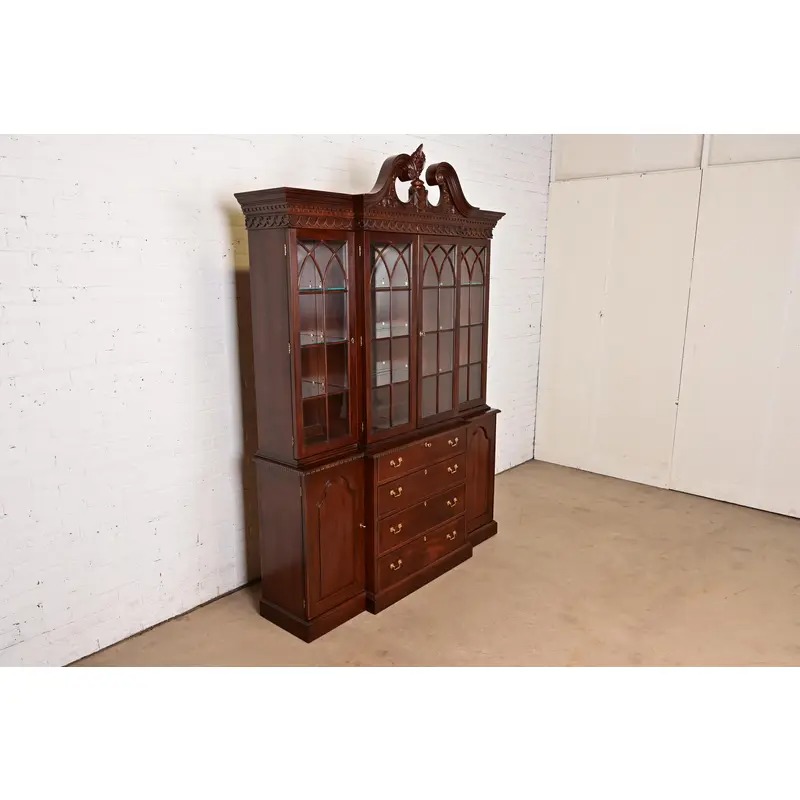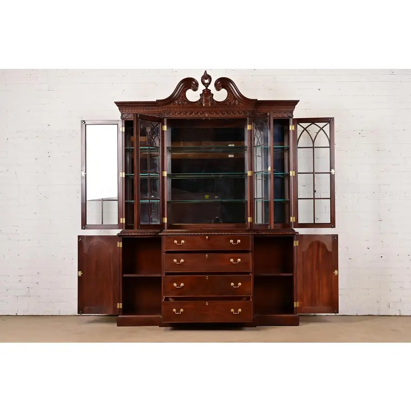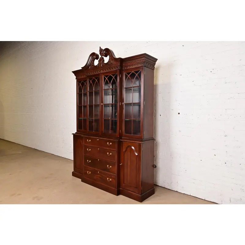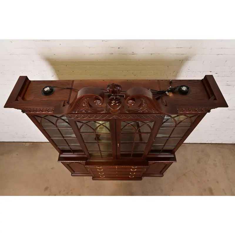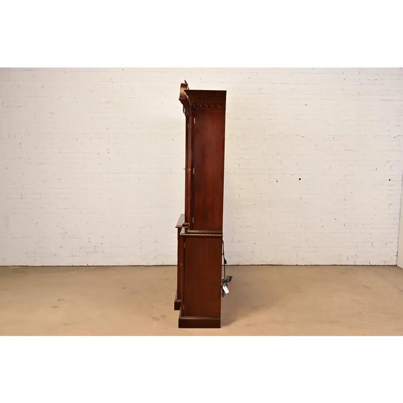 Georgian Carved Mahogany Lighted Breakfront Bookcase Cabinet by Craftique