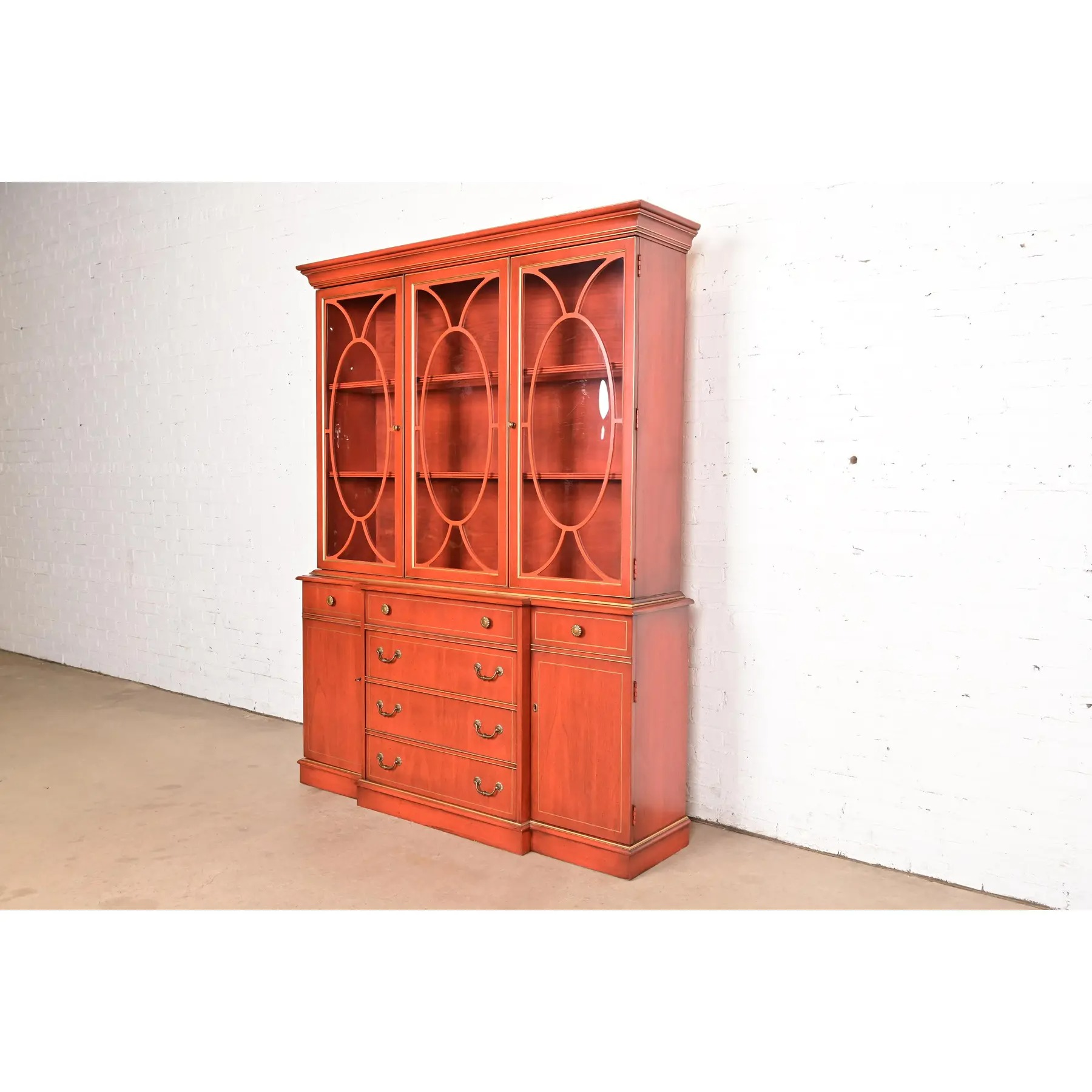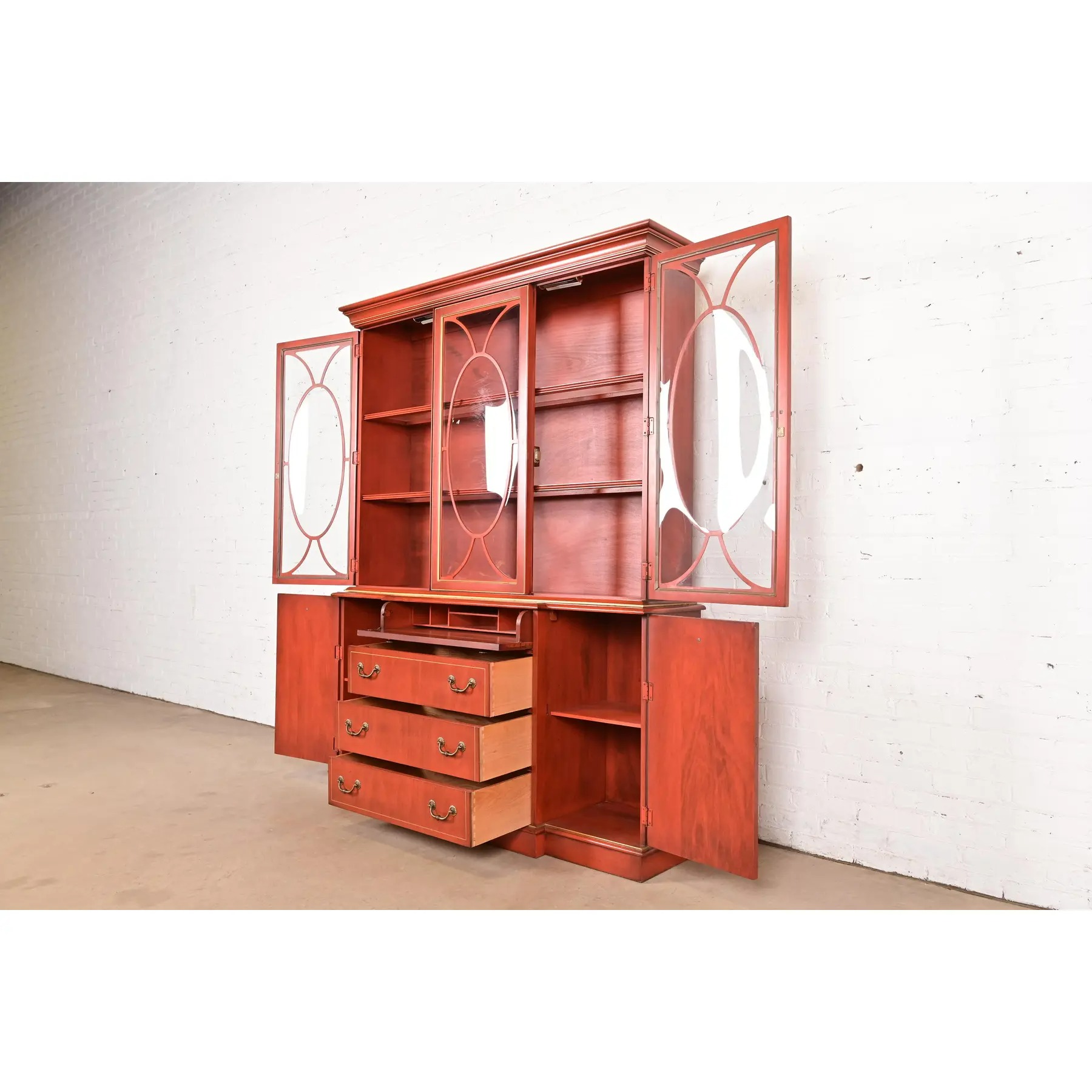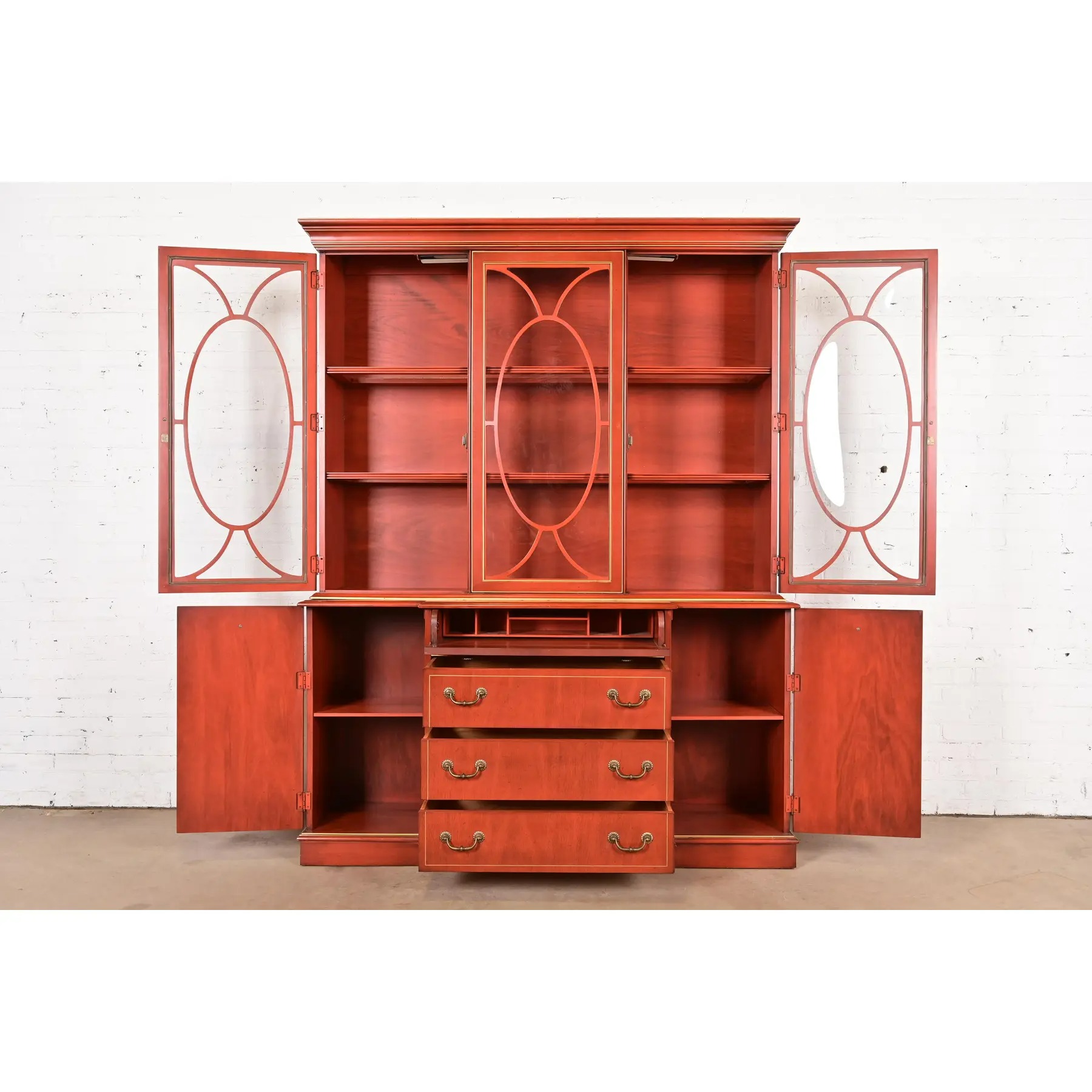 Georgian Red Lacquered Lighted Breakfront Bookcase Cabinet With Drop Front Secretary Desk by Jasper Cabinet Co.