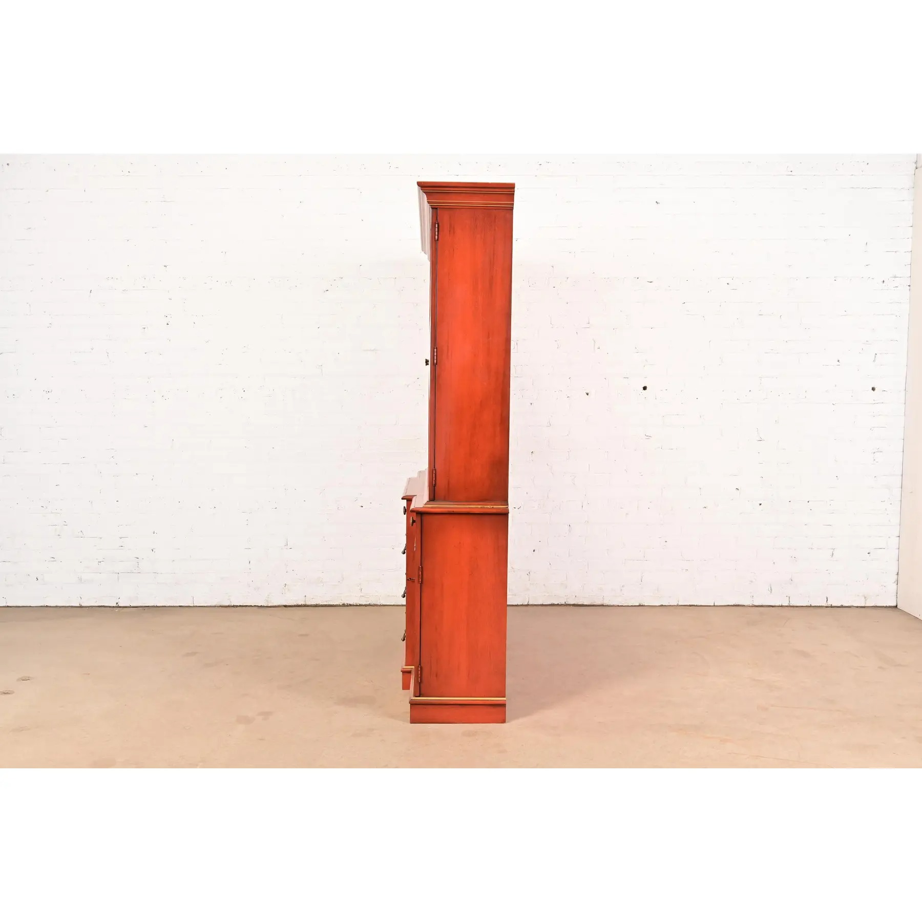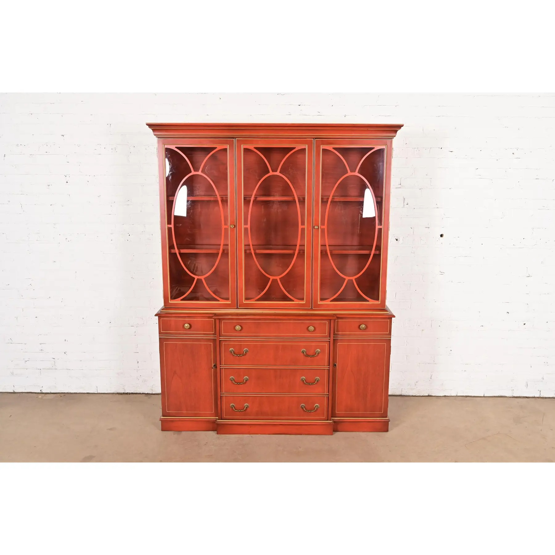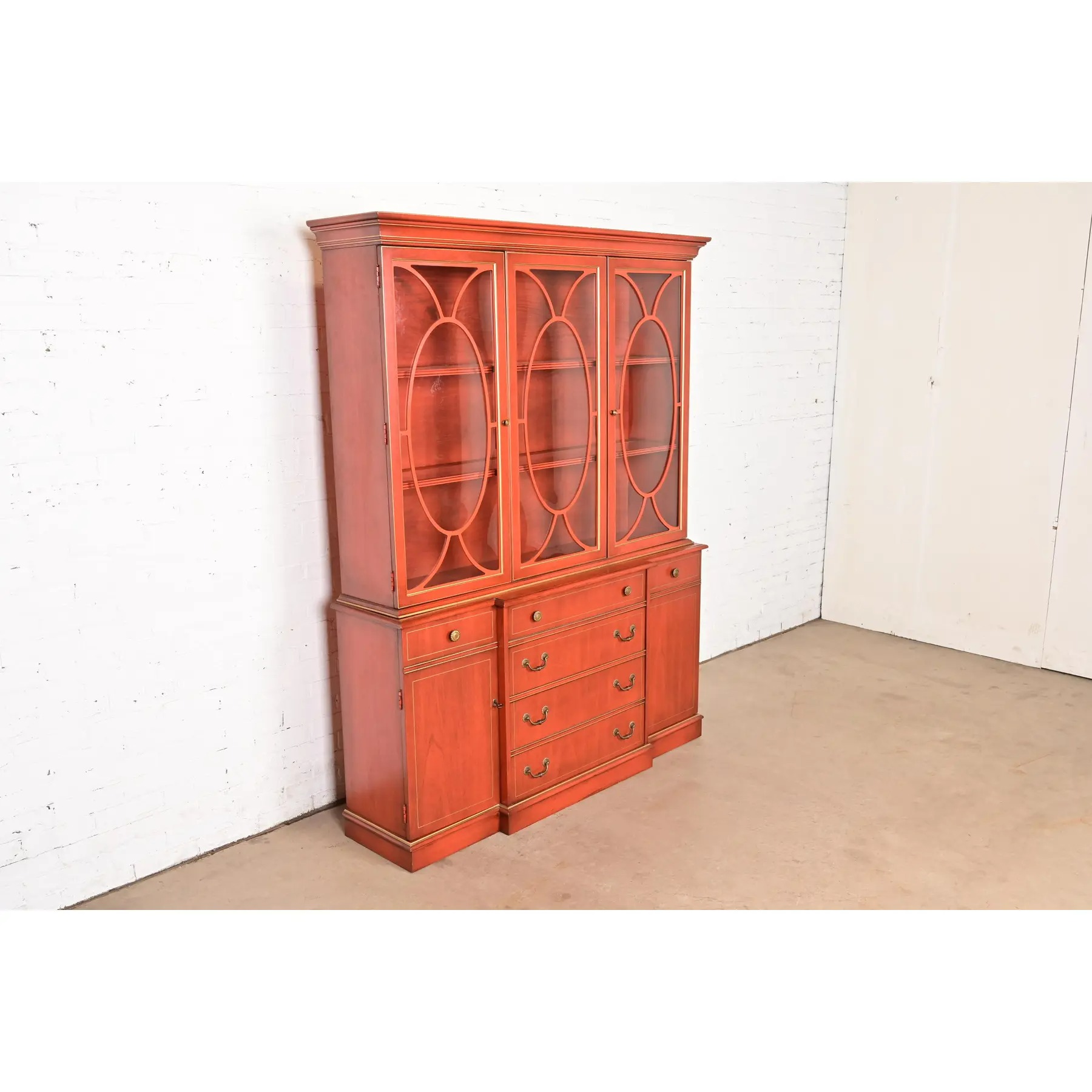 Georgian Red Lacquered Lighted Breakfront Bookcase Cabinet With Drop Front Secretary Desk by Jasper Cabinet Co.