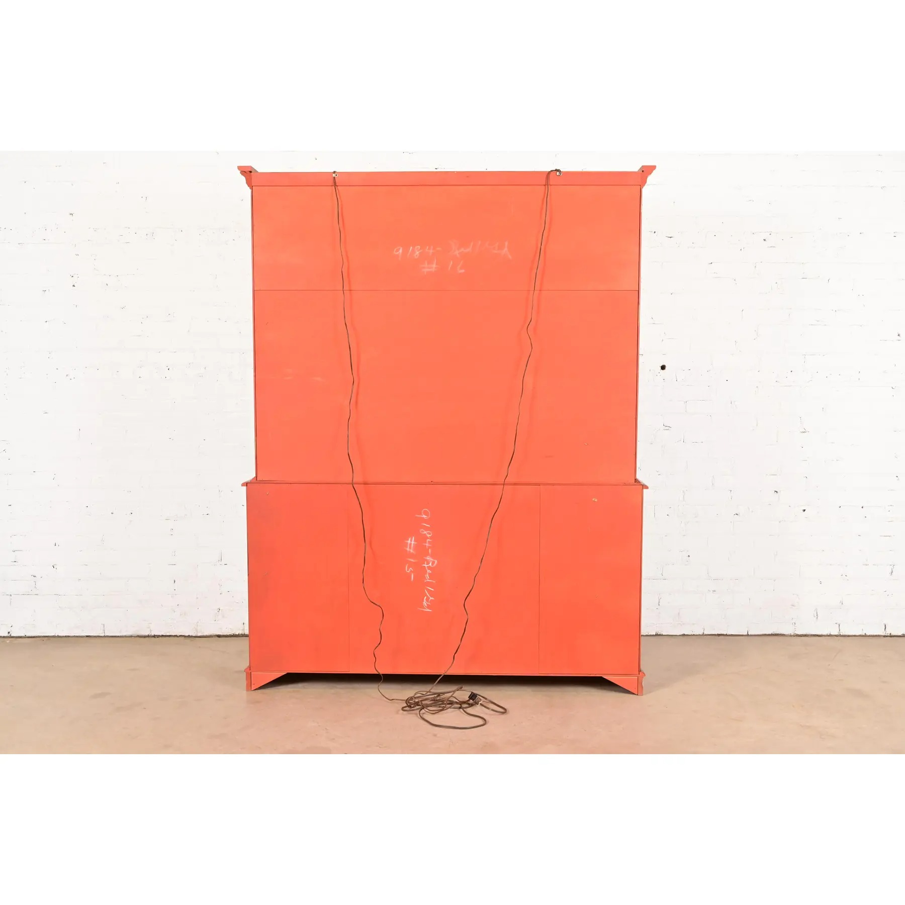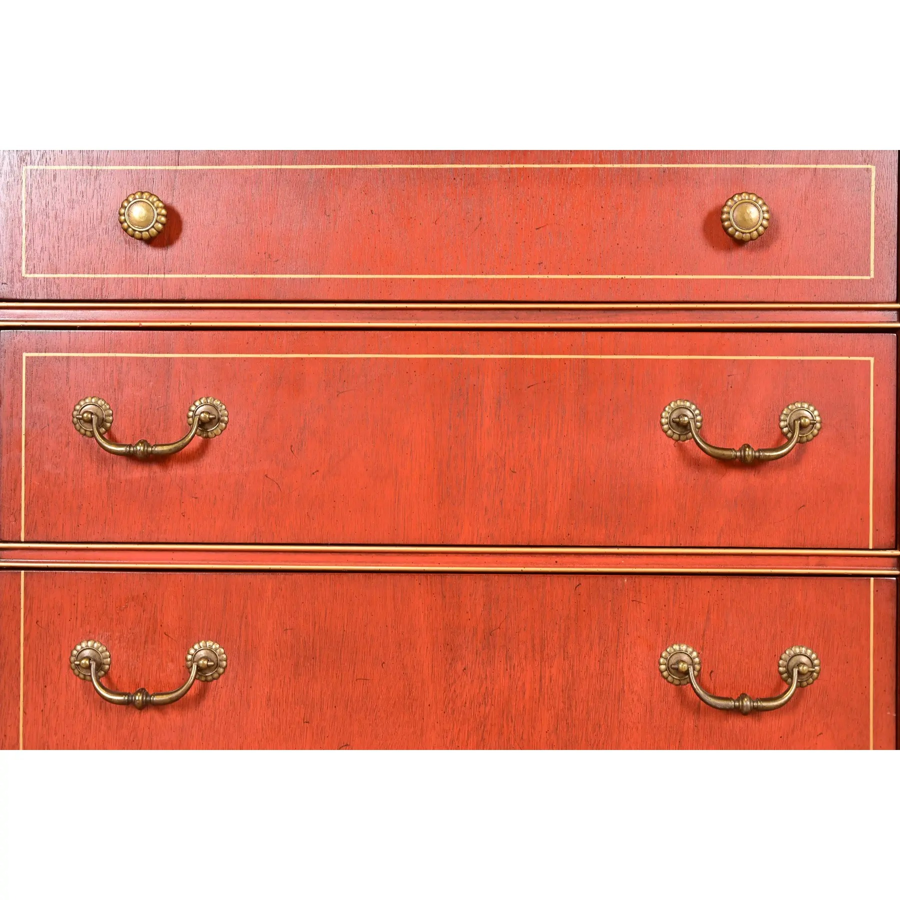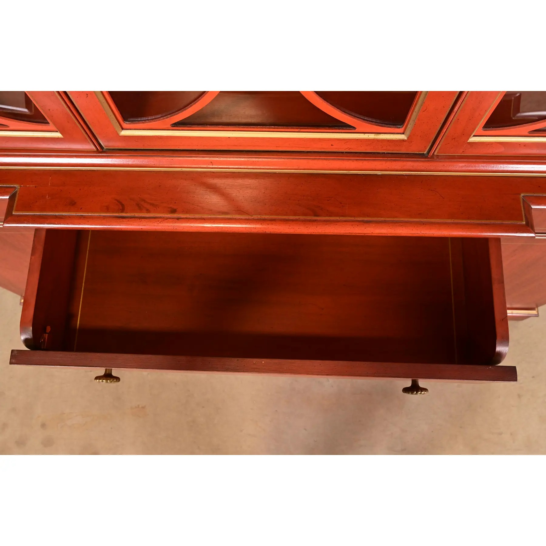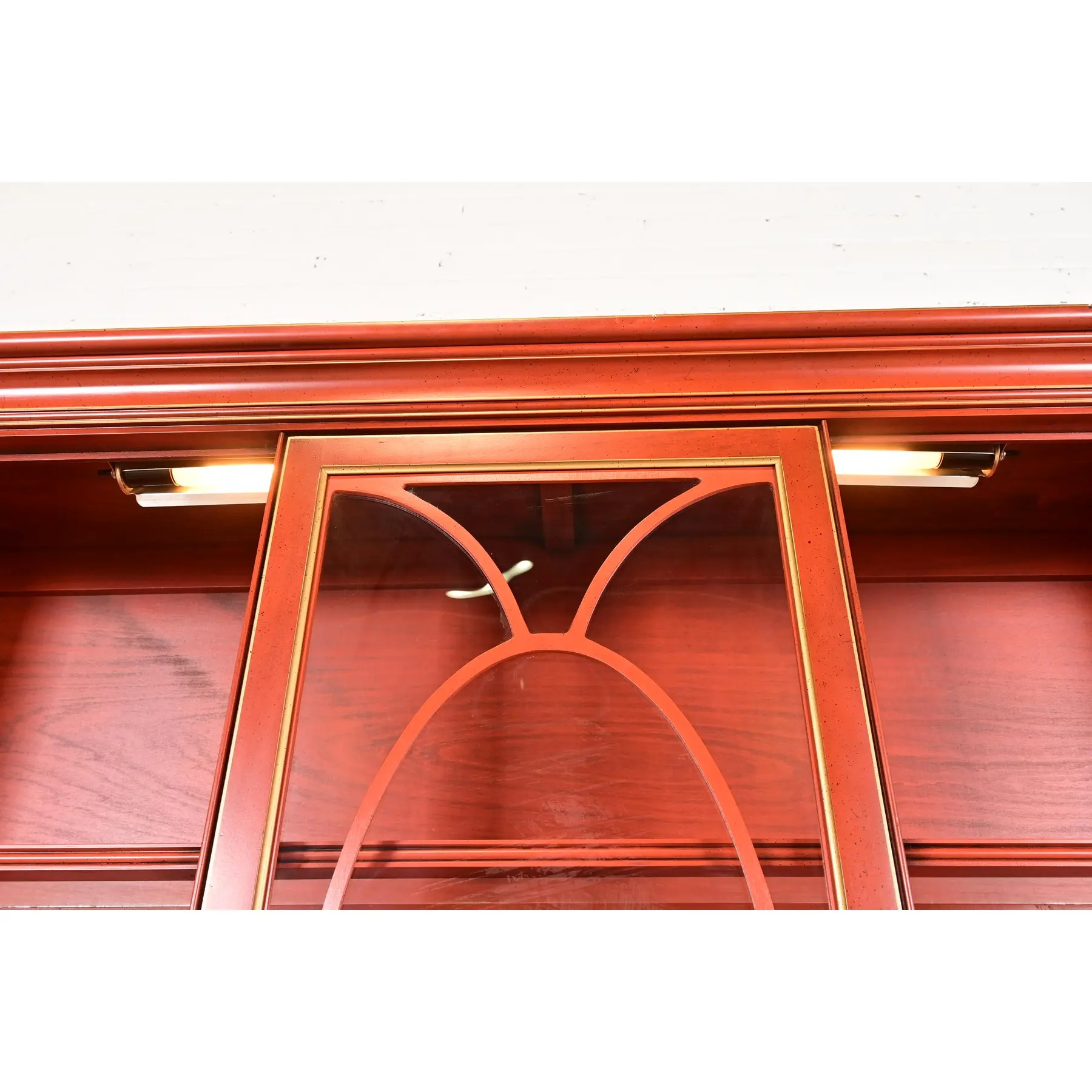 Carved red lacquered cherry wood, with gold gilt trim, mullioned glass front doors, and original brass hardware. Cabinet locks, and original key is included.