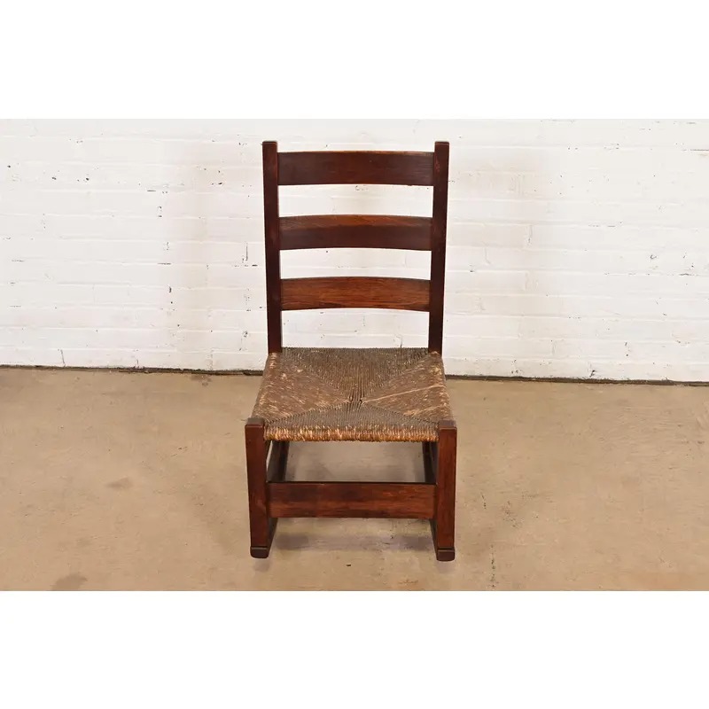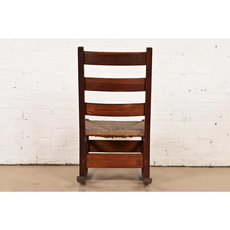 Gustav Stickley Antique Mission Oak Arts & Crafts Ladder Back Rocking Chair With Rush Seat, Circa 1910