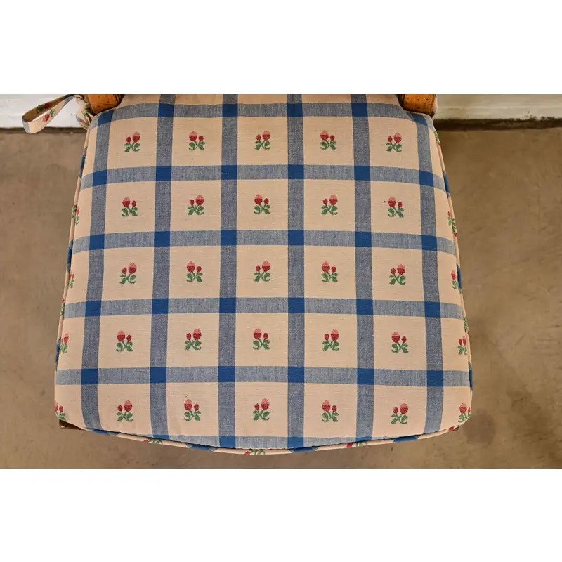 Carved solid maple frames, with rush seats and removable upholstered seat cushions.