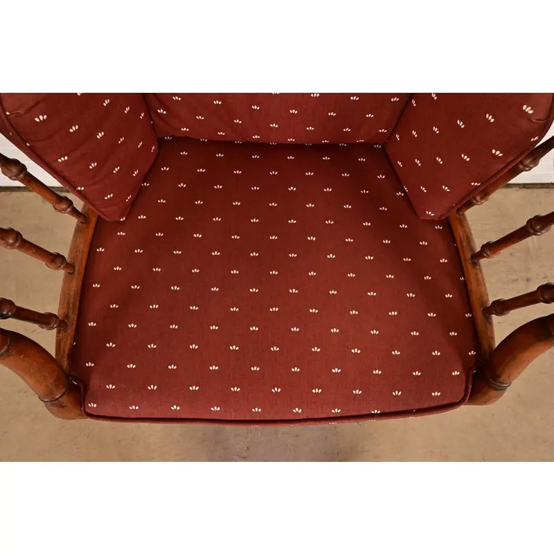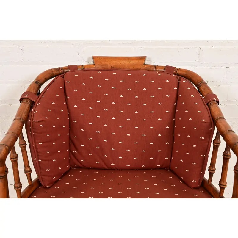 Carved bamboo form walnut frame, with cane seat, and removable upholstered seat and back cushions.