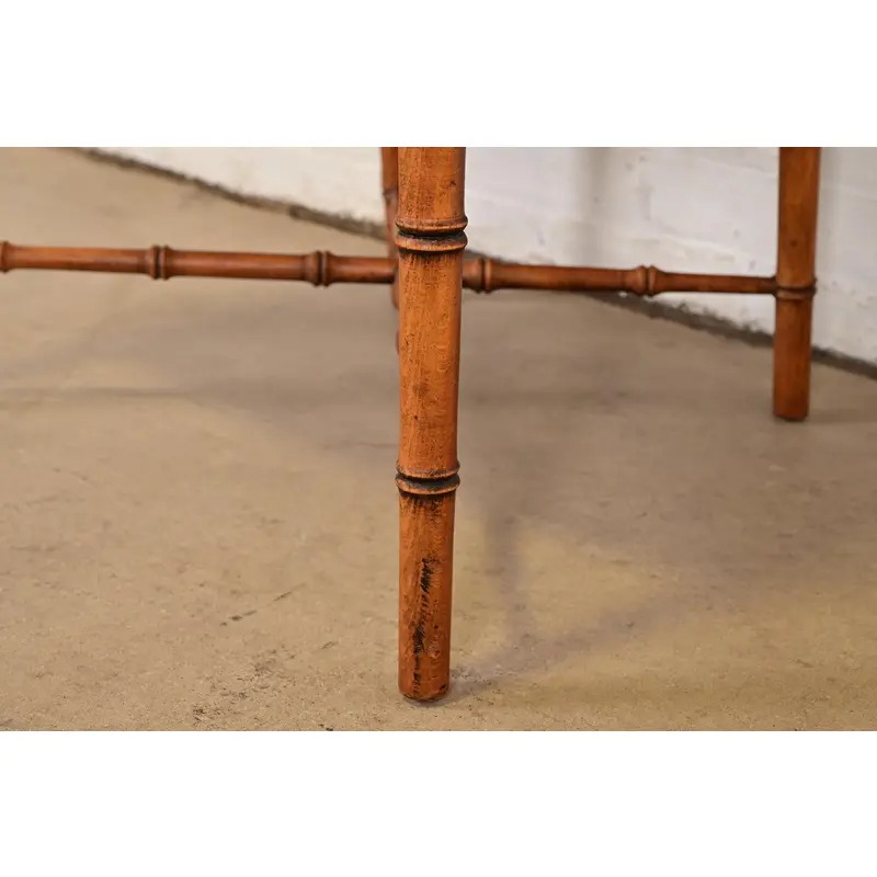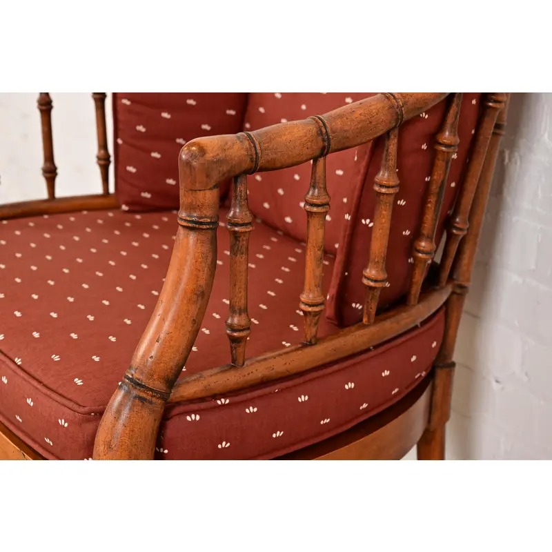 Carved bamboo form walnut frames, with cane seats, and removable upholstered seat and back cushions.