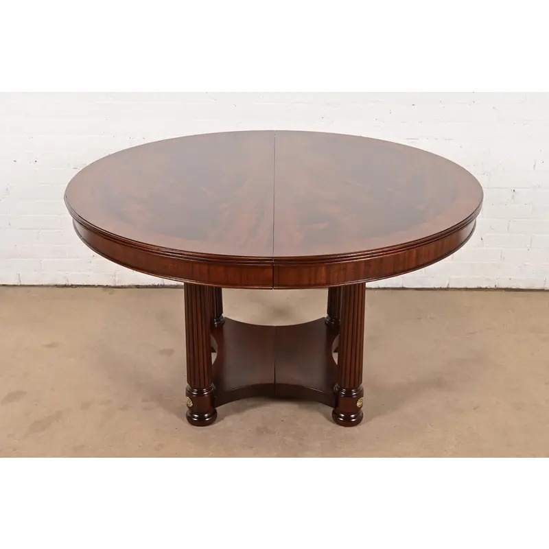 Henkel Harris Empire Banded Flame Mahogany Pedestal Extension Dining Table, Newly Refinished