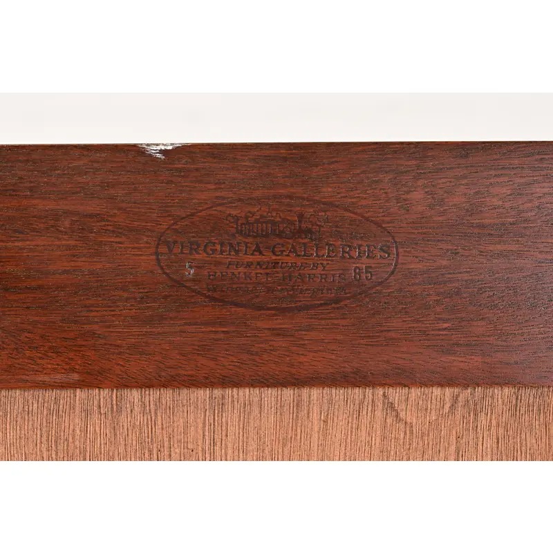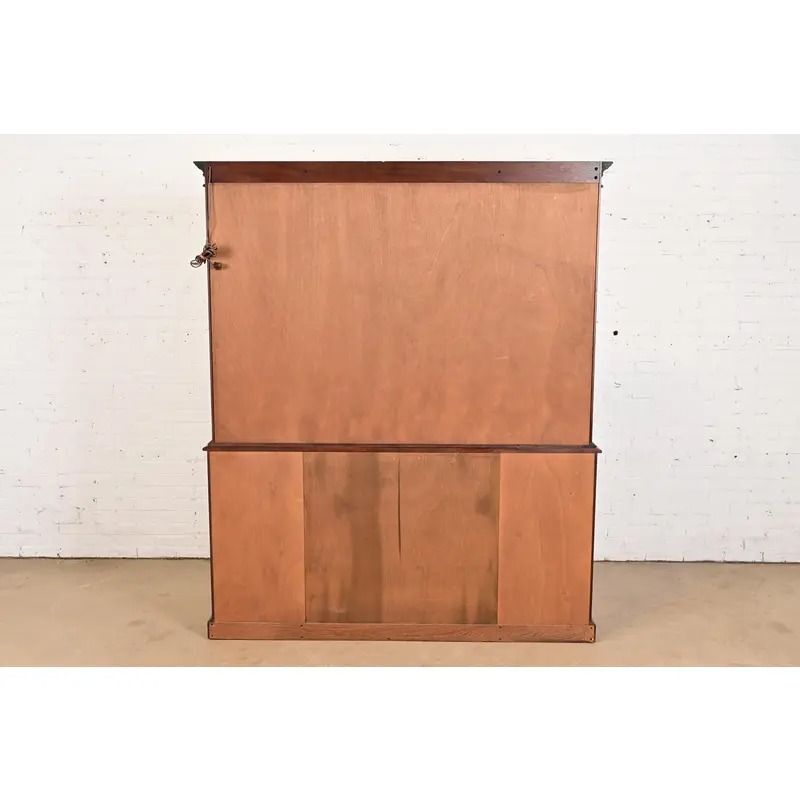 Mahogany, with satinwood banding, mullioned glass front doors, and original brass hardware. Interior shelves are adjustable. Cabinet locks, and key is included.