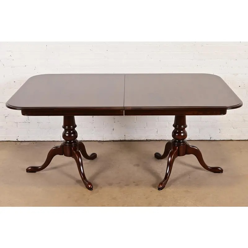 An exceptional Georgian, Chippendale, or Queen Anne style solid cherry wood double pedestal extension dining table