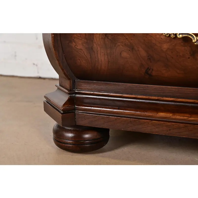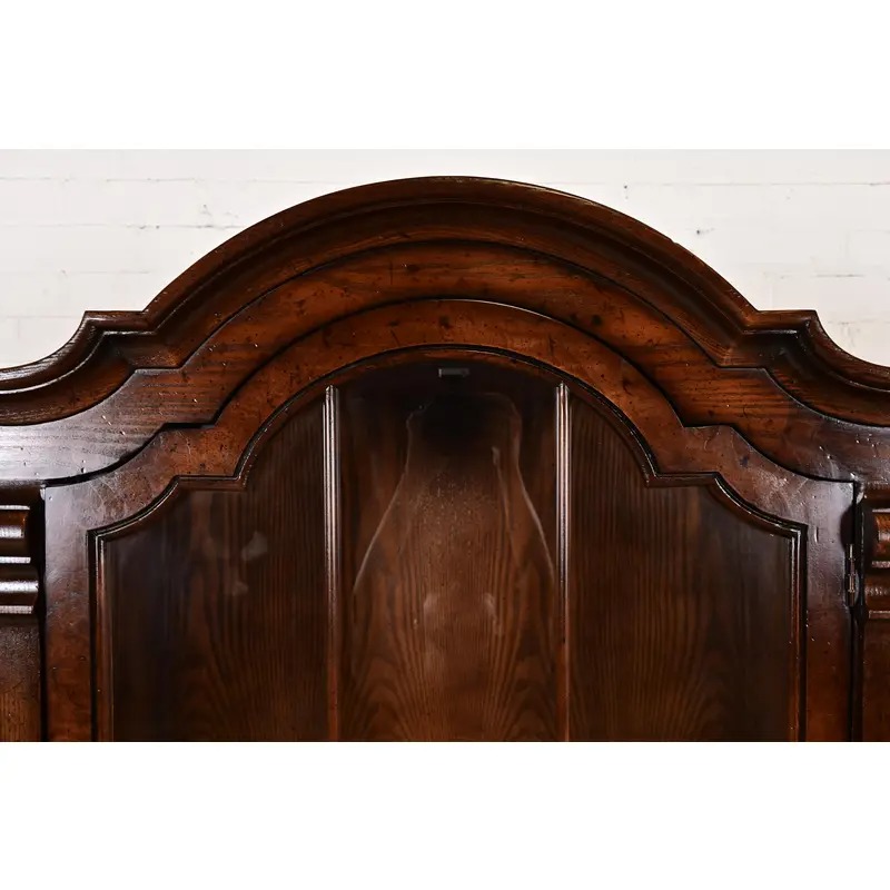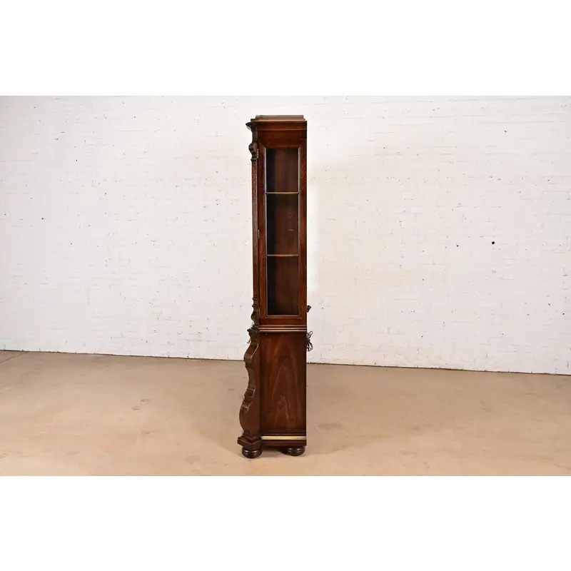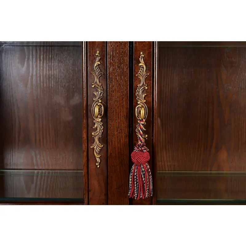Carved oak and burl wood, with glass front doors and sides, and original brass hardware. Shelves are adjustable