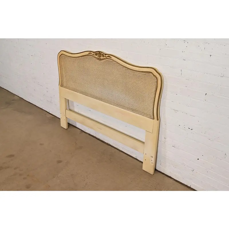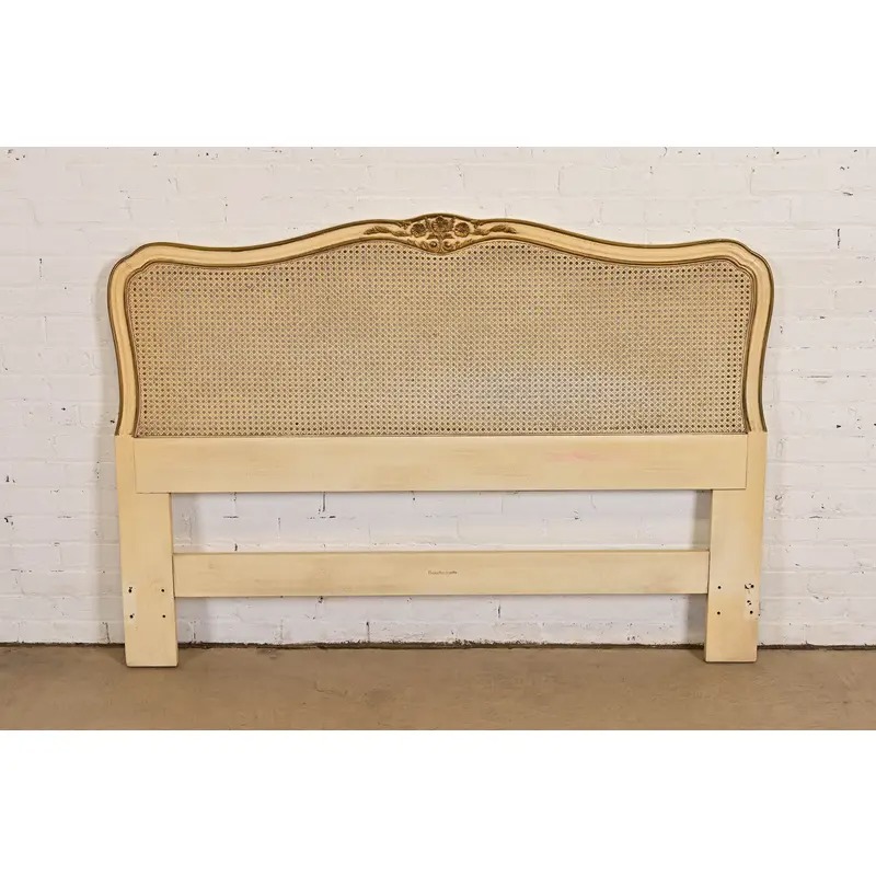 Carved cream lacquered walnut, with gold gilt details, and caned panel.