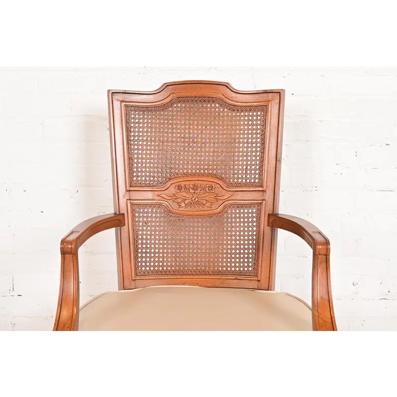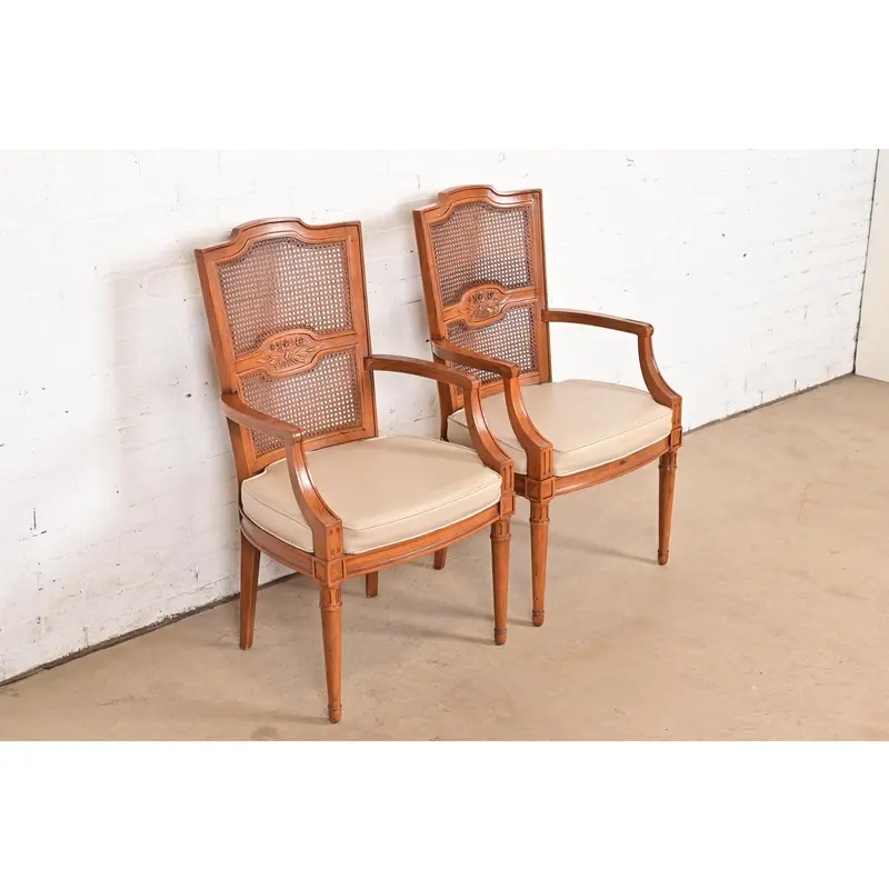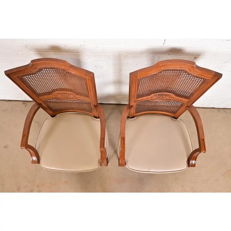 Henredon French Regency Louis XVI Carved Walnut Cane Back Armchairs or Dining Captain Chairs, Pair