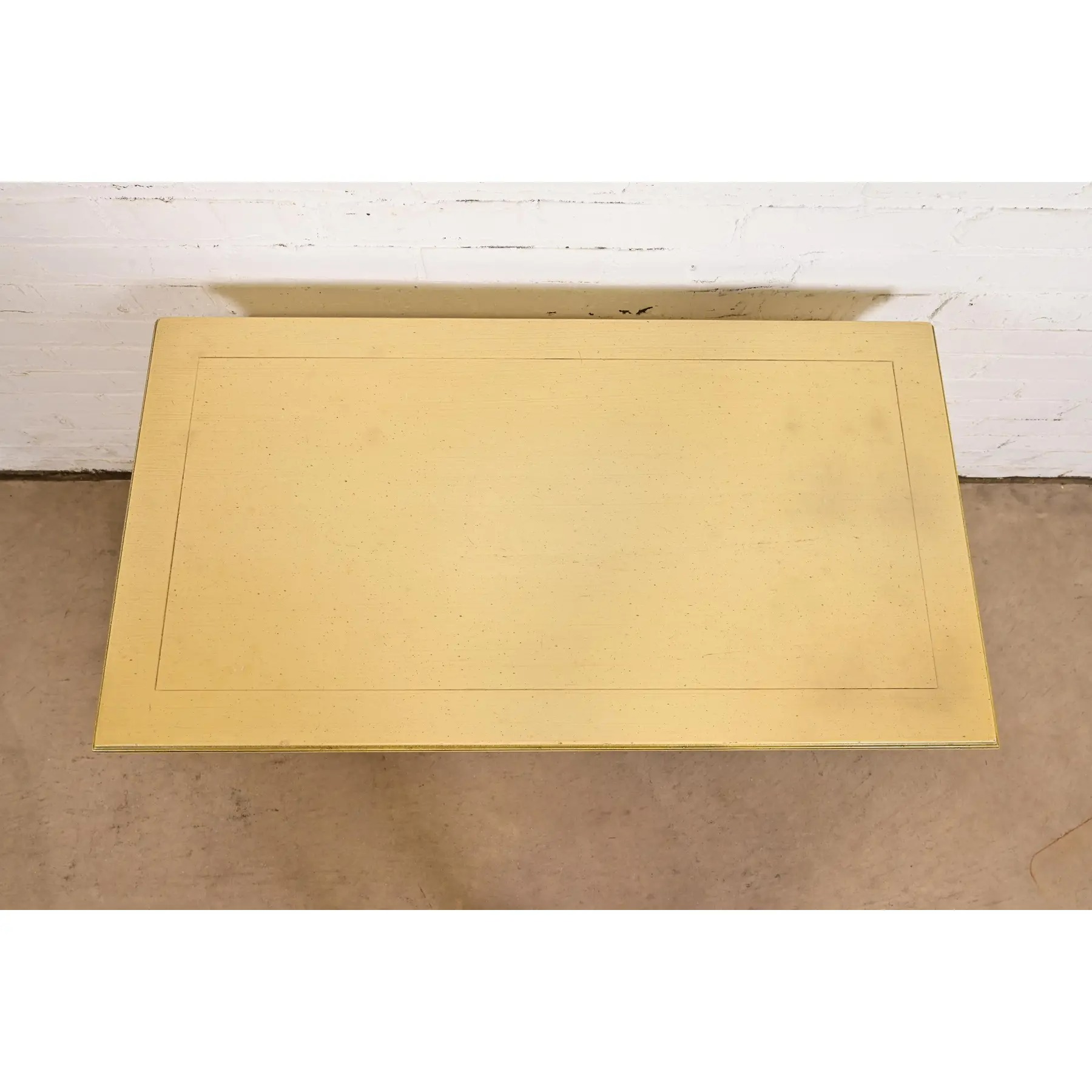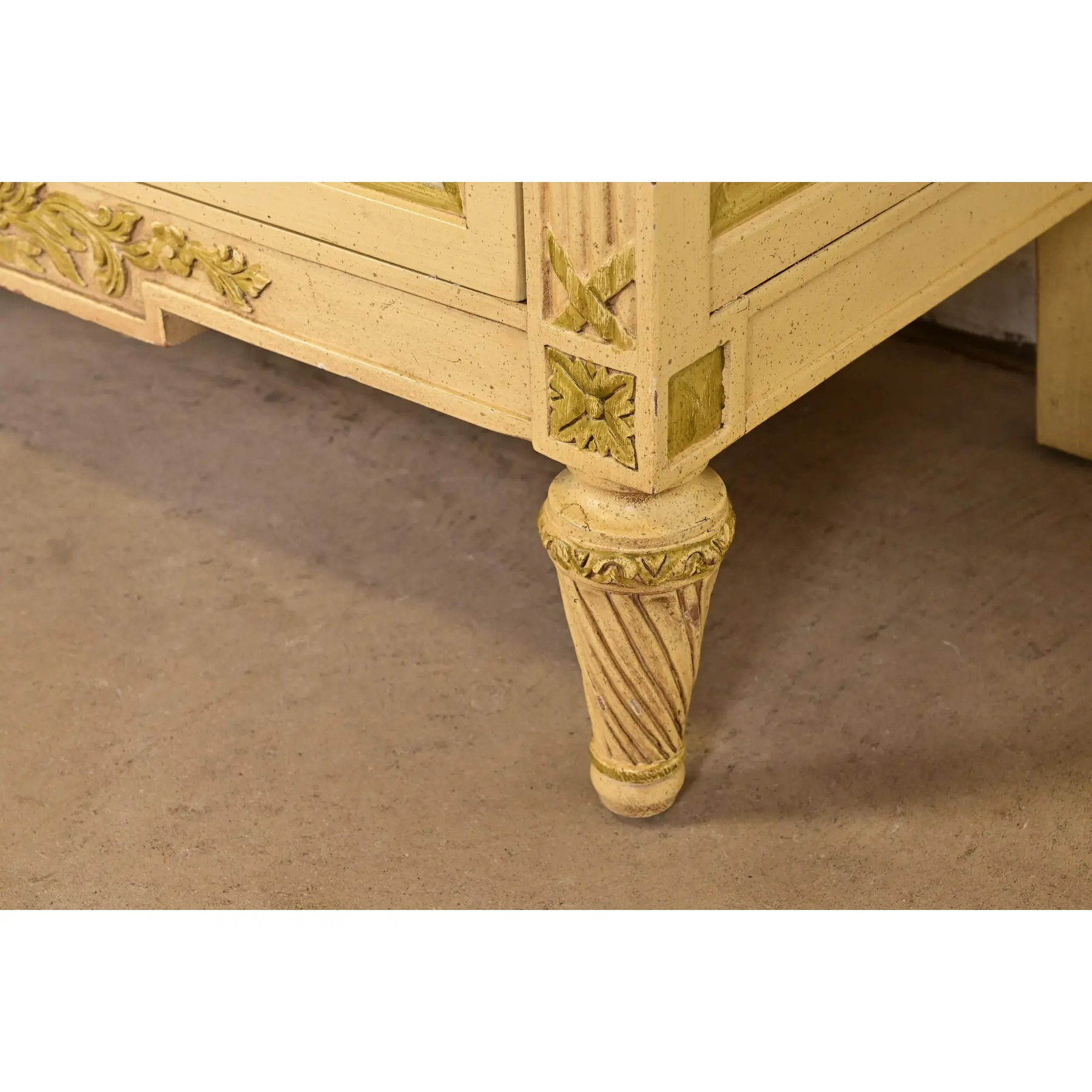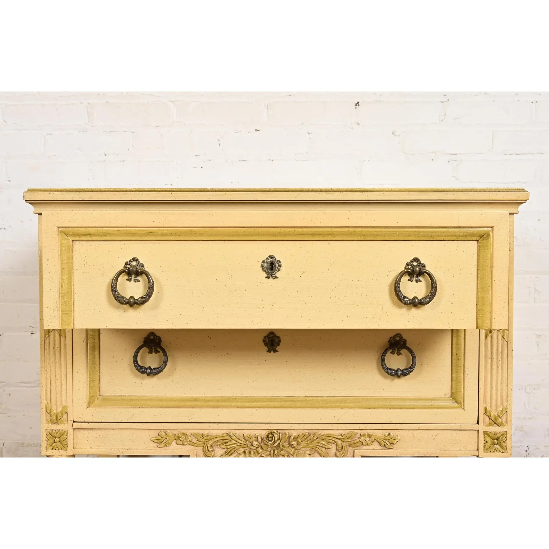 Carved walnut in original cream lacquered finish, with olive green trim and accents, and original brass hardware.