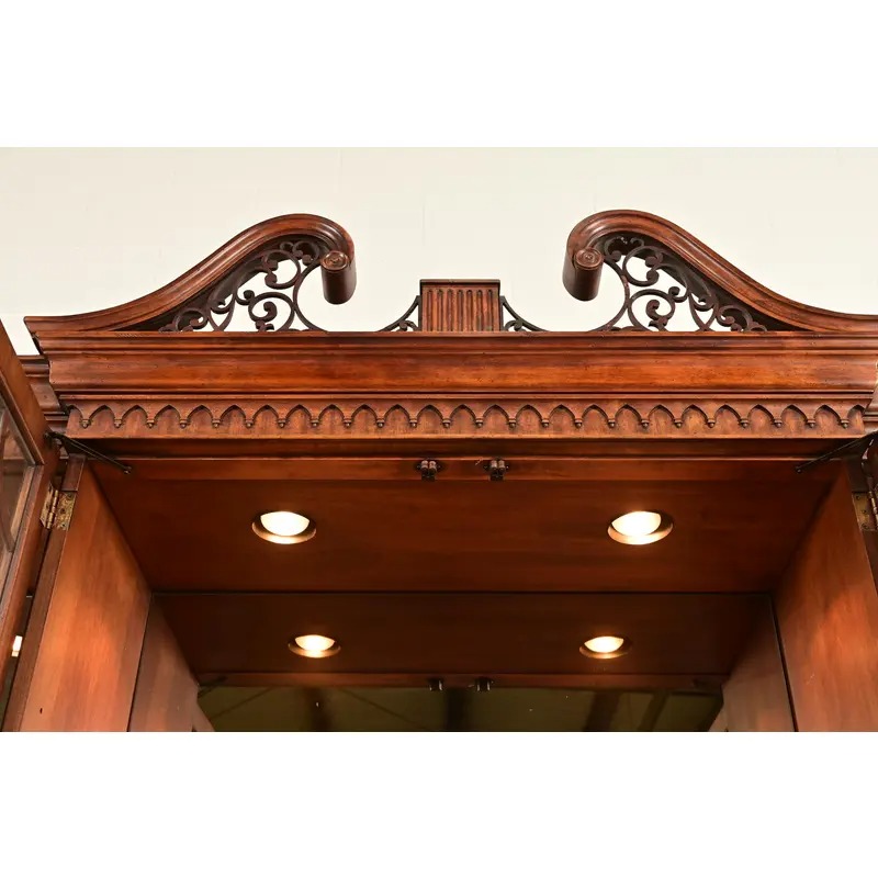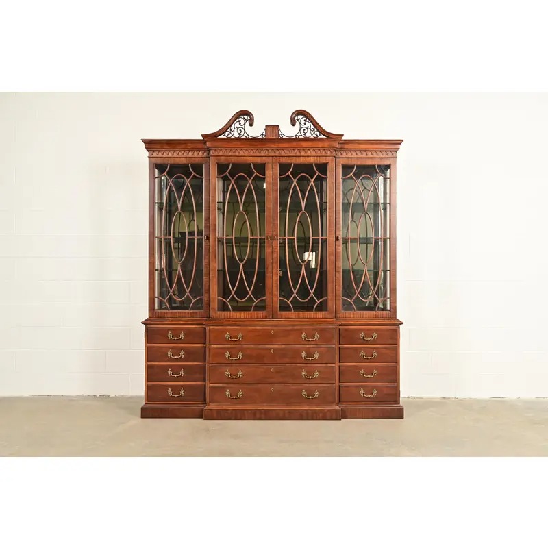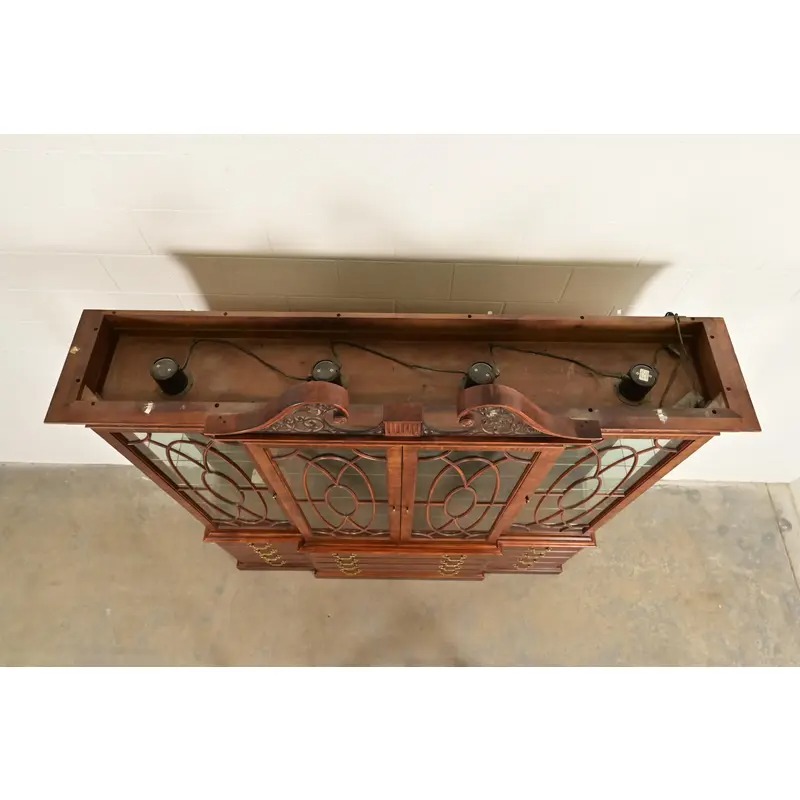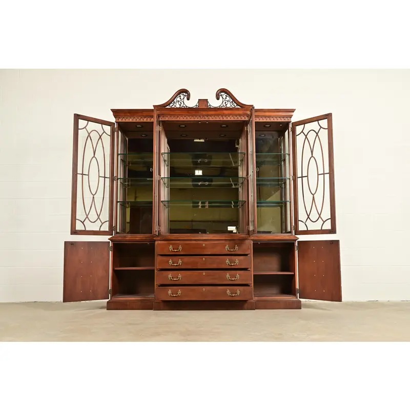 A gorgeous Georgian or Chippendale style lighted breakfront bookcase or dining cabinet